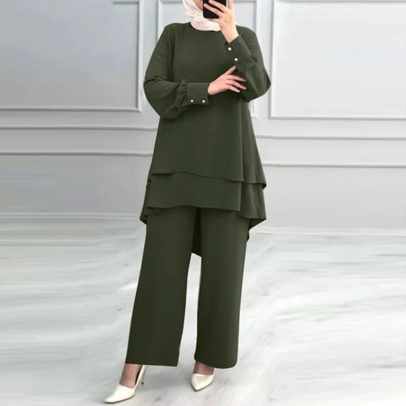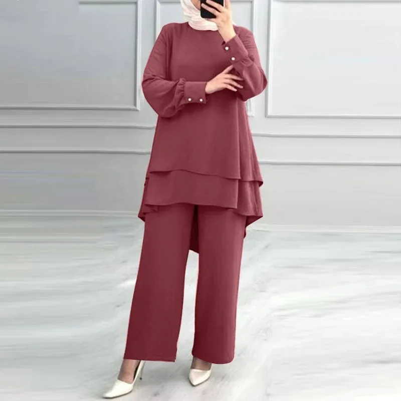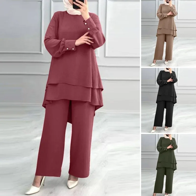 Women's Summer Modest Sets Elegant Casual Style Double Layer Dress with Wide Leg Pants Pure Color Muslim Abaya
