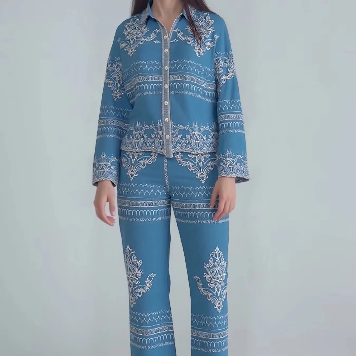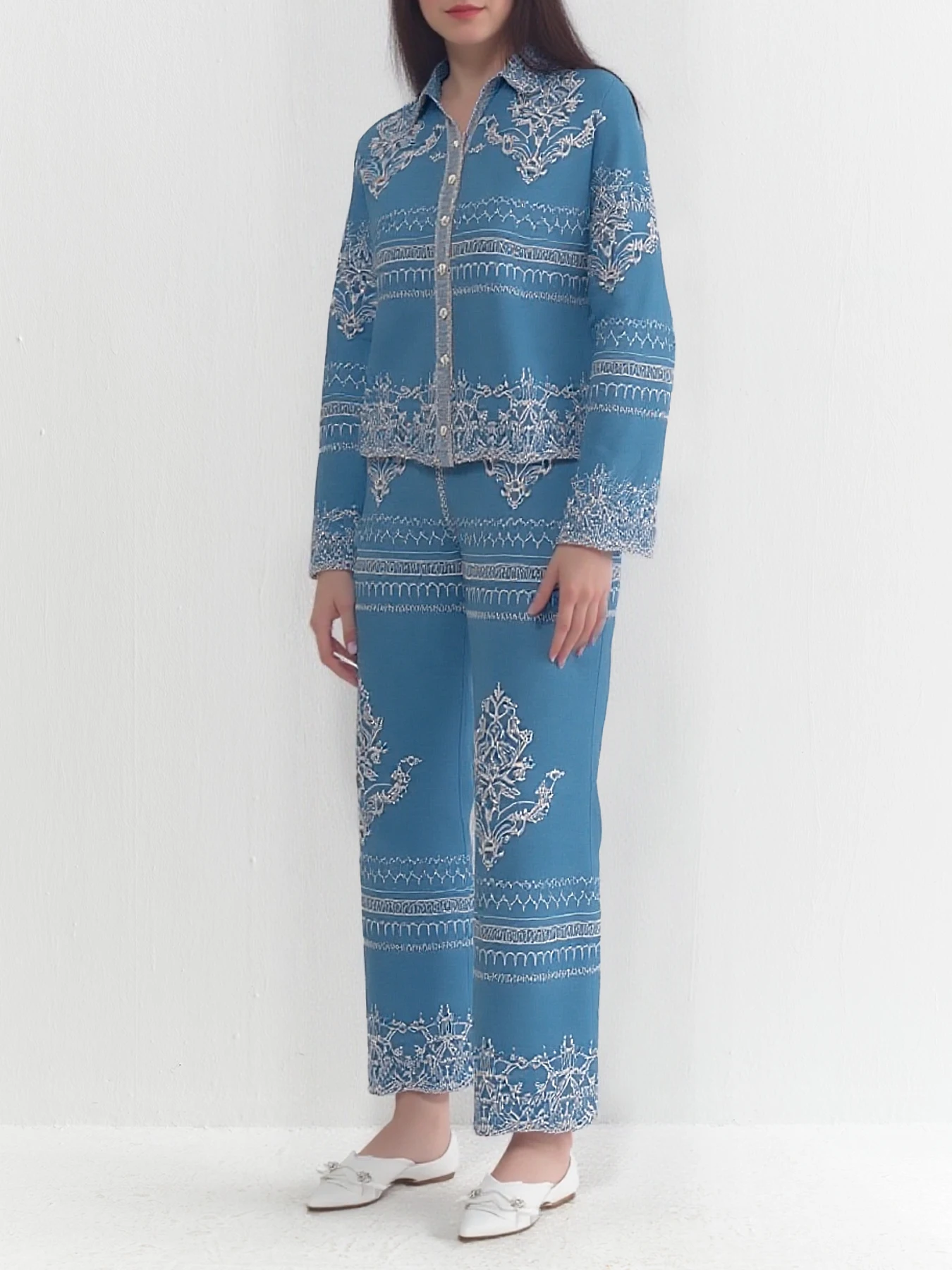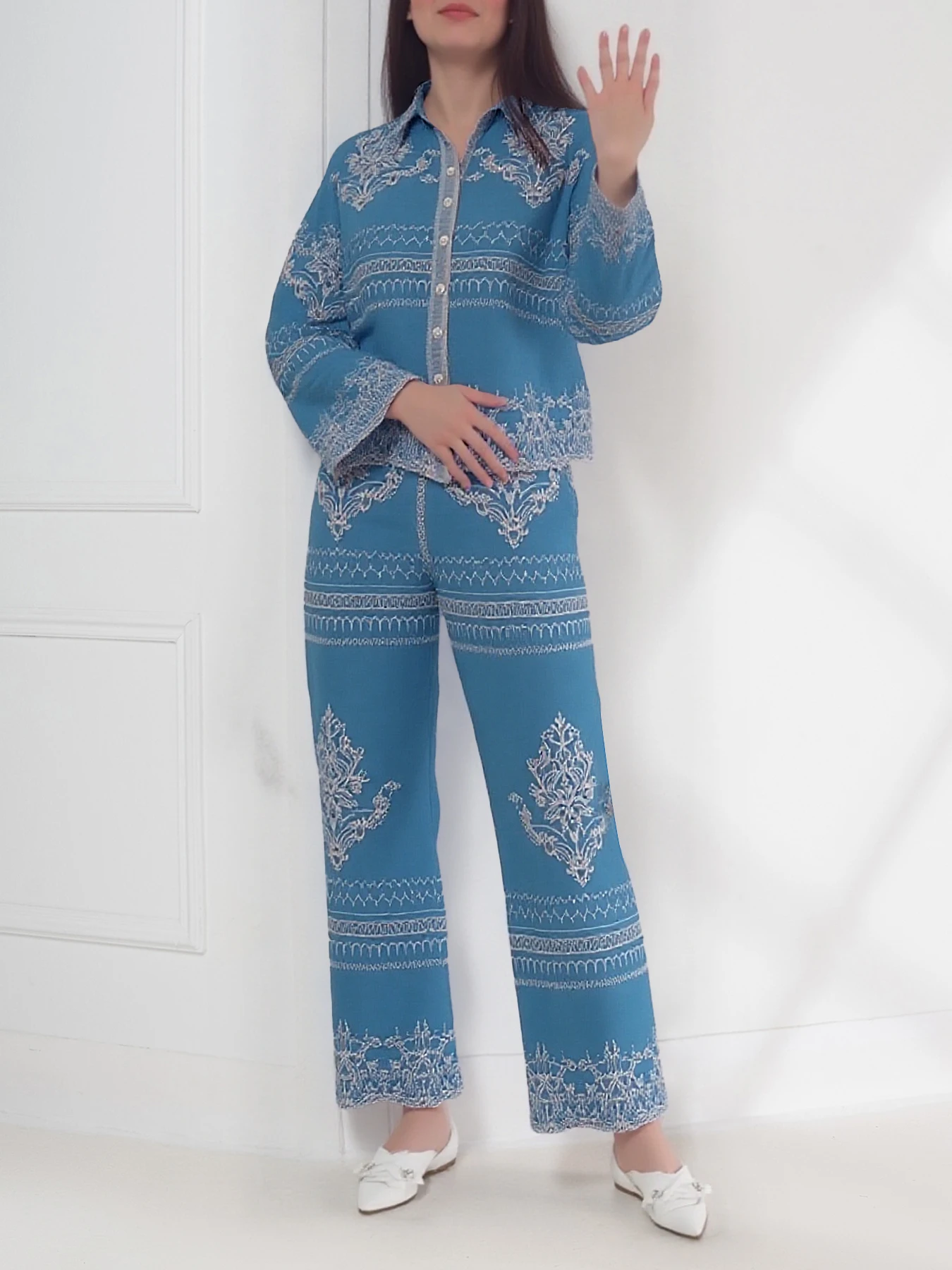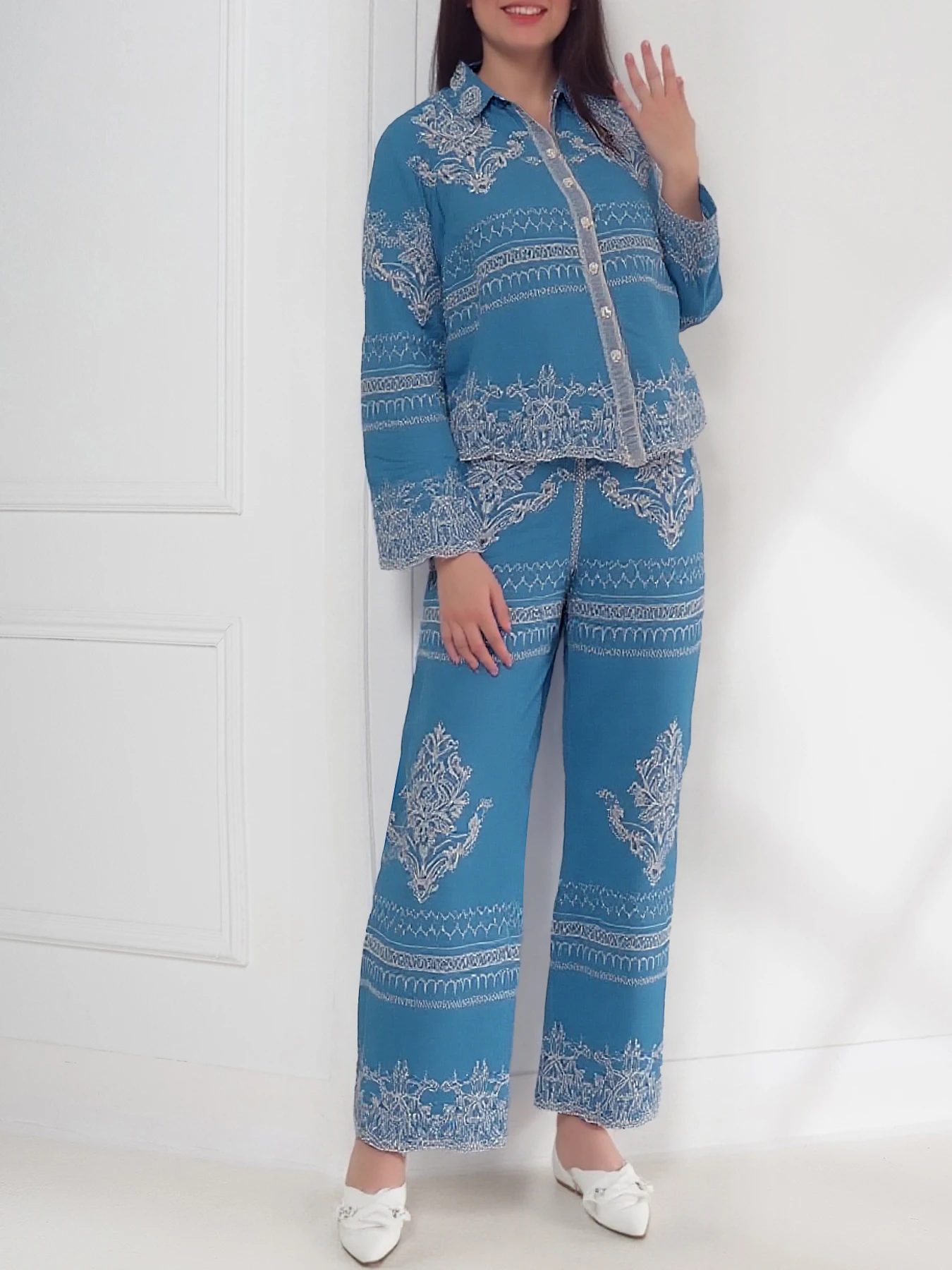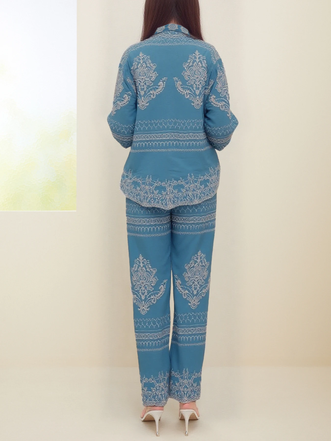 Women's Summer Two-Piece Set Embroidered Lapel Long Sleeve Shirt High Waist Slimming Wide Leg Pants Muslim Style Summer Outfit