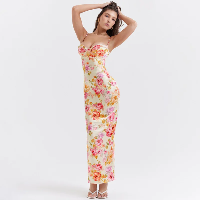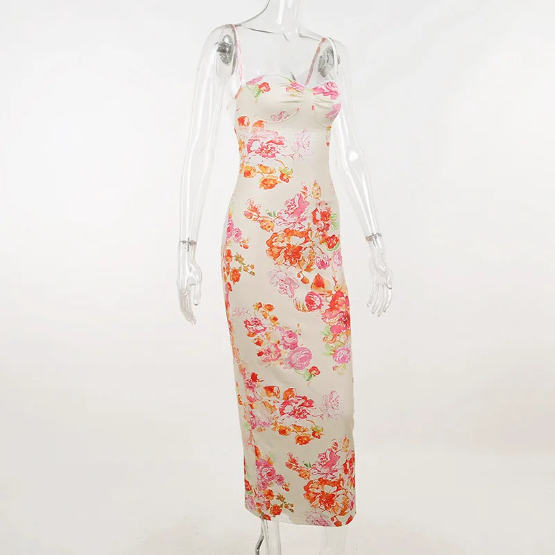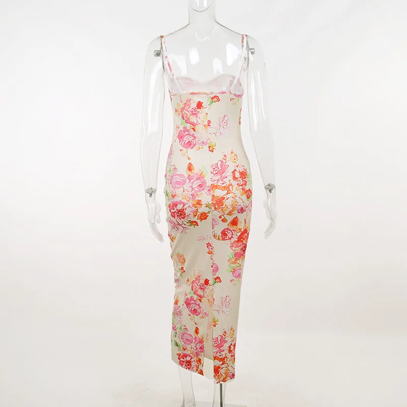 Floral Print Split Maxi Womens Dresses Spaghetti Strap Padded Lining Straight Sweet Club Dresses