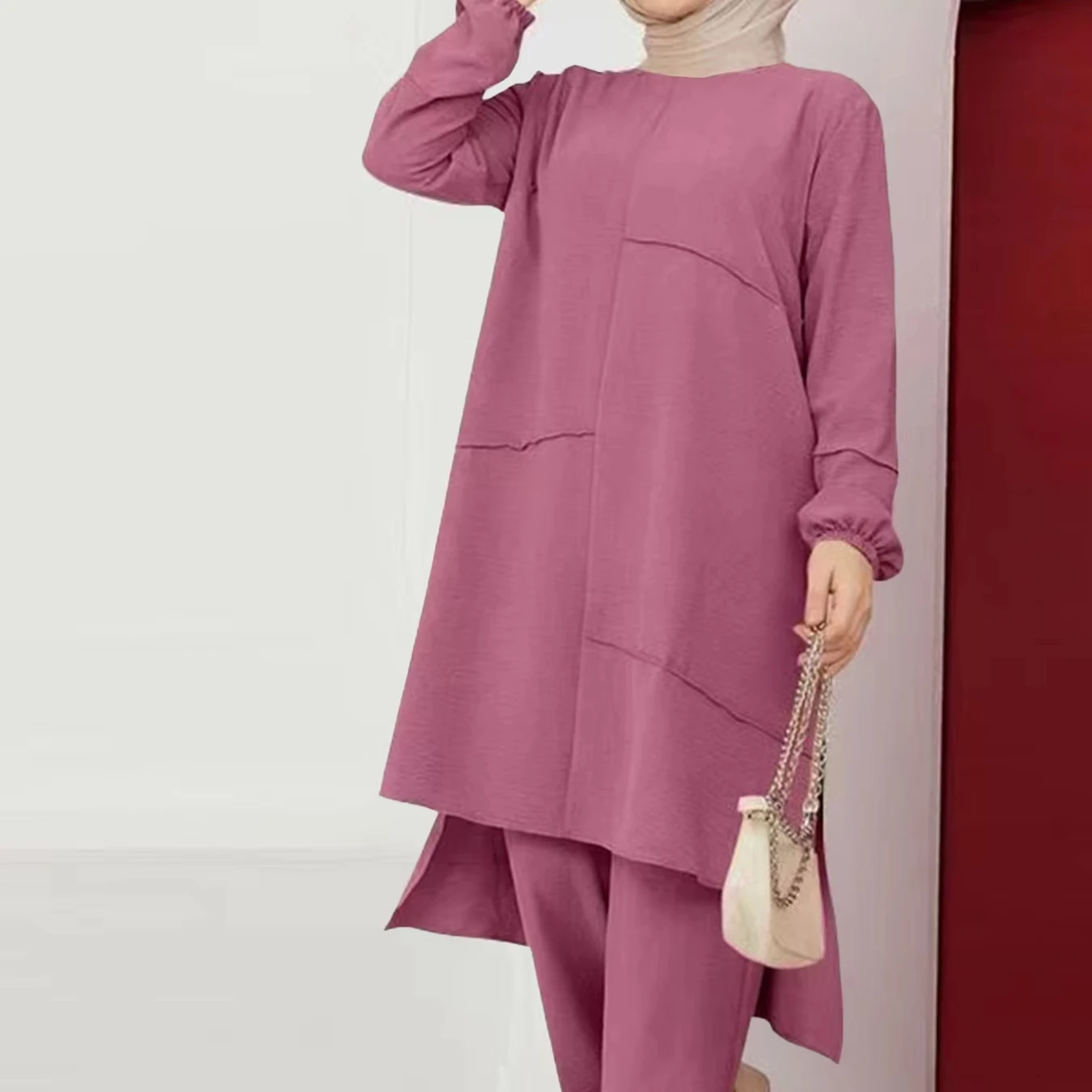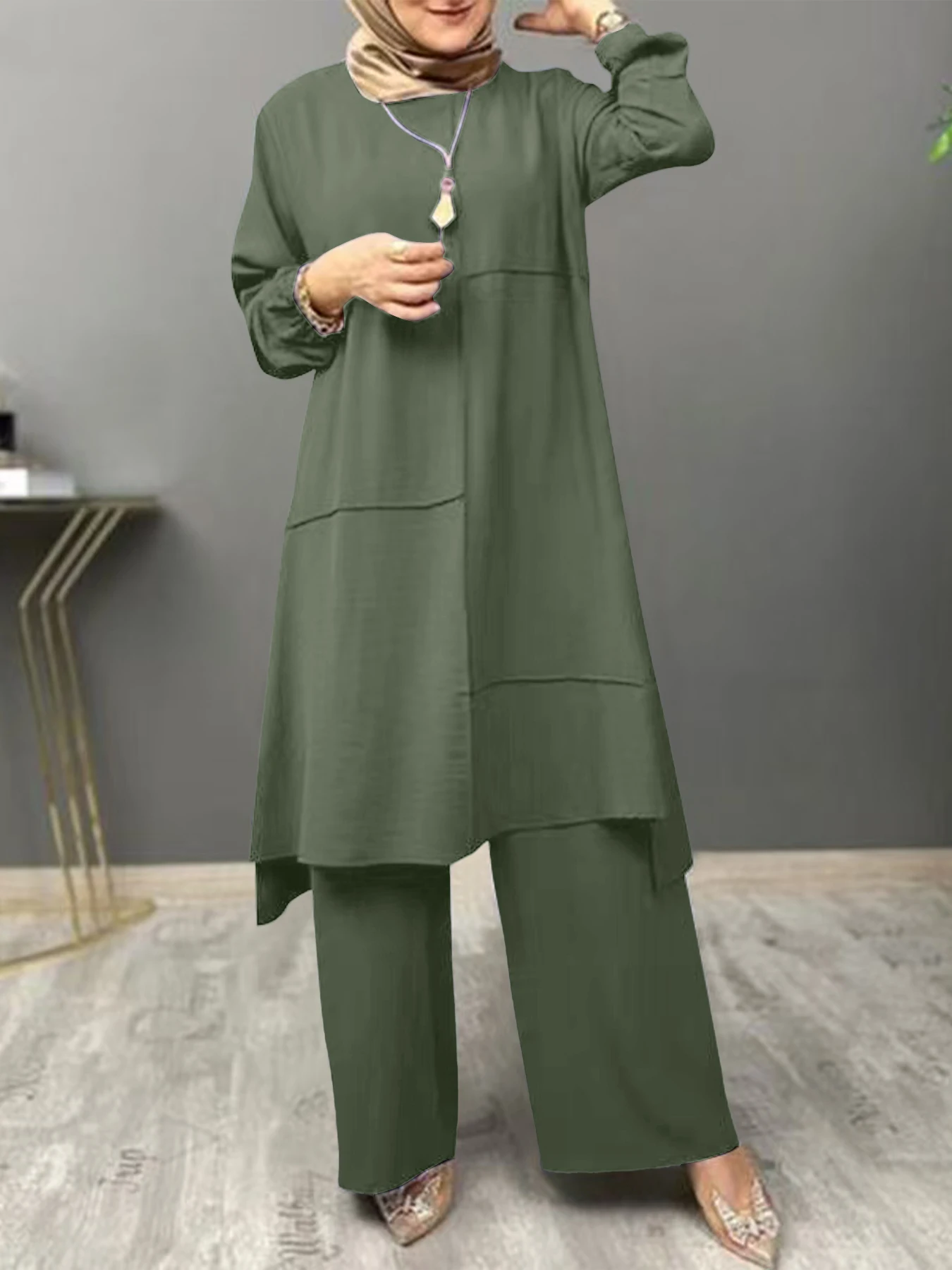 High Quality 2PCS New Fashion Solid Color Lace Elegant Long Sleeve Top Loose Wide-Leg Pants Suit for Muslim Women