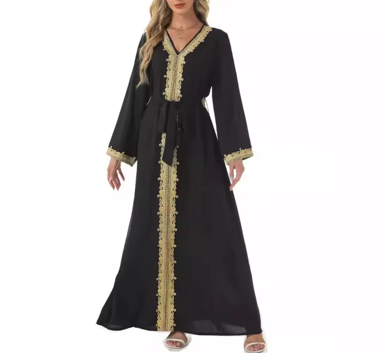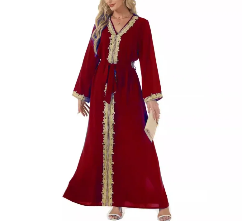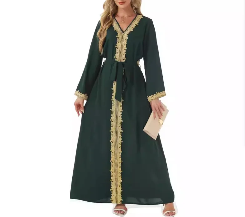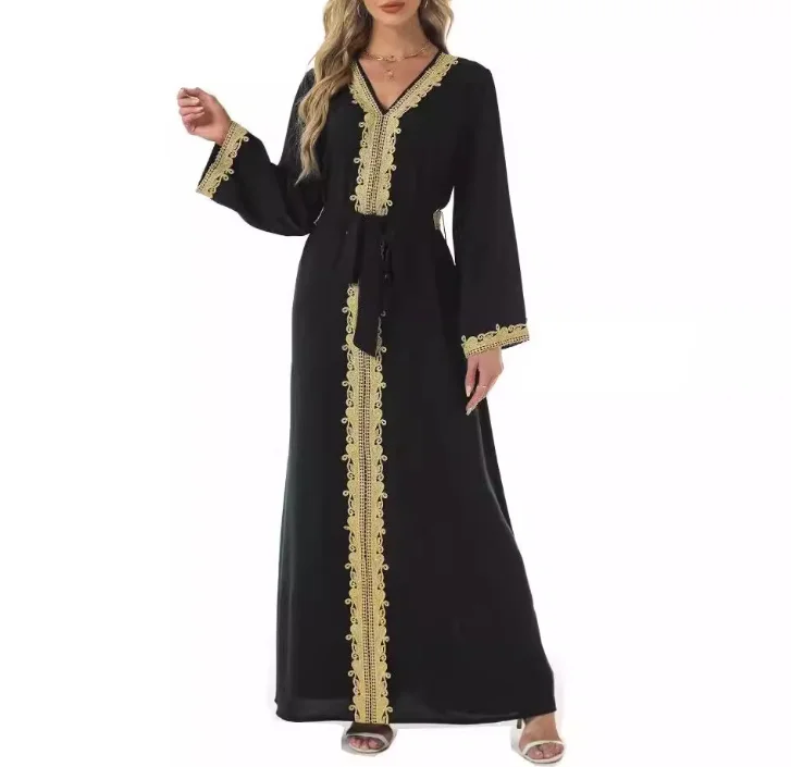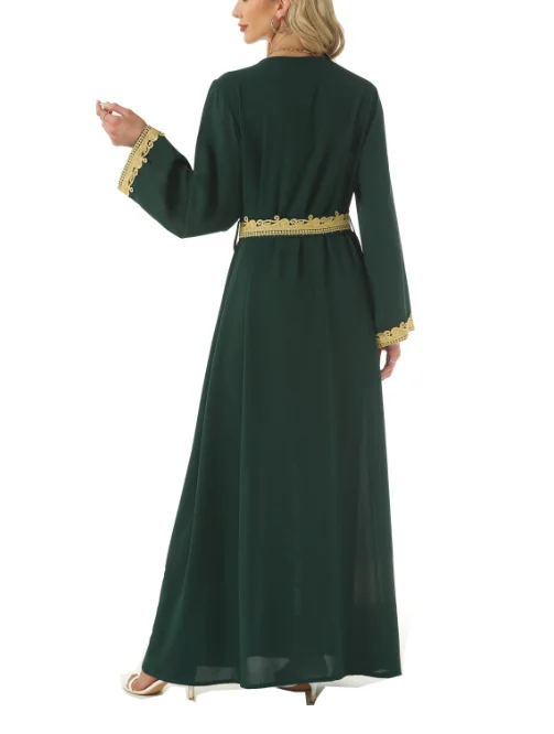 Trendy Elegant Solid Color Stitched Lace Dress V-neck Loose Long-sleeved Clothing Plus-size Adjustable Belt Muslim Robe