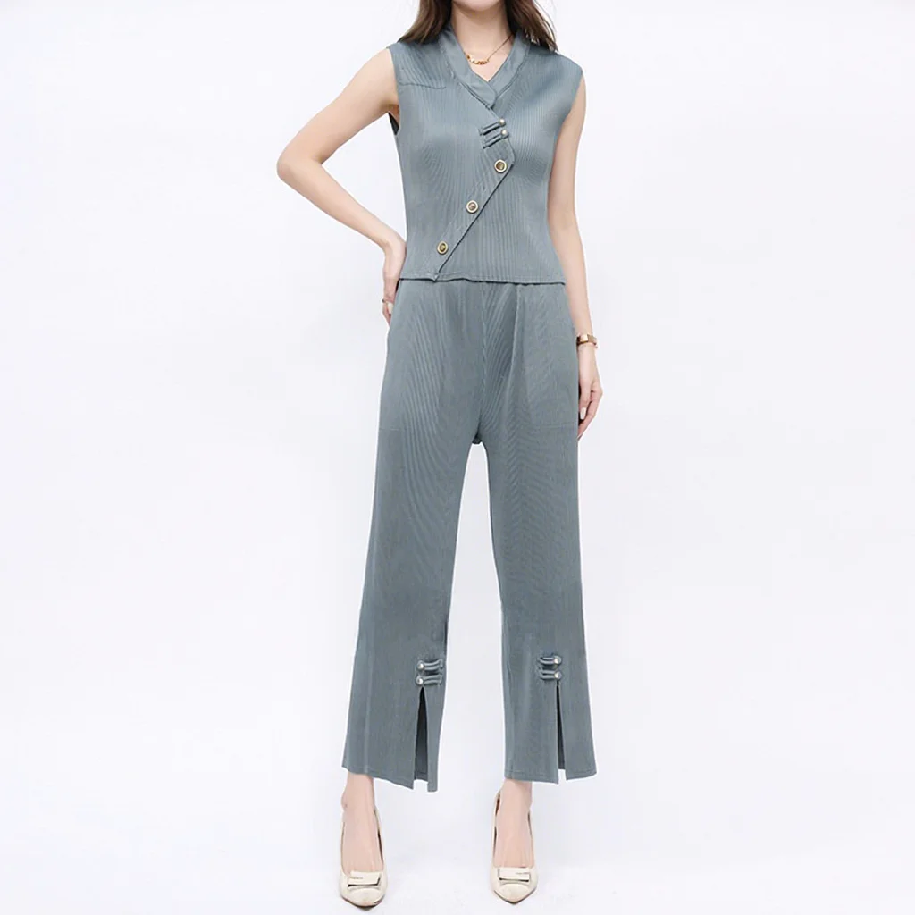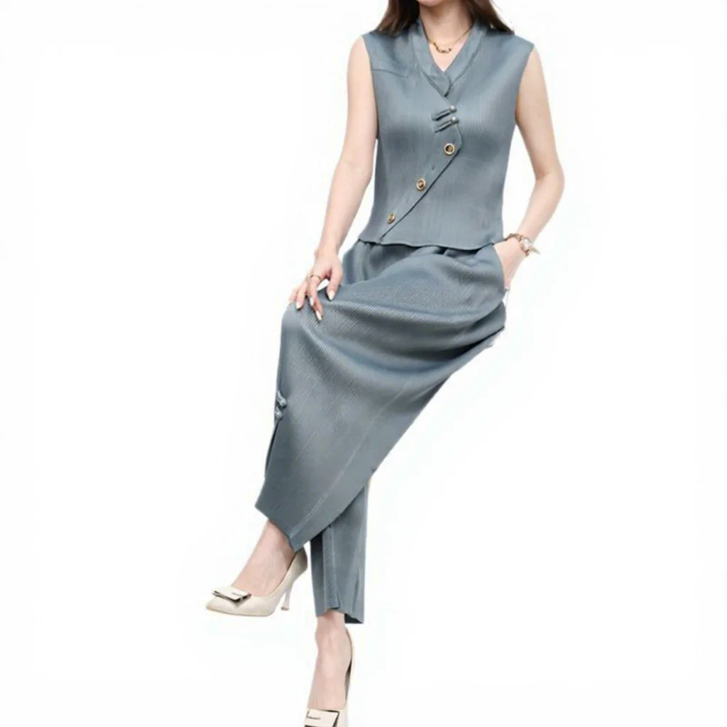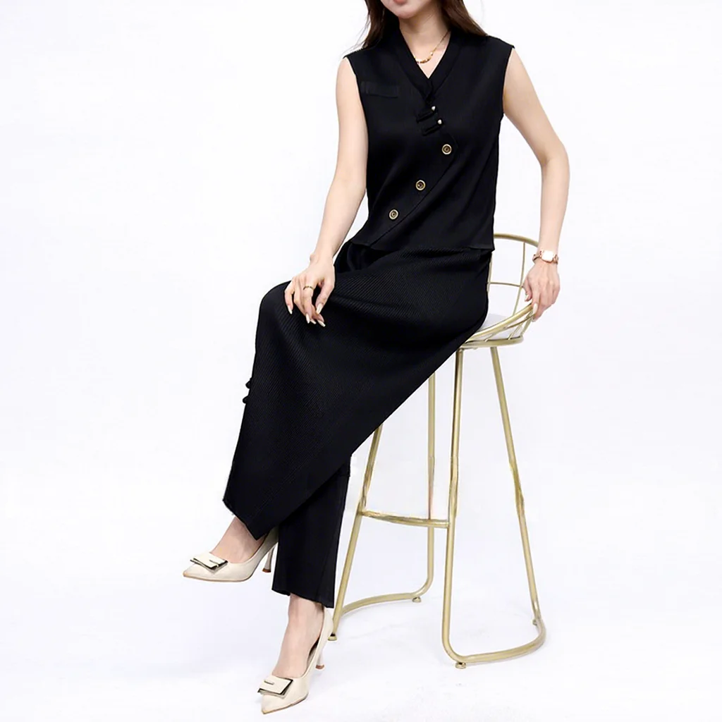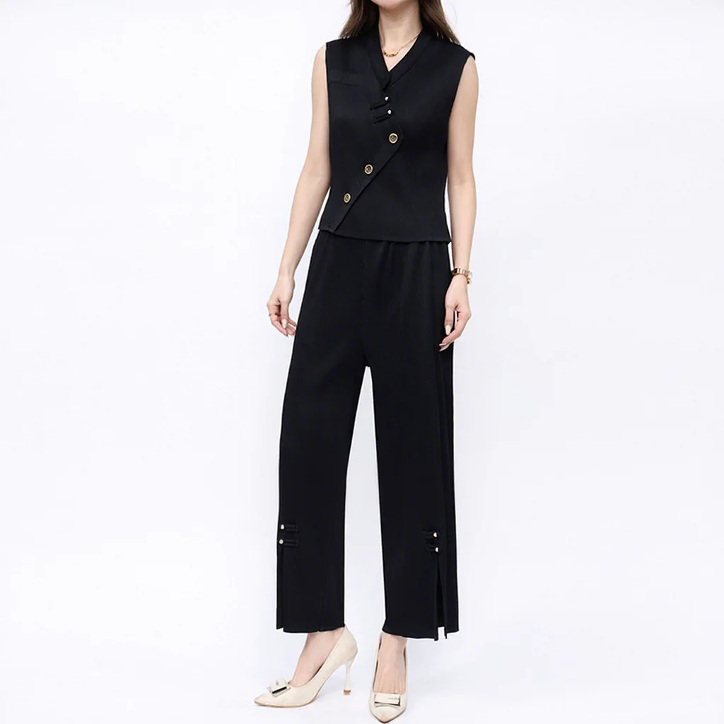 Factory Direct High-End Summer Two-Piece Set Slim Waistcoat Pleated Suit Wide Leg Pants New Solid Pattern Design Casual Style