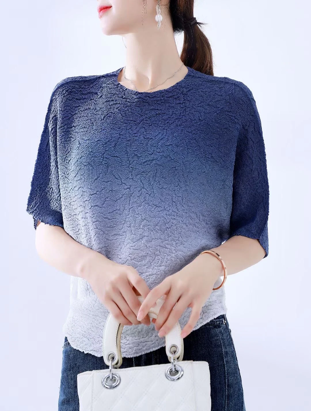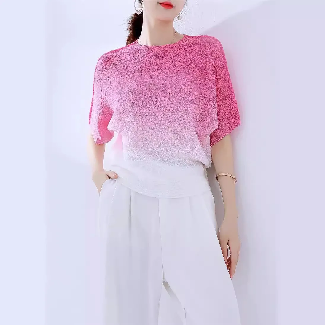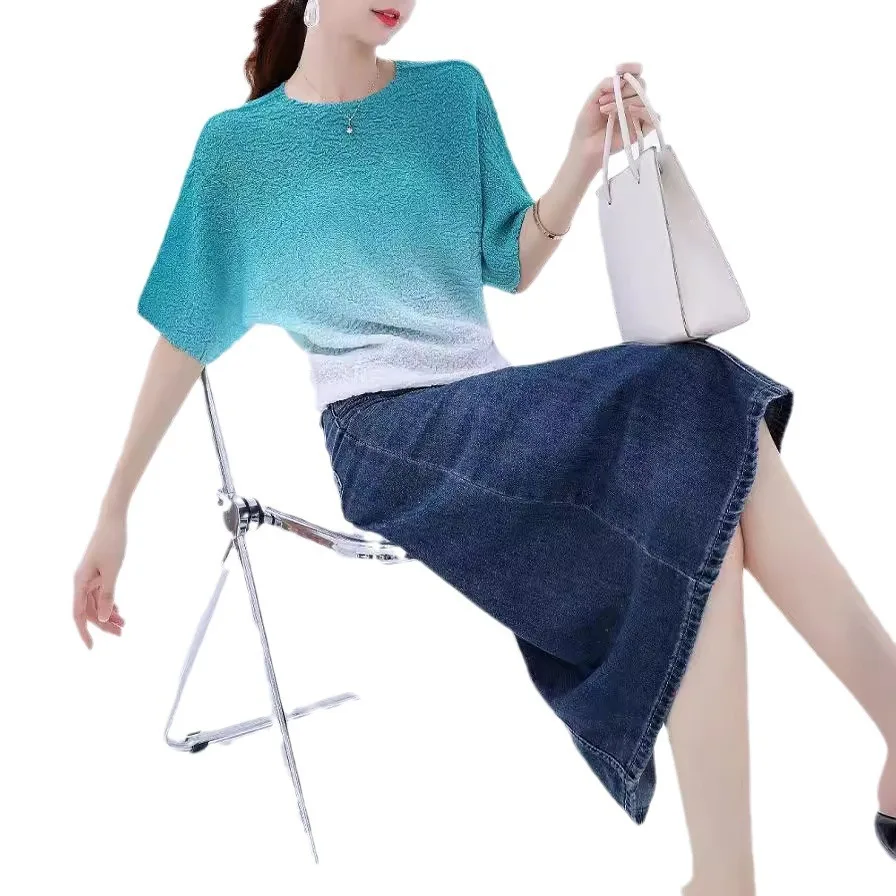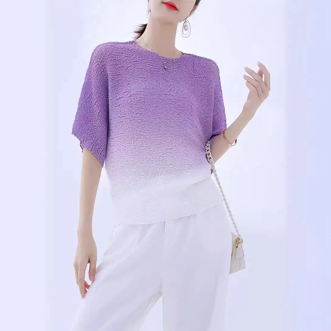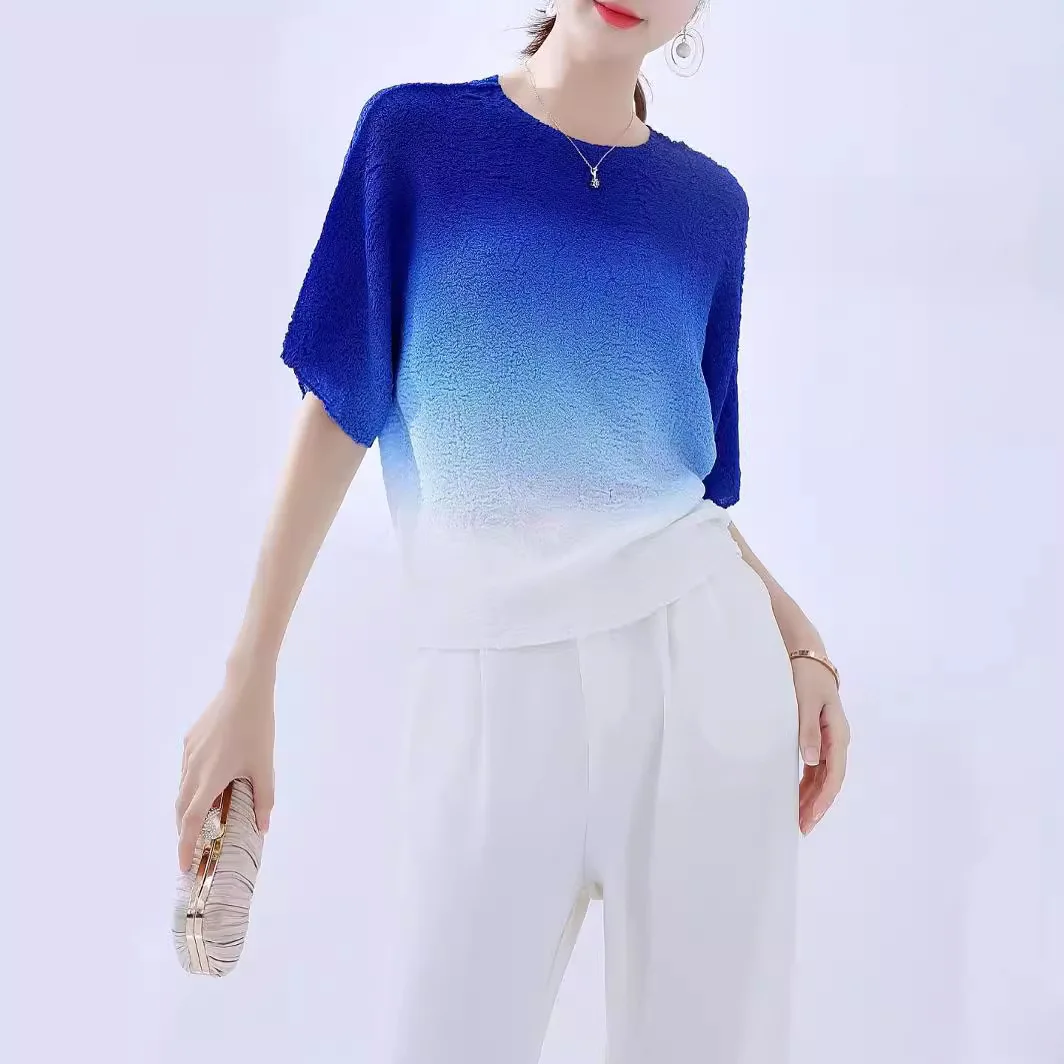 2025 Summer Collection Elegant Women's Short Sleeve T-Shirt Breathable Commuter Top Pleated Gradient Color Versatile Casual