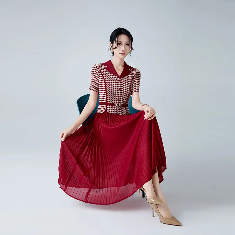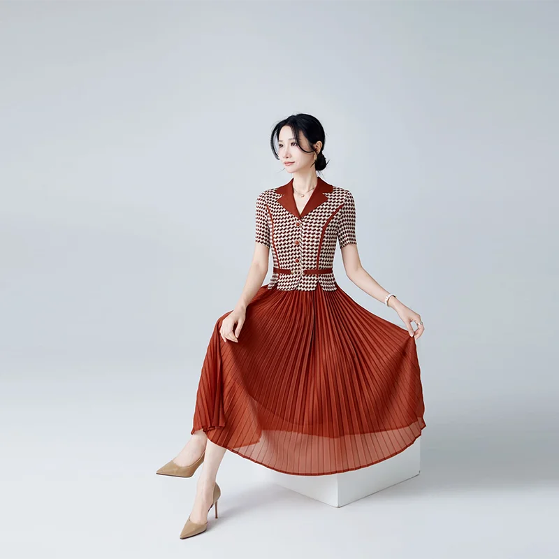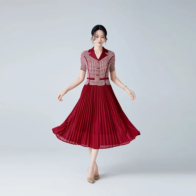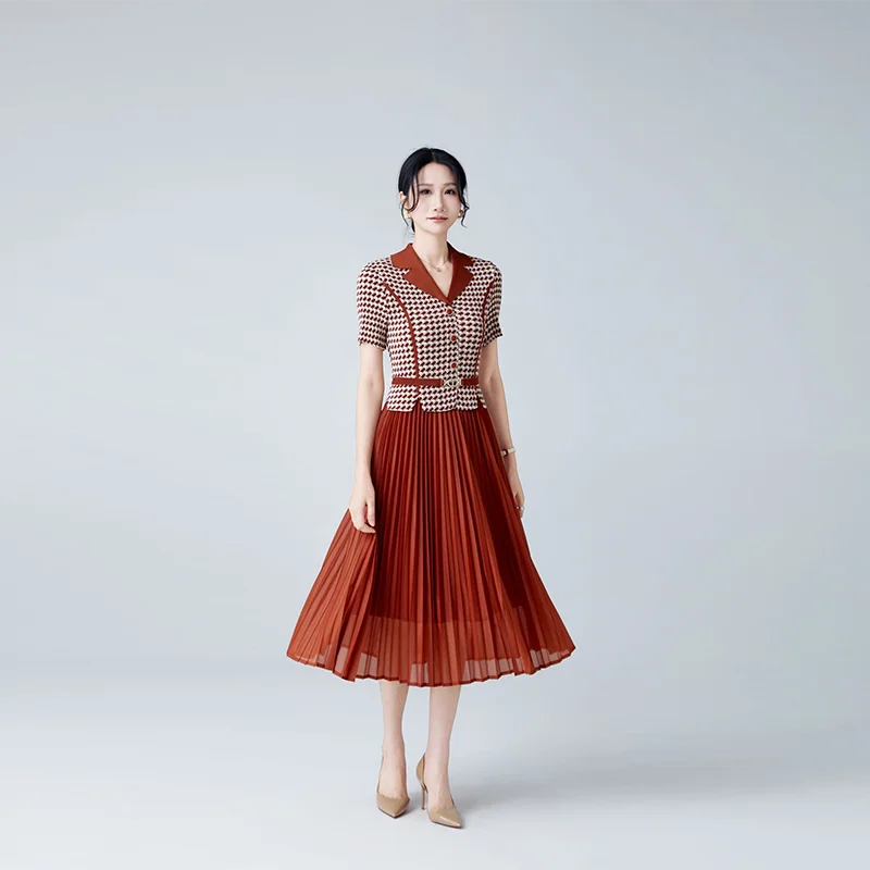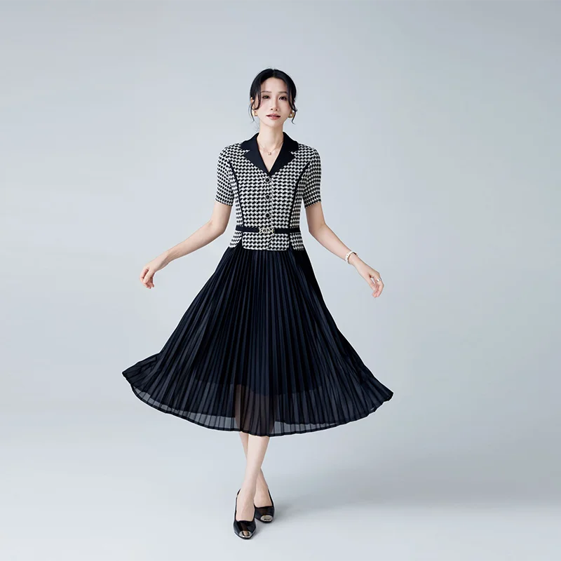 Women's Elegant Retro Pleated Midi Skirt Dress New Checkered Pattern Short Sleeve Breathable Casual Summer Style Natural ODM
