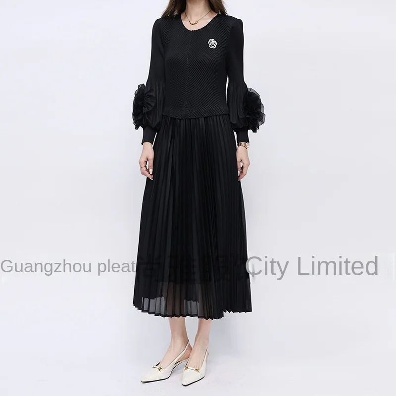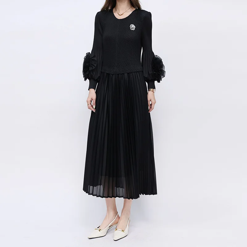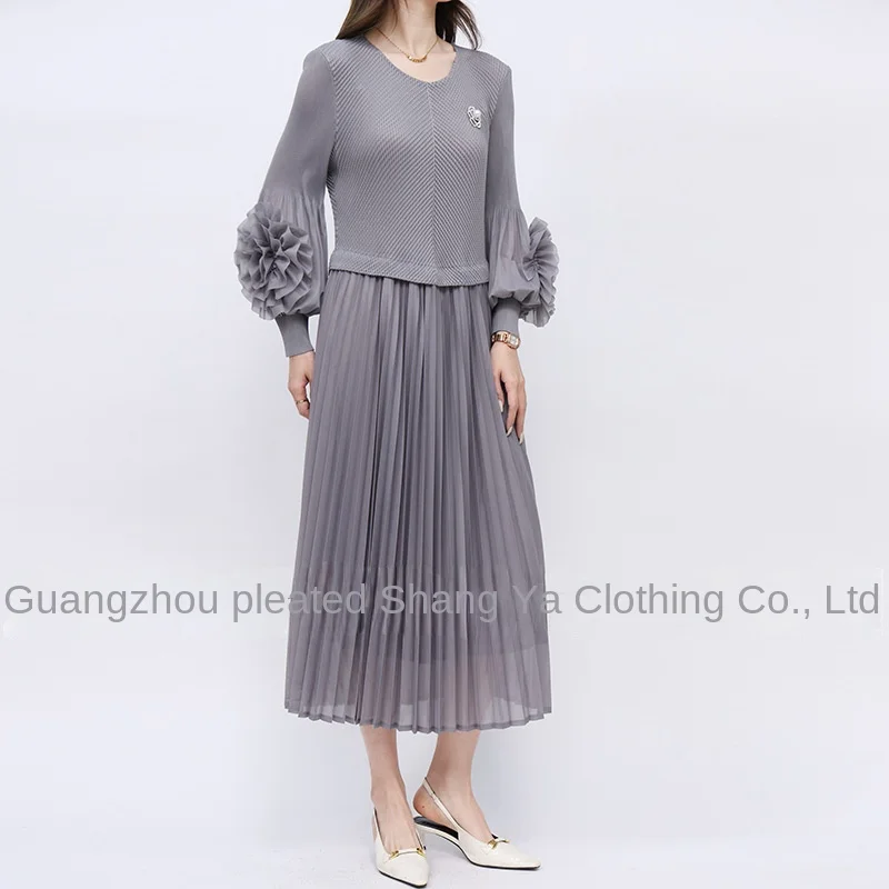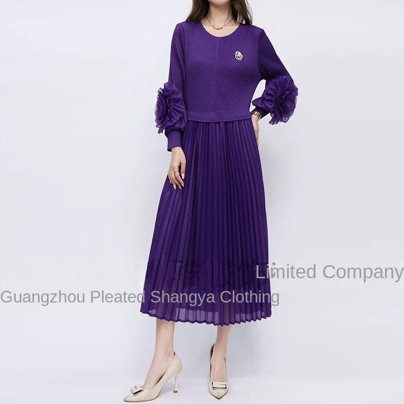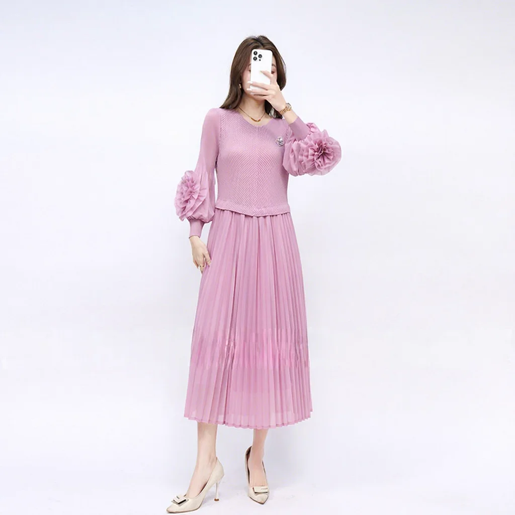 2025 New Fashion High-End Midi Chiffon Dress Elegant Fish Scale Pleated Slim Stereo Petals Natural Office Casual Style Factory