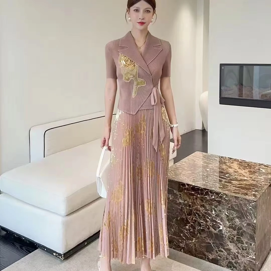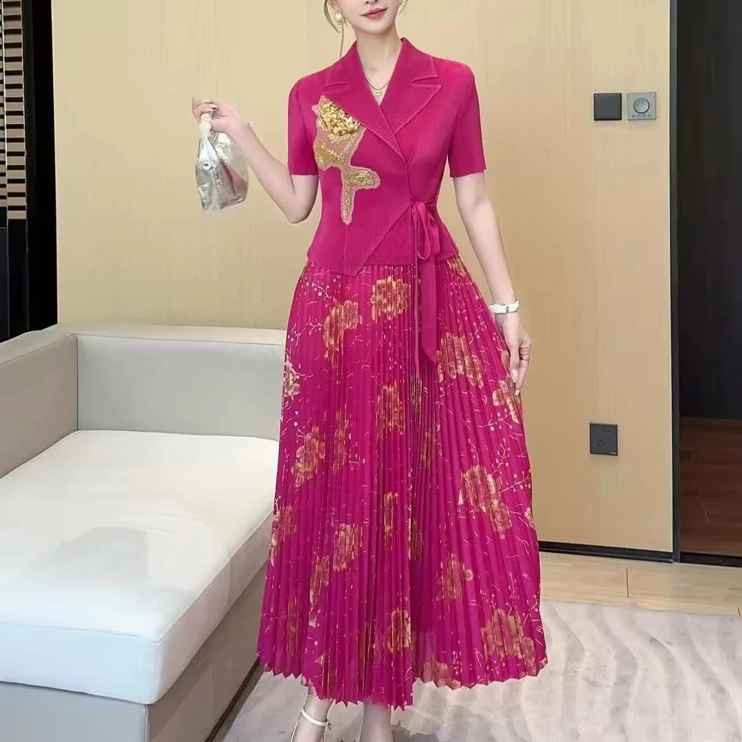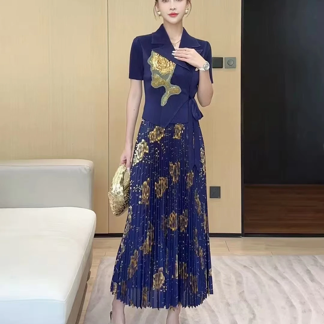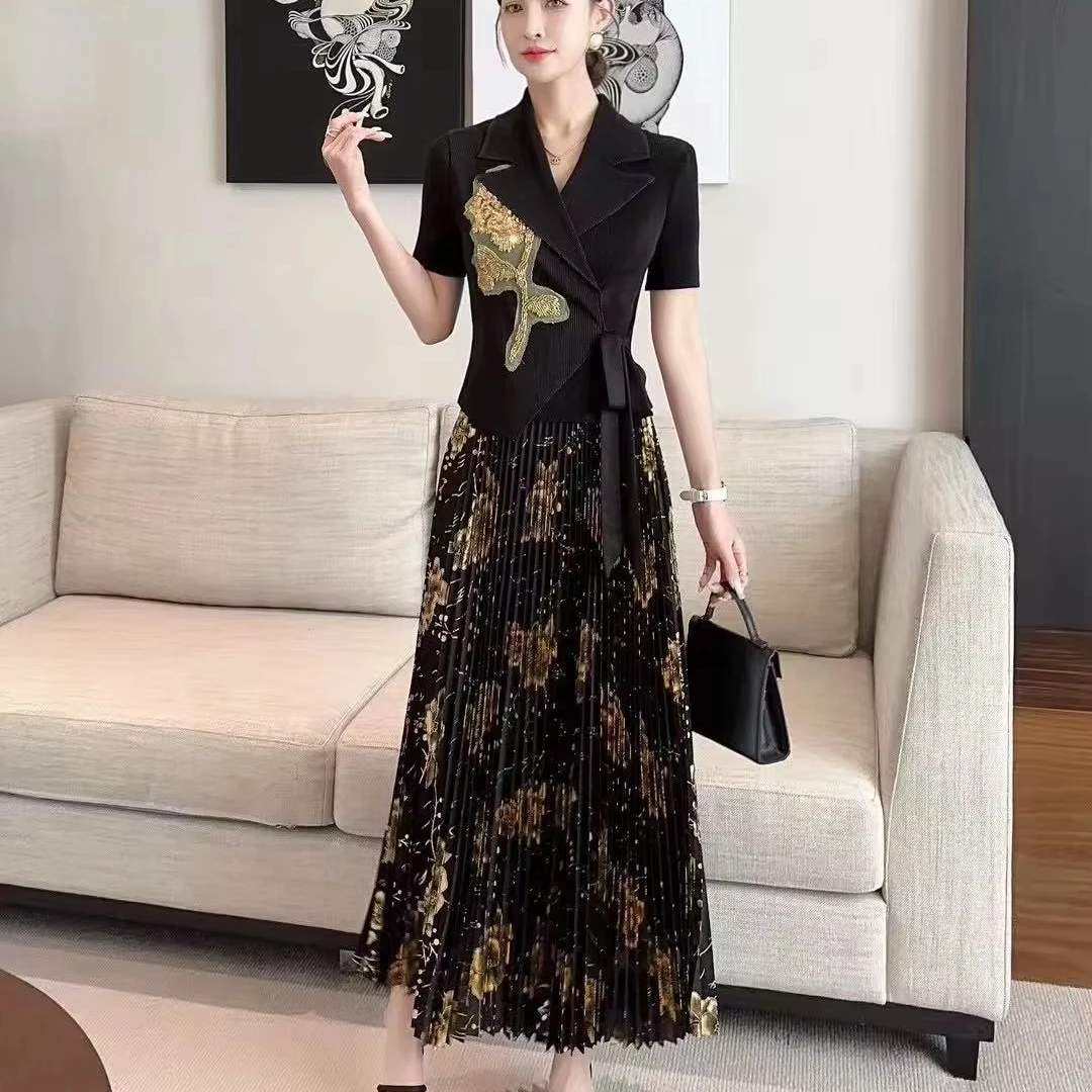 2025 Summer New Commuter Dress Floral Pattern Gilded Collar Natural Waist Pleated Midi Length Casual Fashion Elegant Temperament