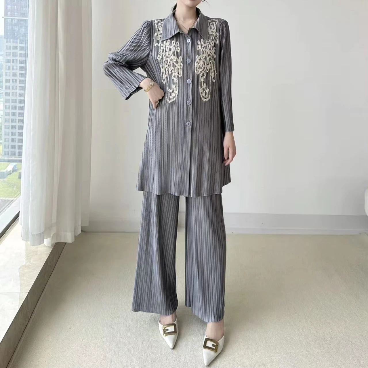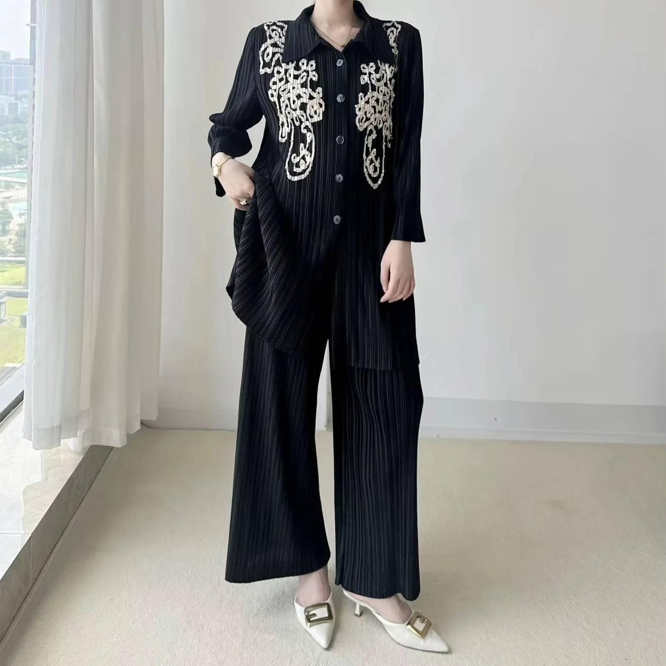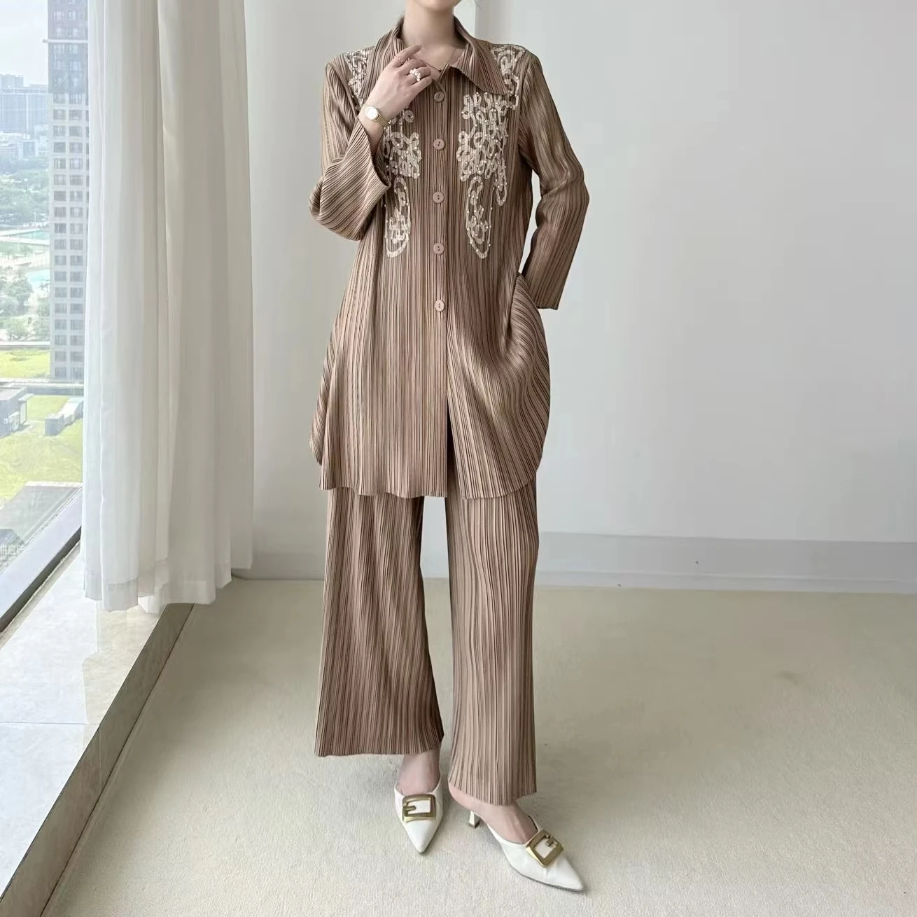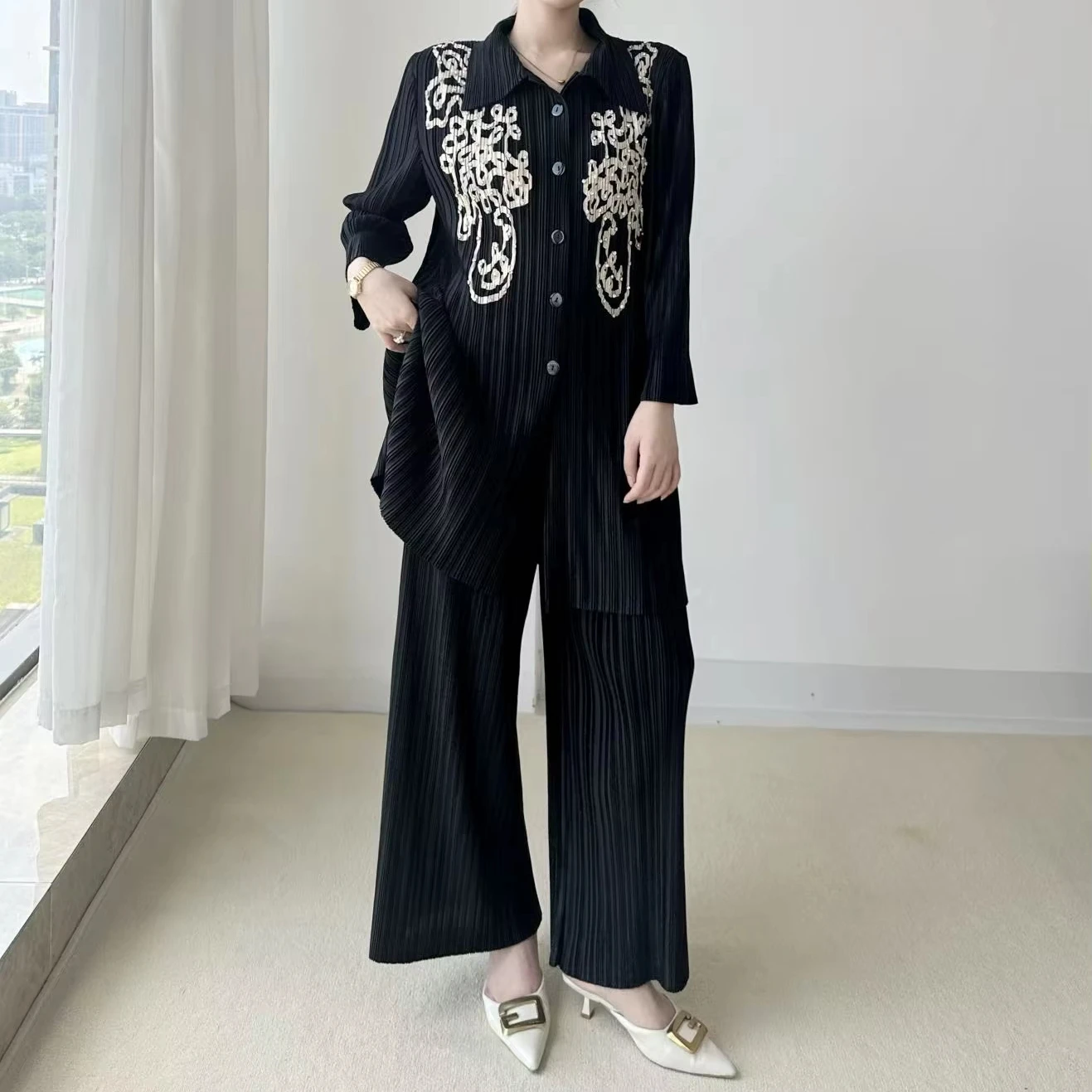Factory Direct Supply 2025 Autumn New Collection Pleated Lapel Printed Jacket High Waist Wide Leg Pants Two-Piece Solid Wrinkled