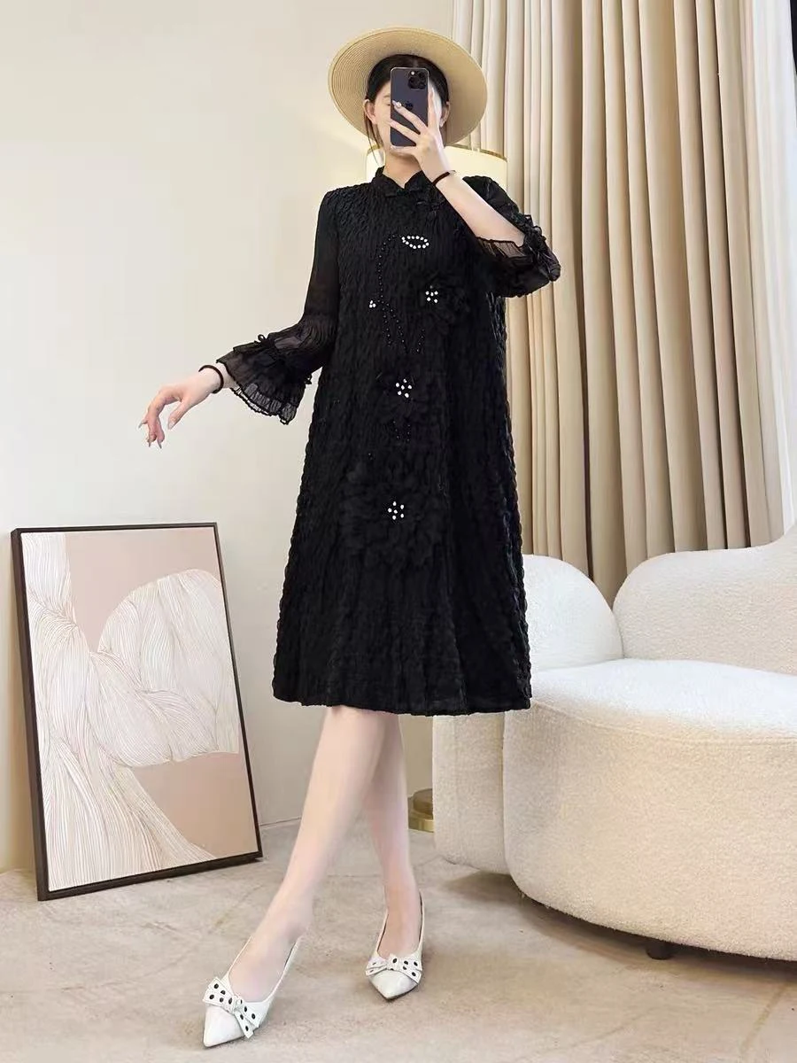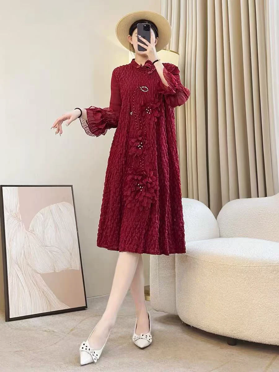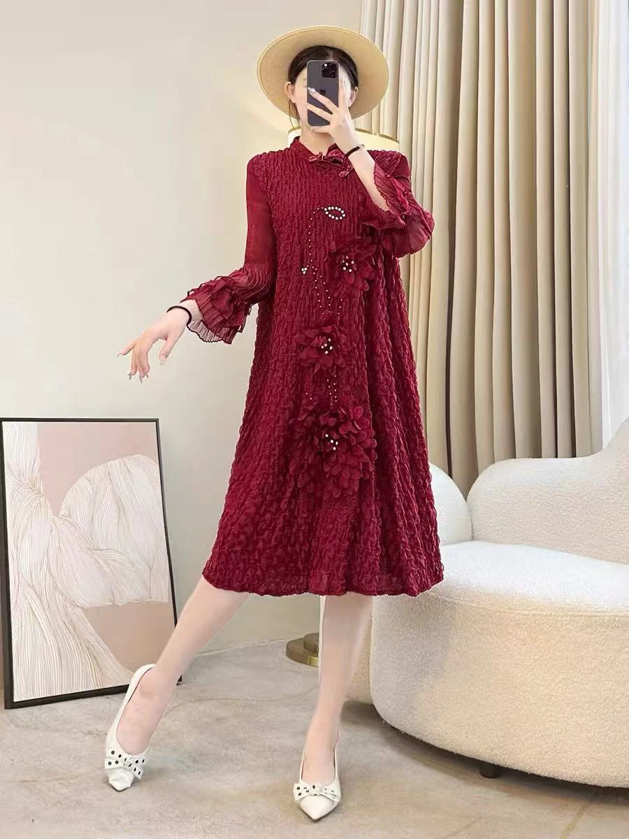 Factory Direct 2025 Autumn New Red Pleated Gown with 3D Floral Beaded Decoration , Celebratory Mother of the Bride Dress