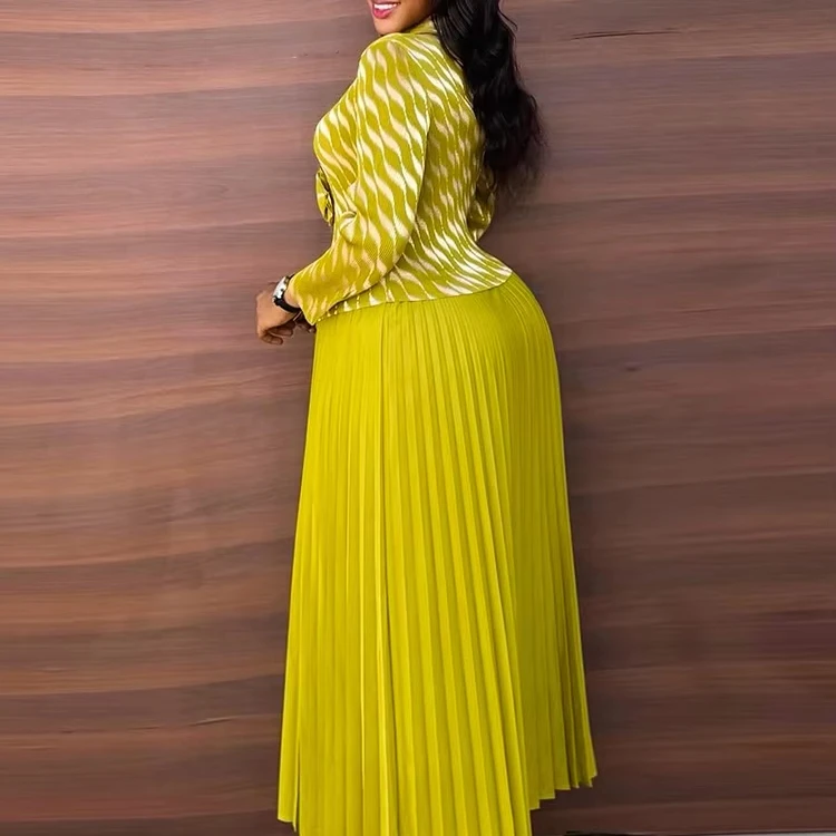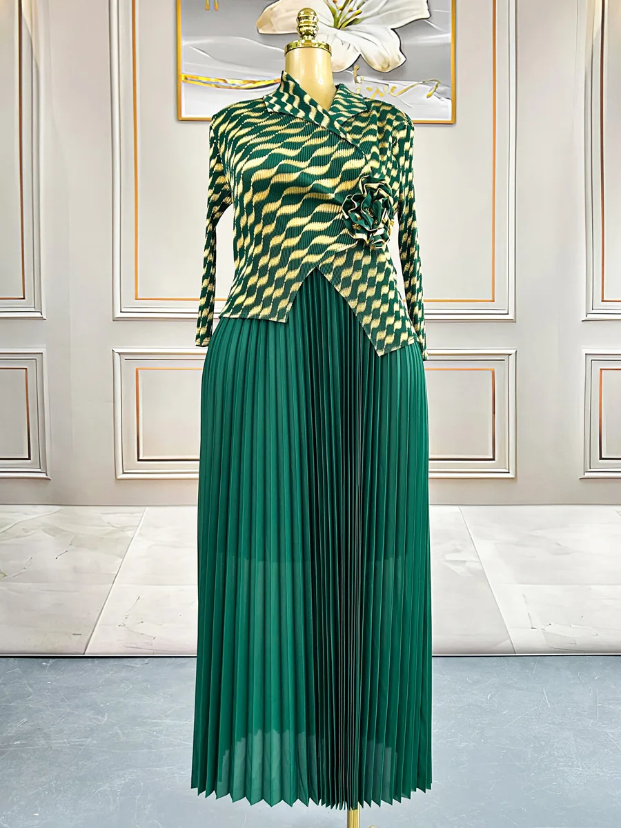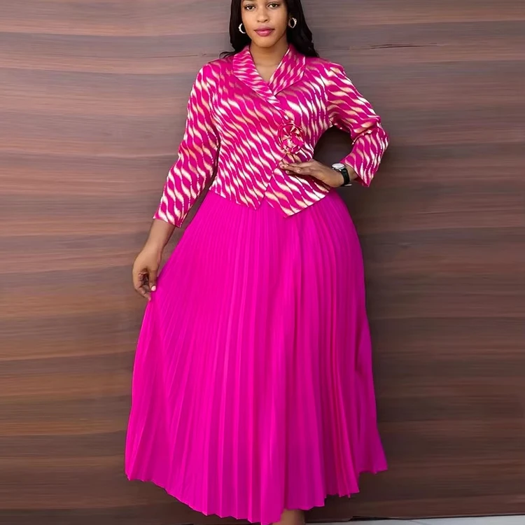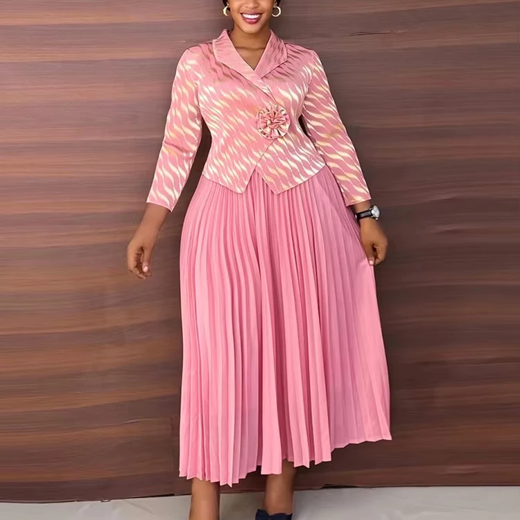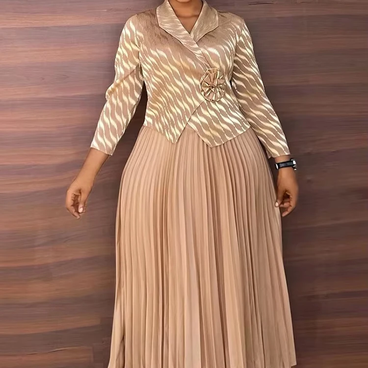 Factory Direct Ladies Two-Piece Pleated Set Plus-Size Casual Bronzed Design Suit Embroidered Neckline Long Tops Lace Tassel