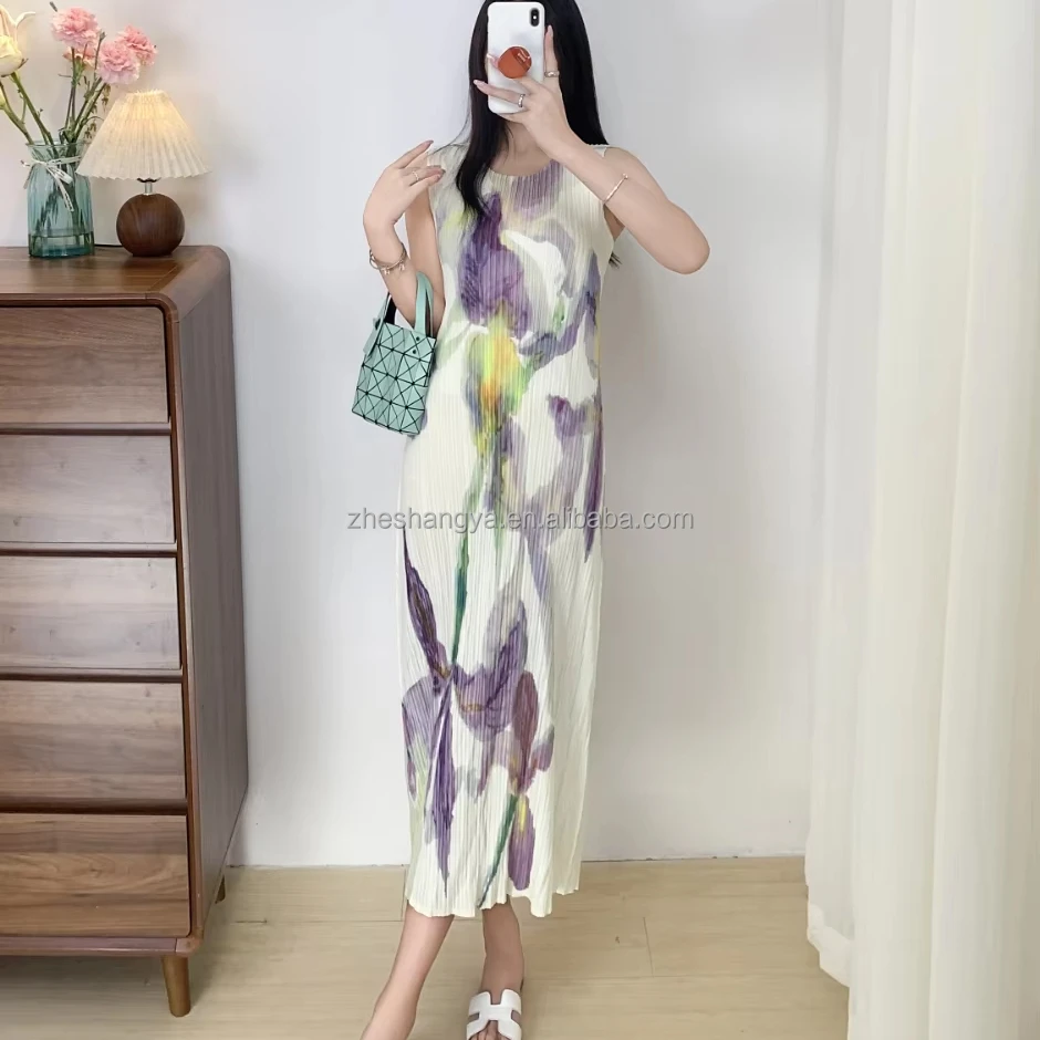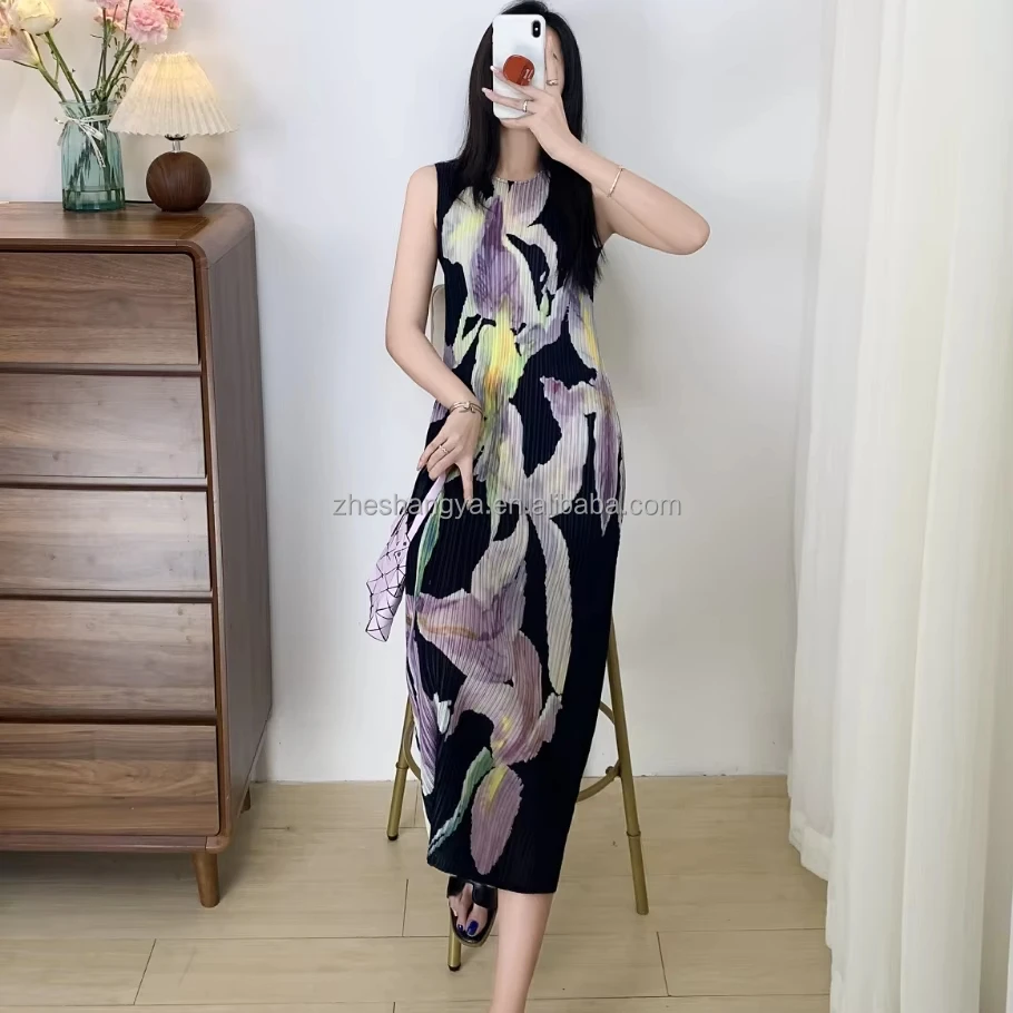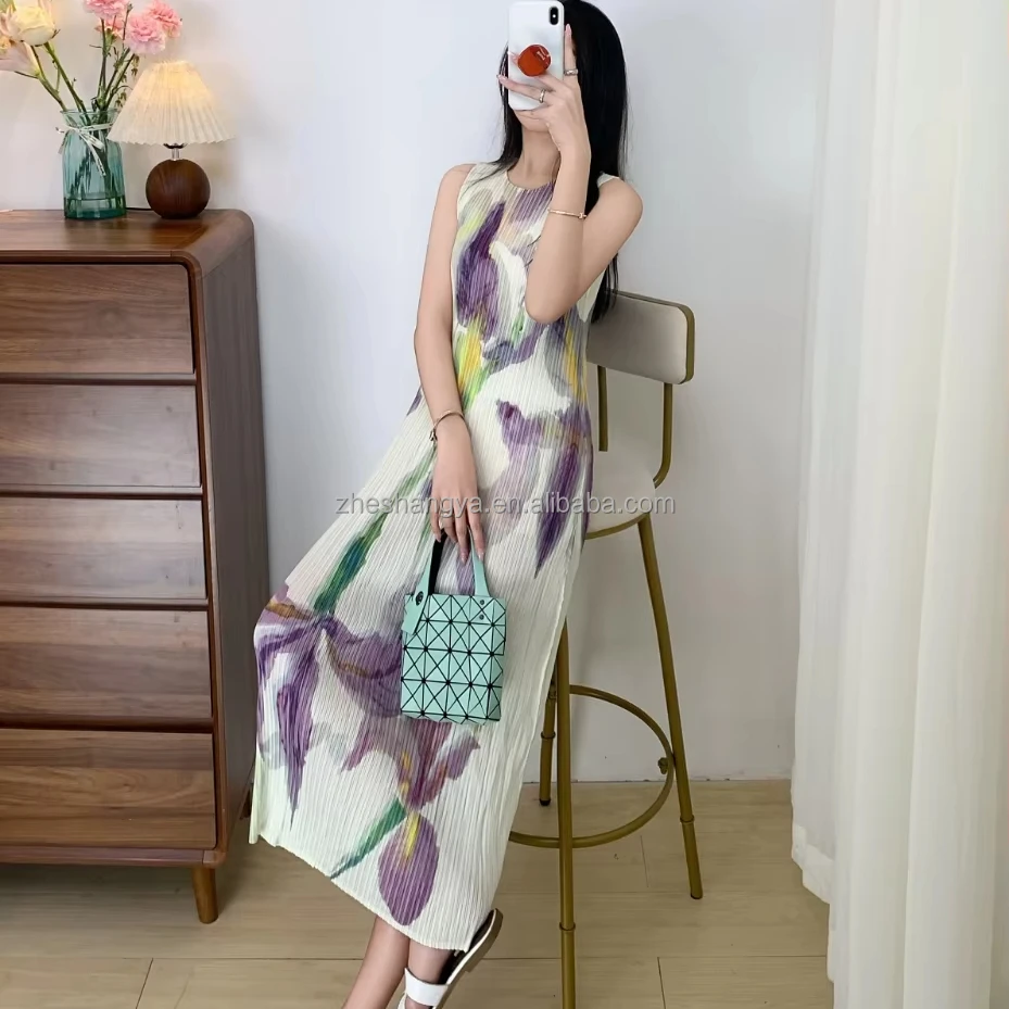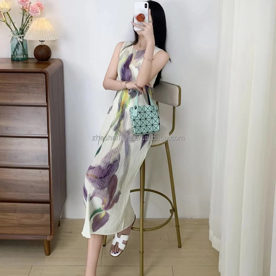 Vintage Floral Print Midi-Length Casual Dress Sleeveless Pleated Design Anti-Wrinkle Breathable Features Elegant ODM Summer