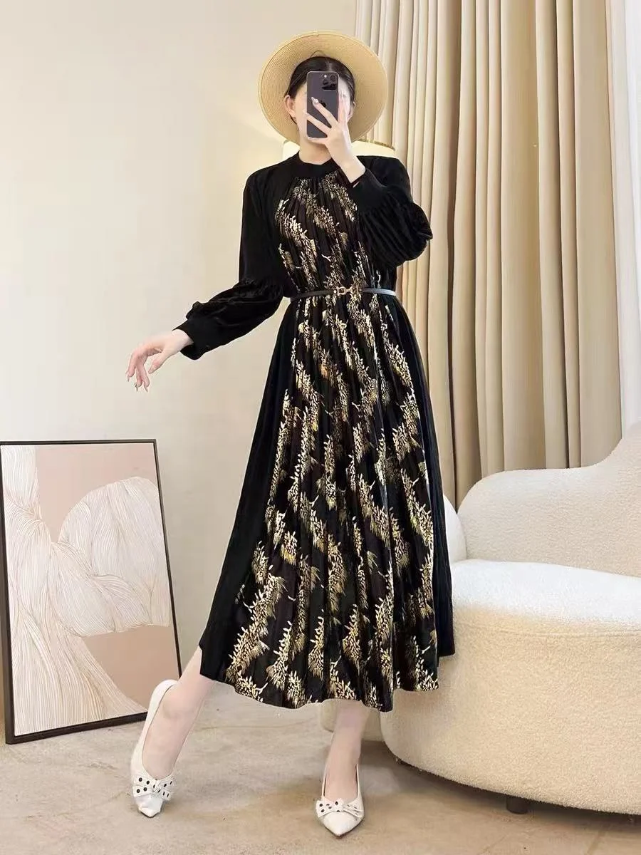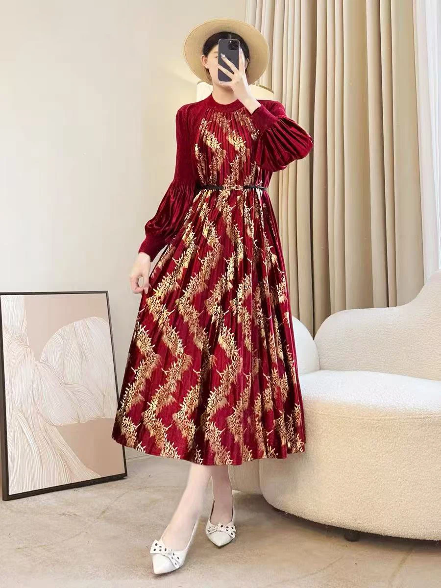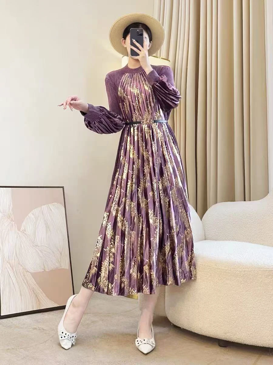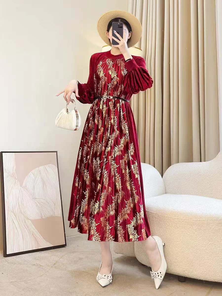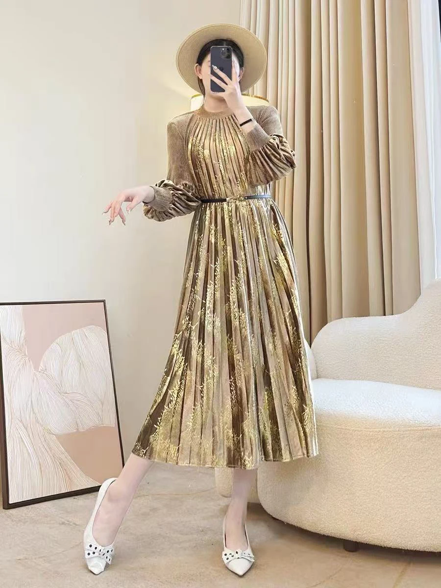 2025 Autumn New Premium Dress with Gold Foil Print, Round Neck Loose-Fit Pleated Women's Gown with Waist Definition