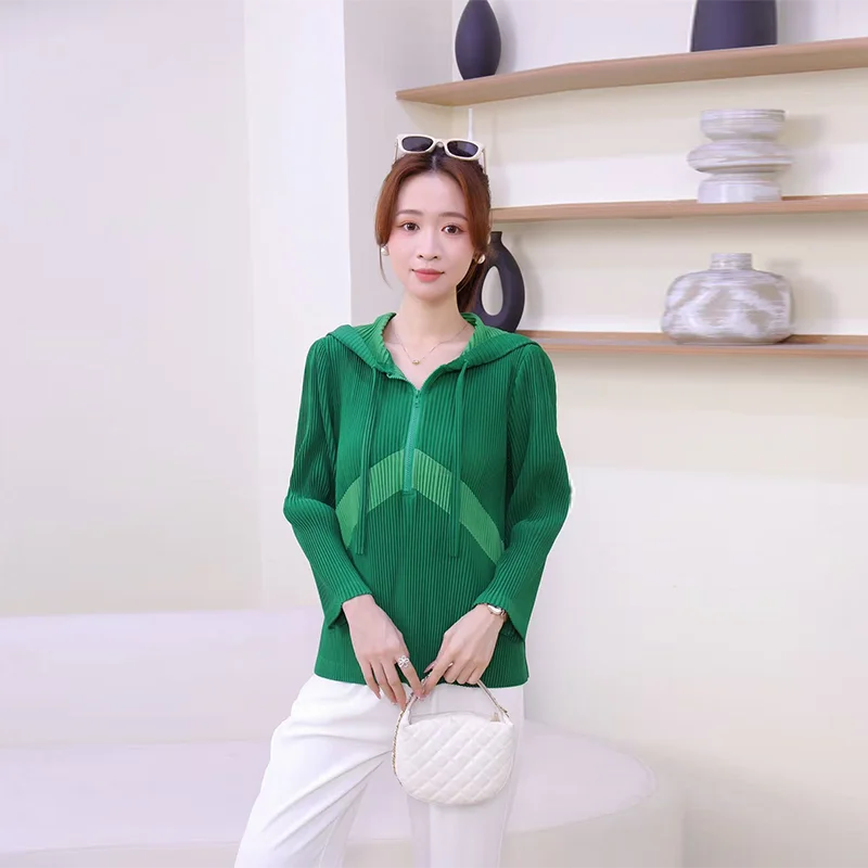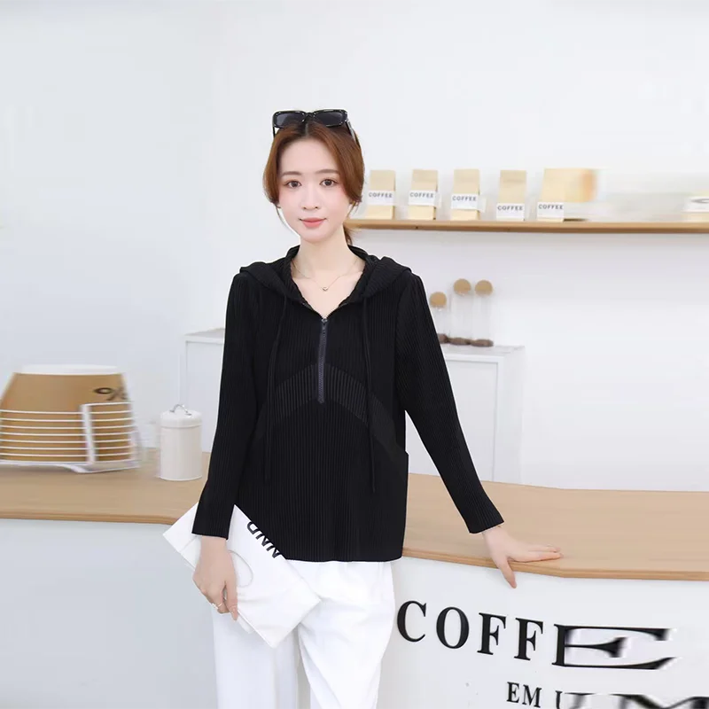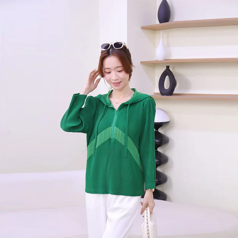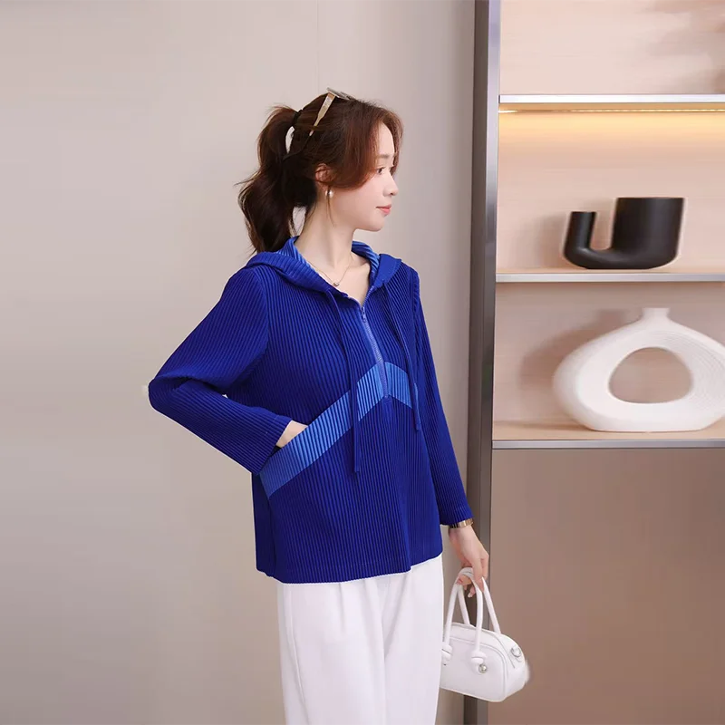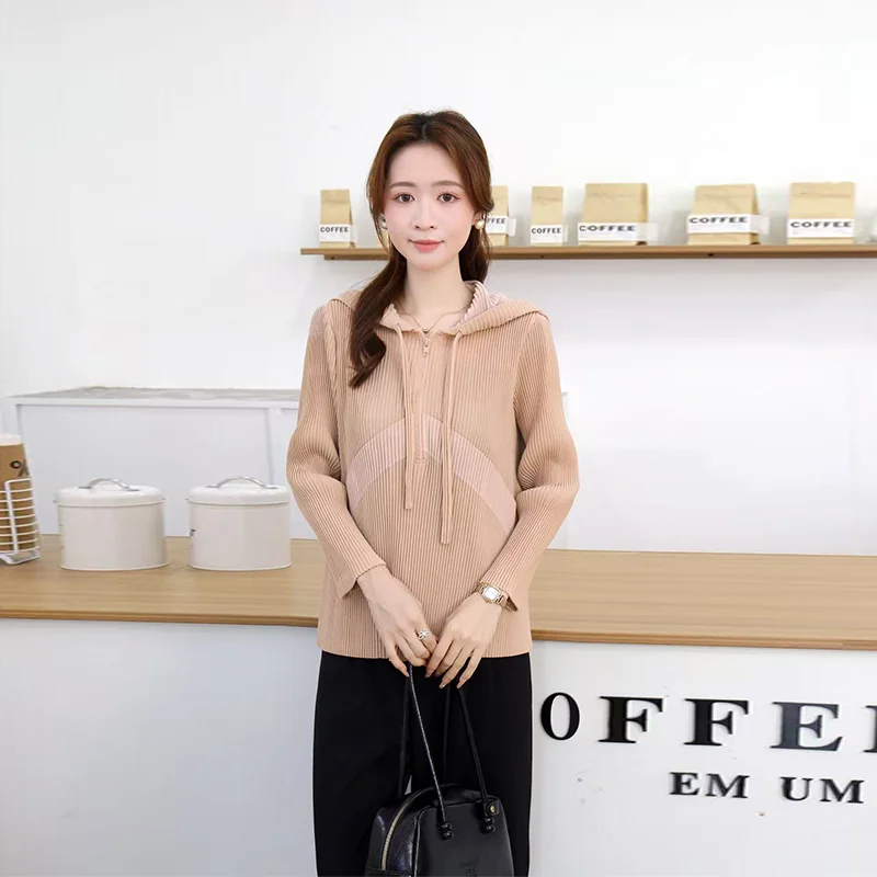 2025 Autumn New Fashion Women's Casual Pleated Blouse with Drawstring Hat Vests Waist Slimming Temperament Joker T-Shirt