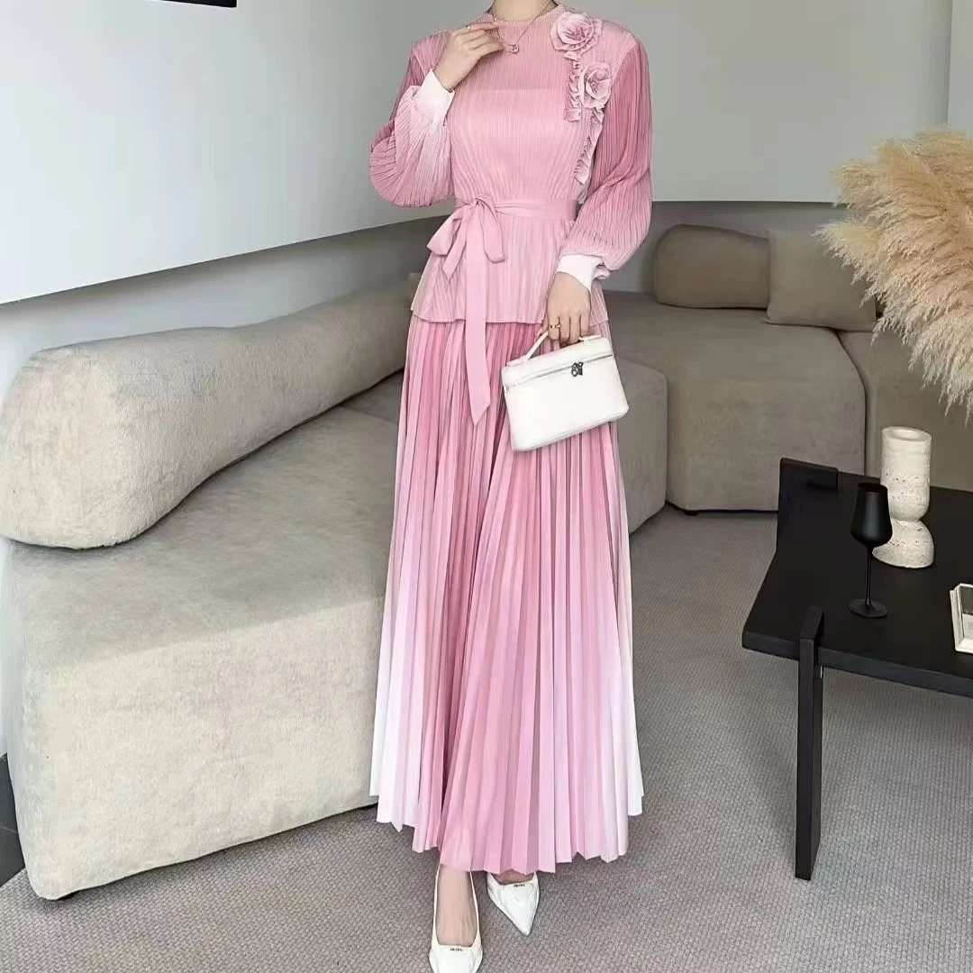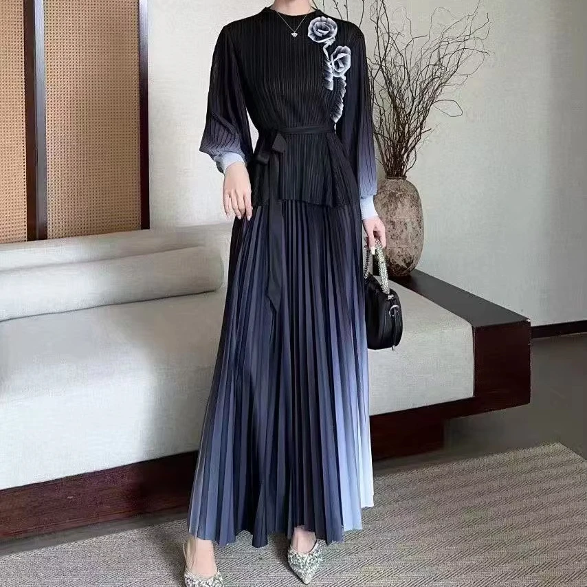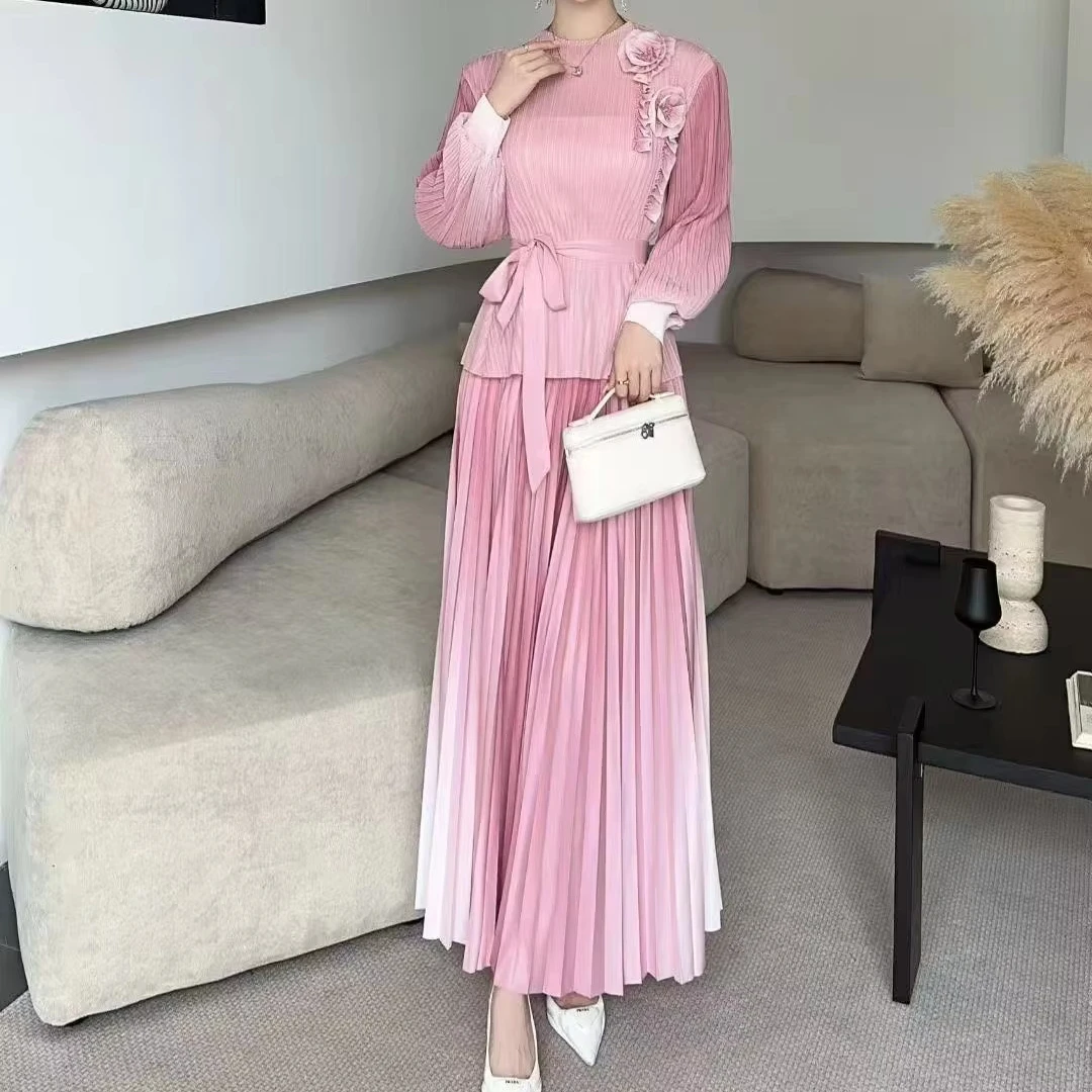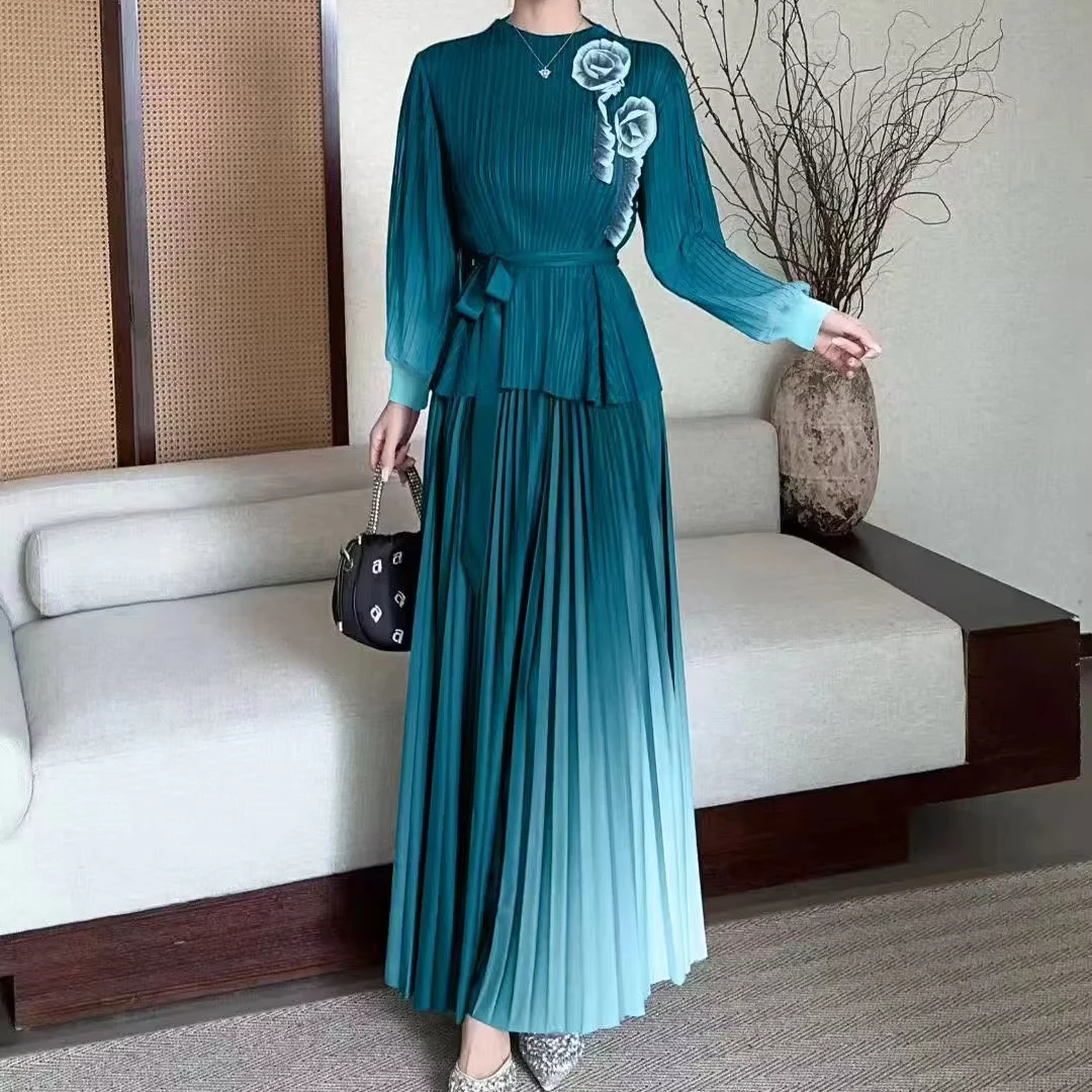 2025 Autumn New Pleated Gradient Flower Long Sleeve Top + Pleated Casual Ladies Dress Factory Direct Supply Women's Sets