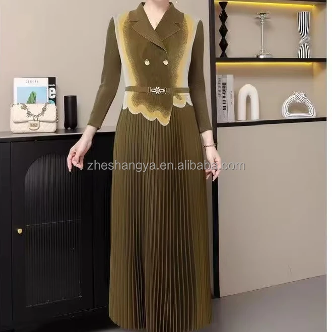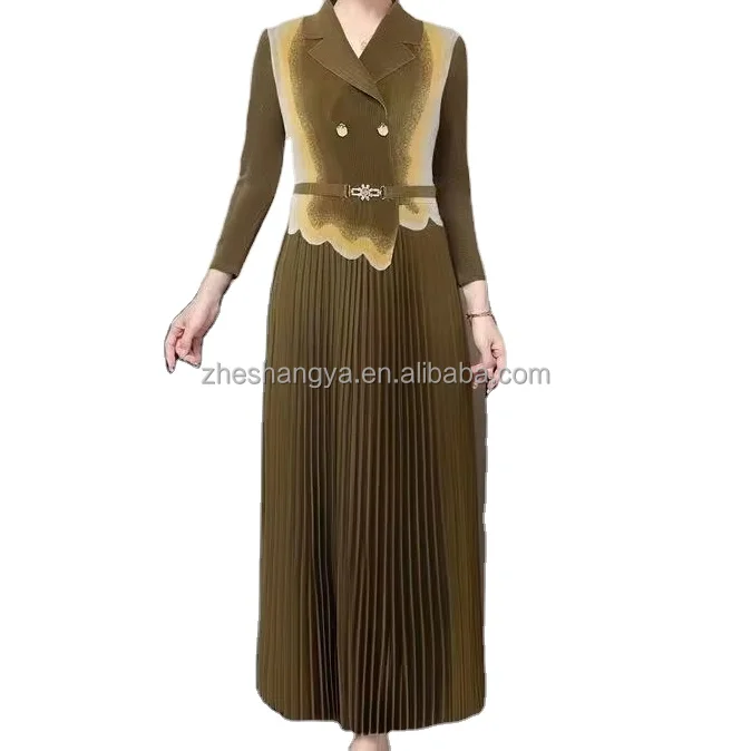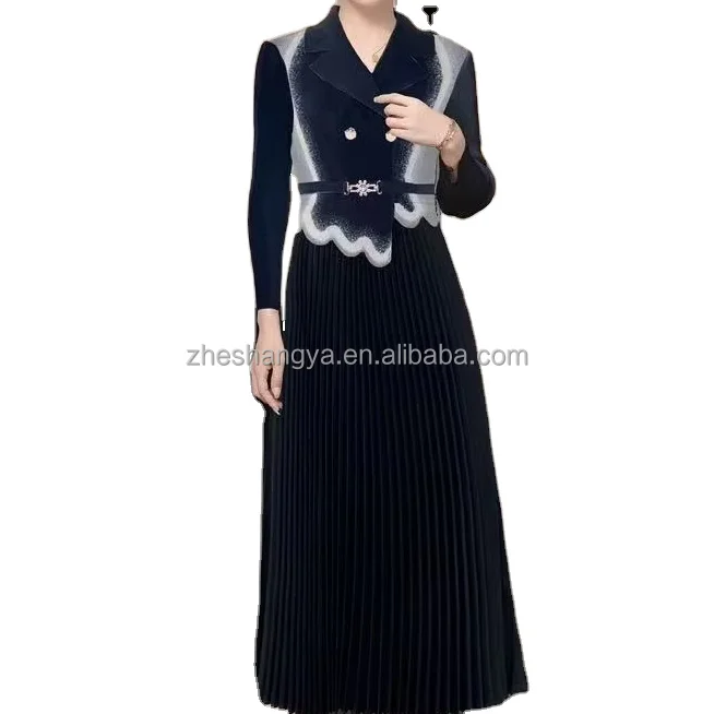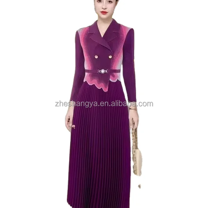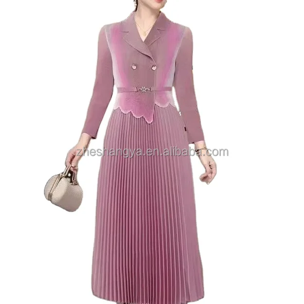2025 Summer ODM Supply New Gradient Suit Collar Casual Dress Breathable and Anti-Wrinkle Midi Length Pleated Skirt