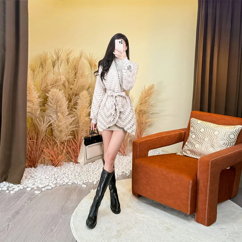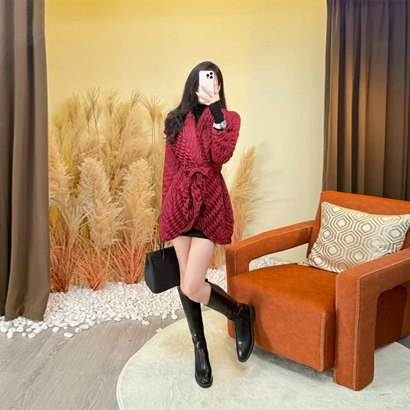 2025 Autumn New Pleated Open-Front Women's Mid-Length Coat with Pineapple Pleats, Tie-Waist Casual Premium Outerwear