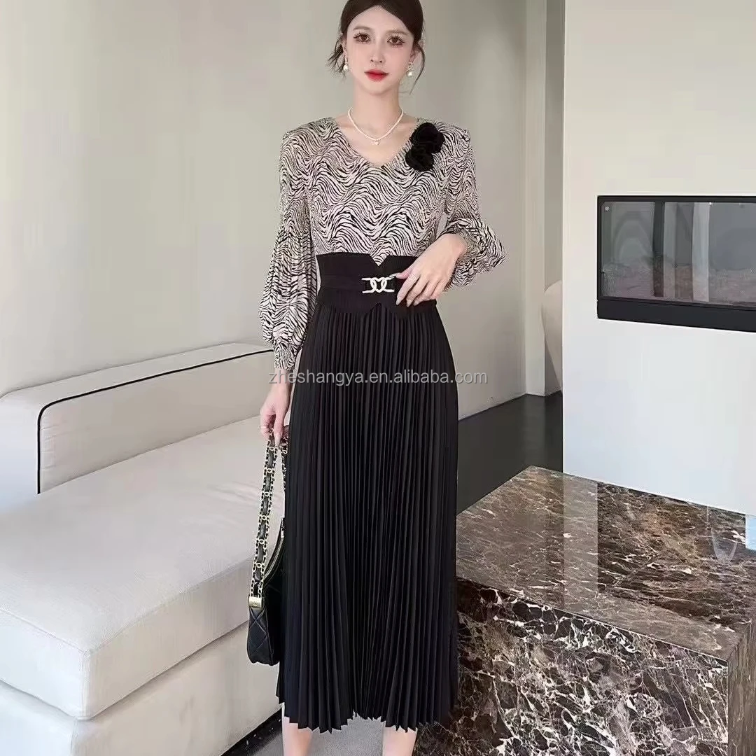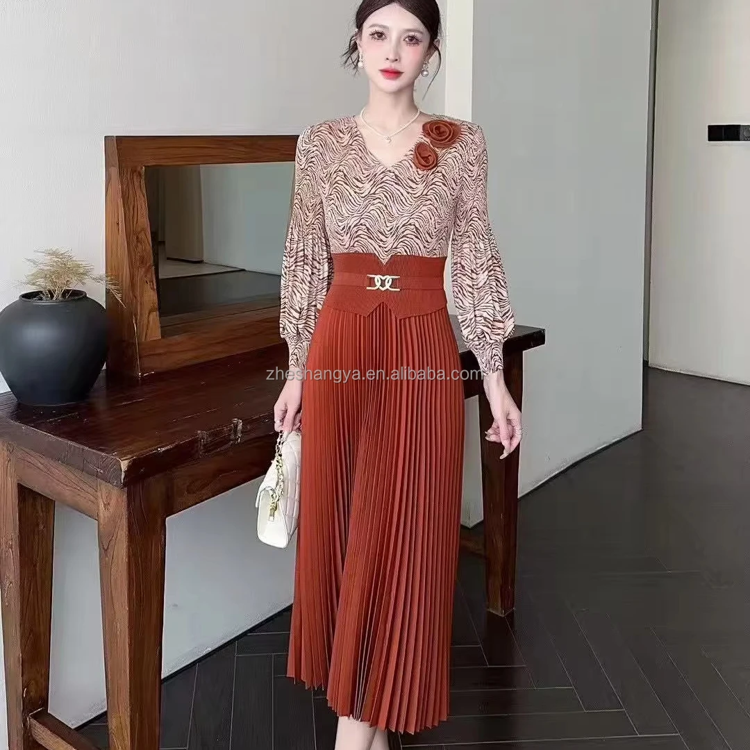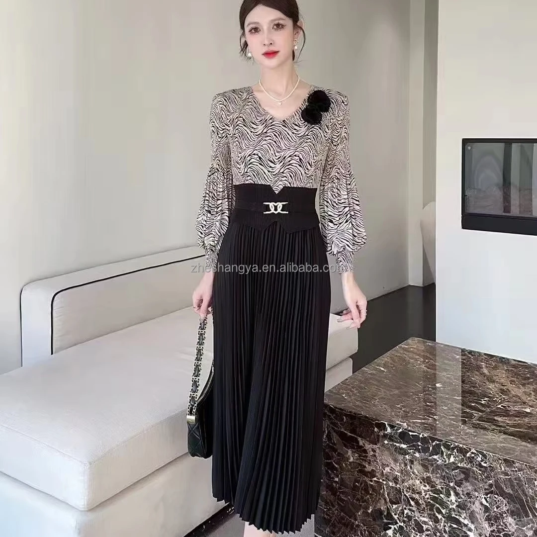 ZYHT 21541 Wholesale Crew Neck High Waist Casual Dresses Elegant Lace Velvet Mermaid Hem Ruched Long Sleeve Dresses for Women