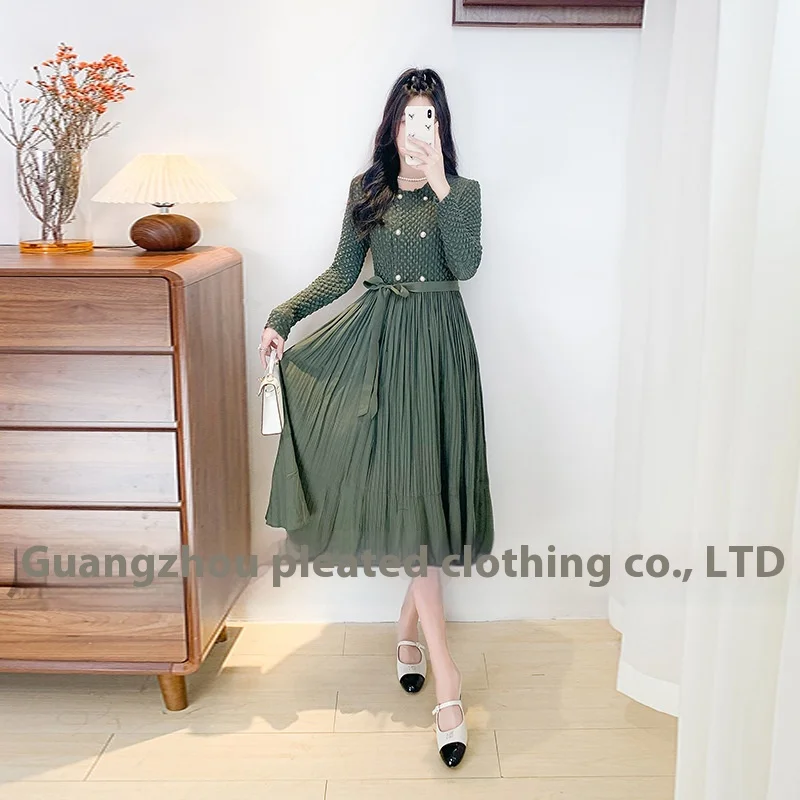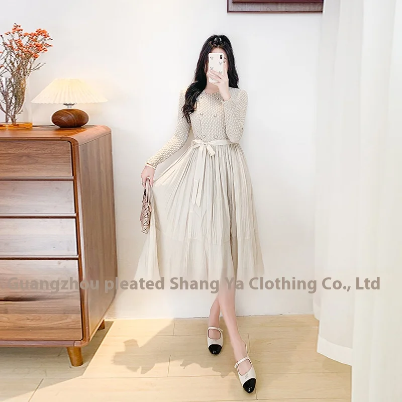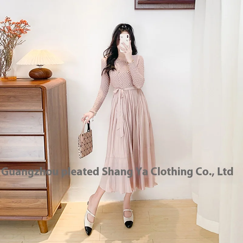 2025 Summer Joker Waist Dress Factory Direct Solid Color Lace-Up Stitching Pleated Skirt Casual Style Long Printed Chiffon
