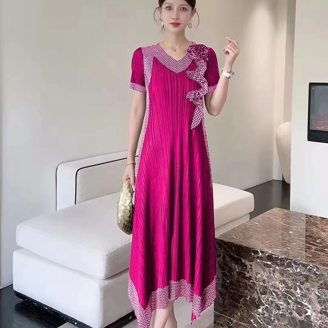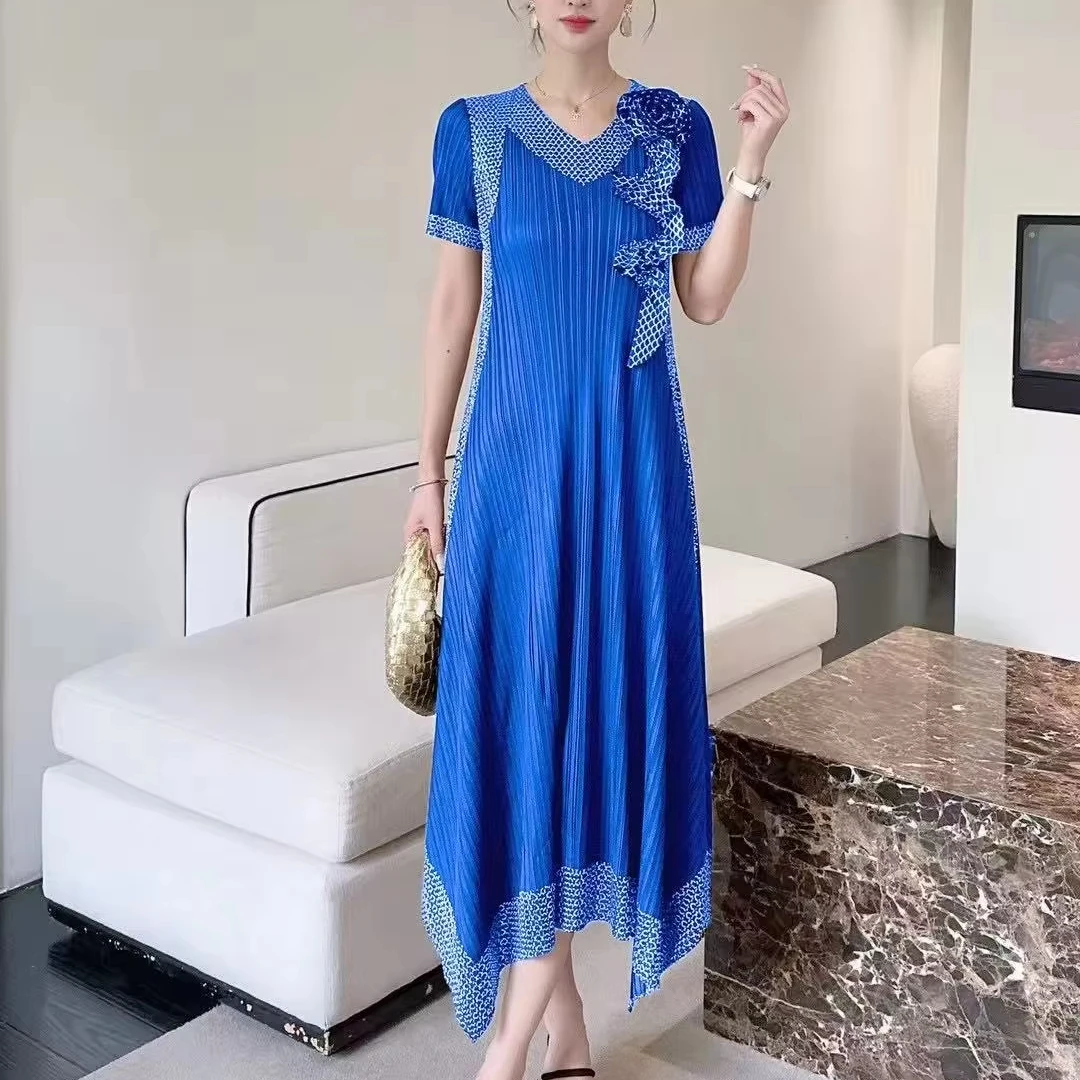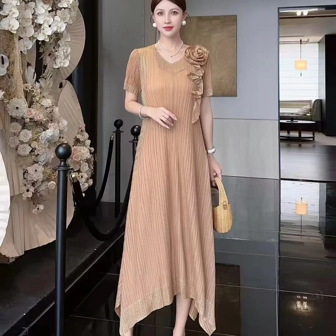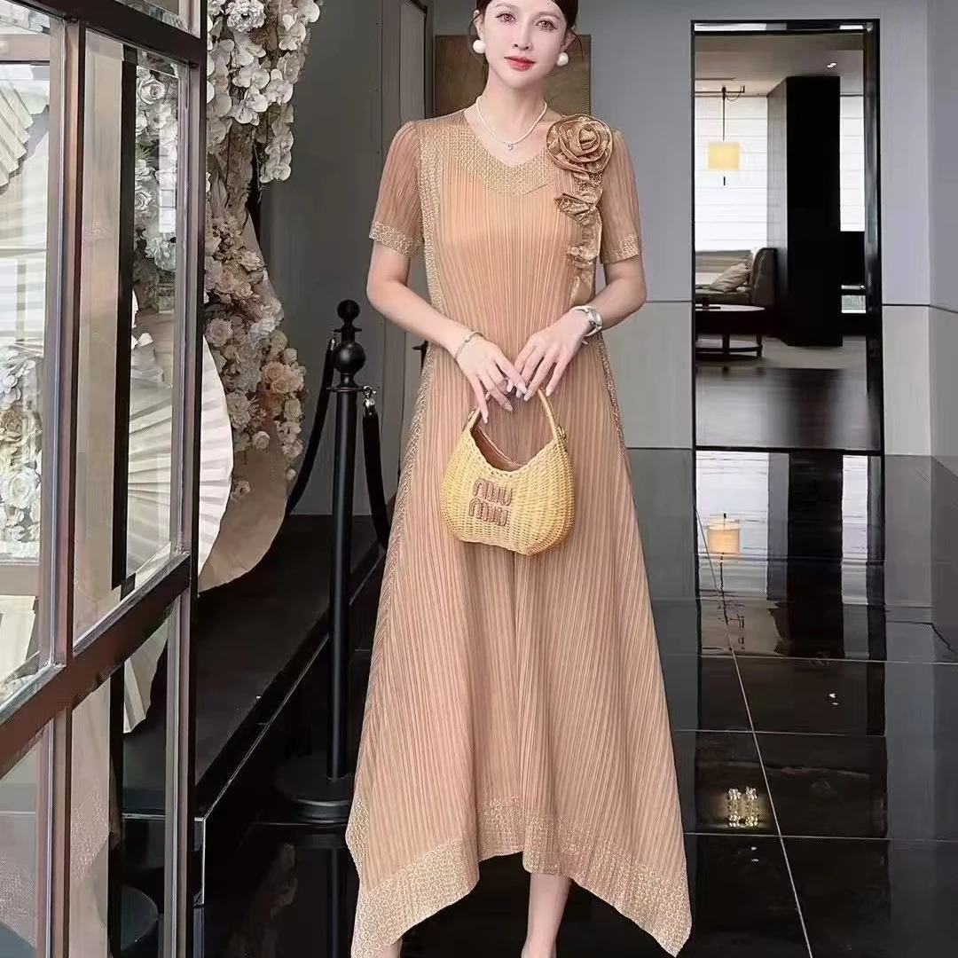 2025 Women's Retro Printed Pleated Dress Elegant Temperament Slim A-Line Midi Skirt Natural Waistline Long Casual Elegant Dress