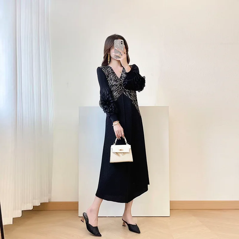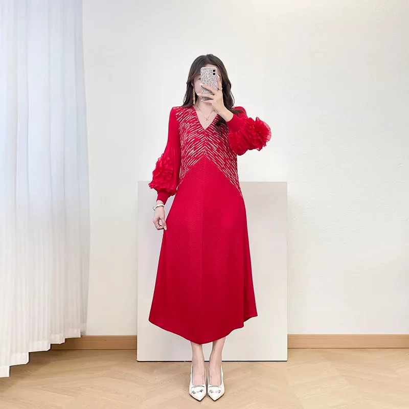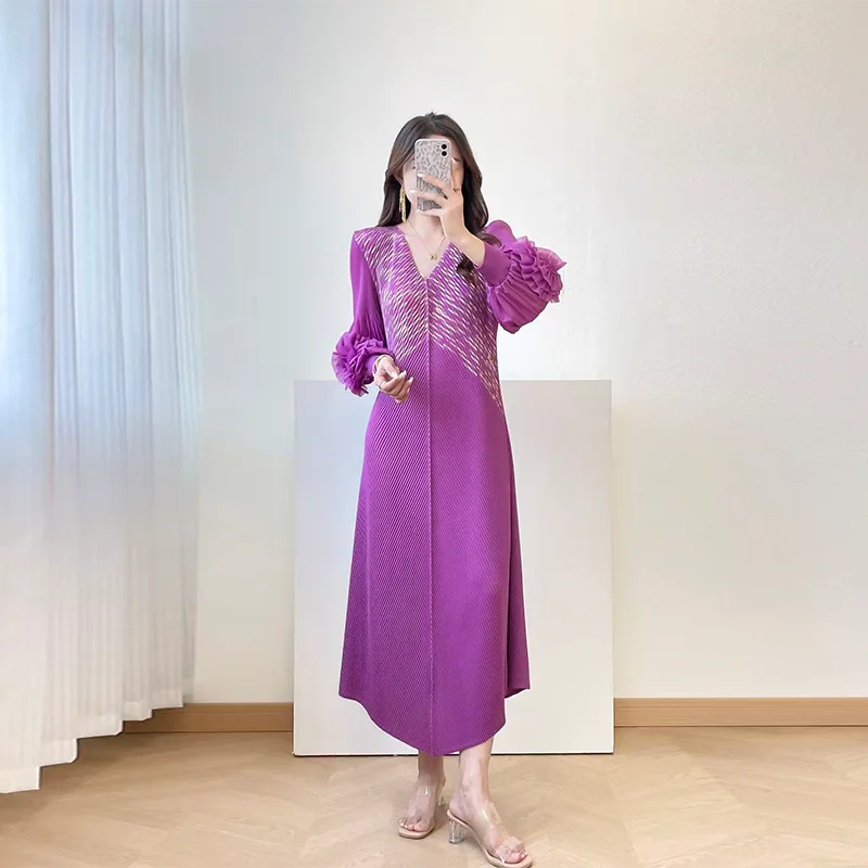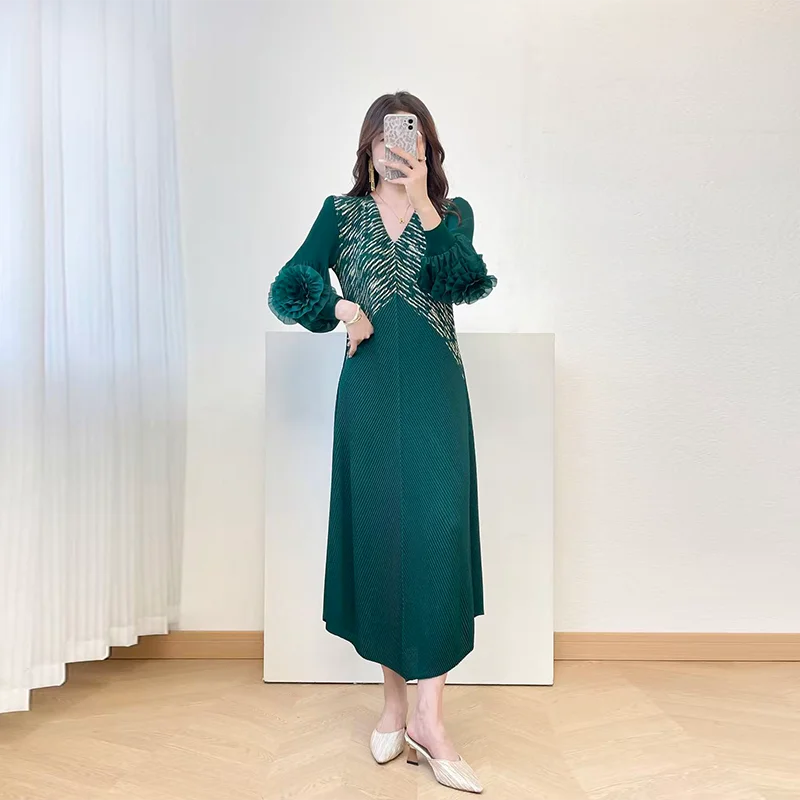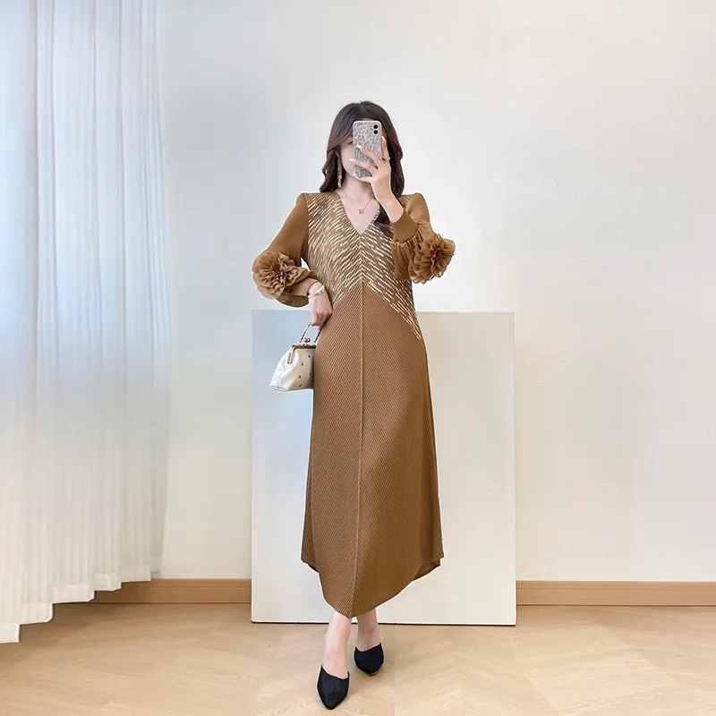 2025 Autumn New High-End Women's Pleated Dress Gilded Elegant Temperament Slim Petal Sleeves Breathable Midi Length Natural