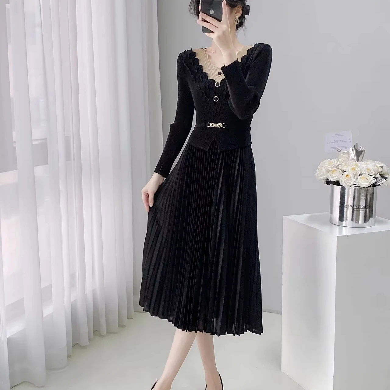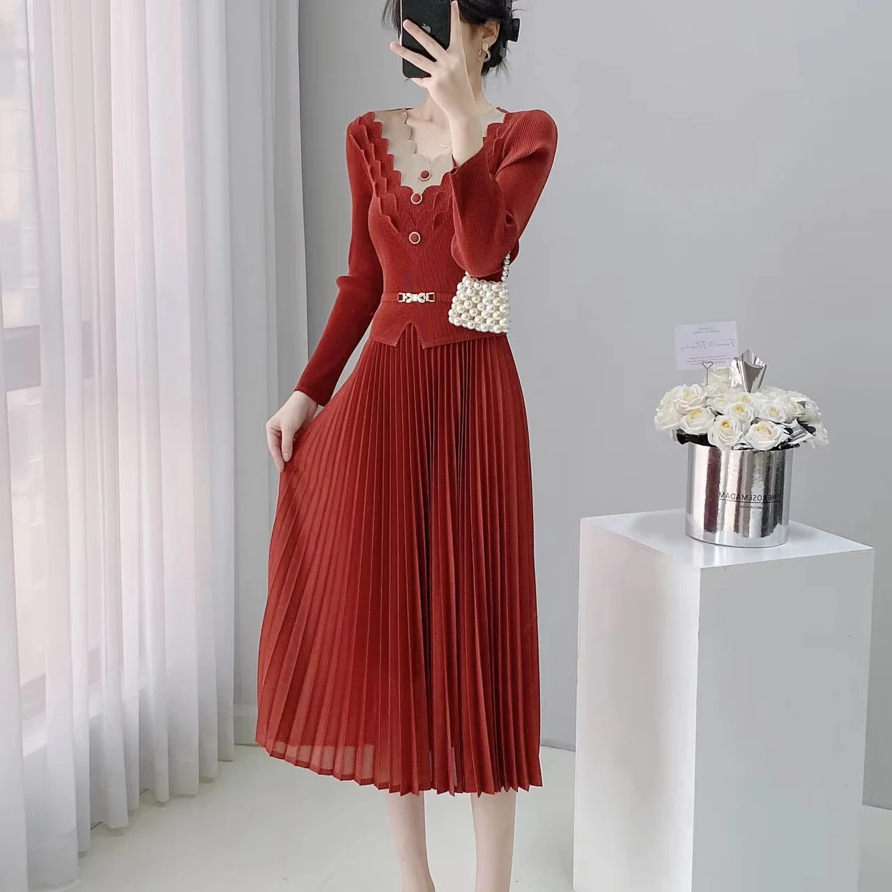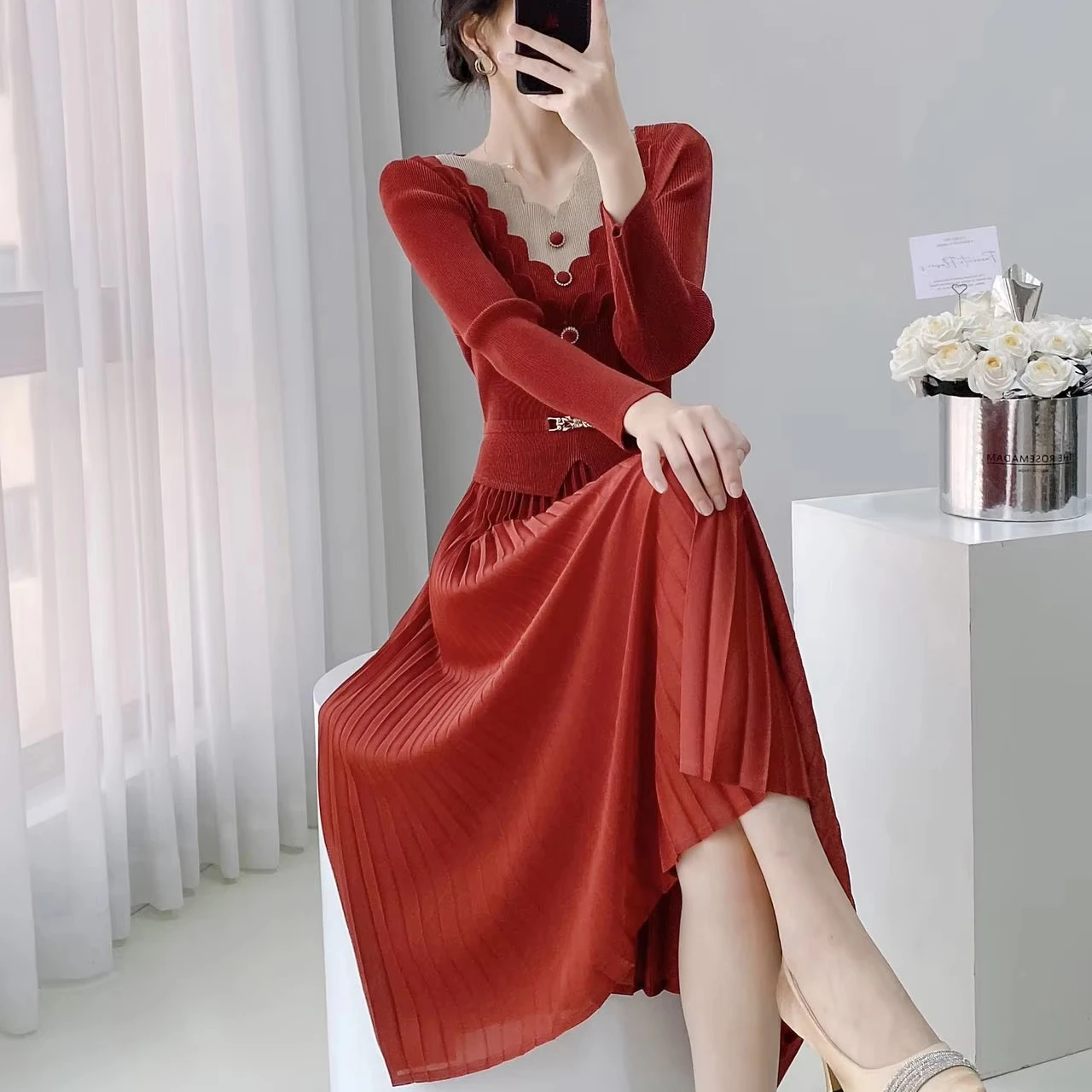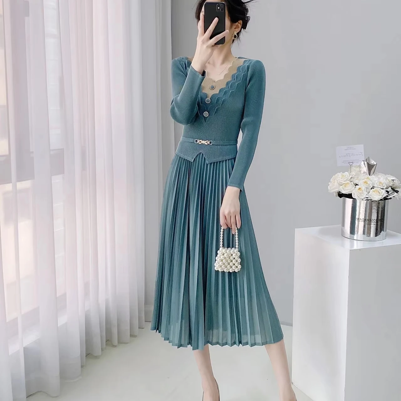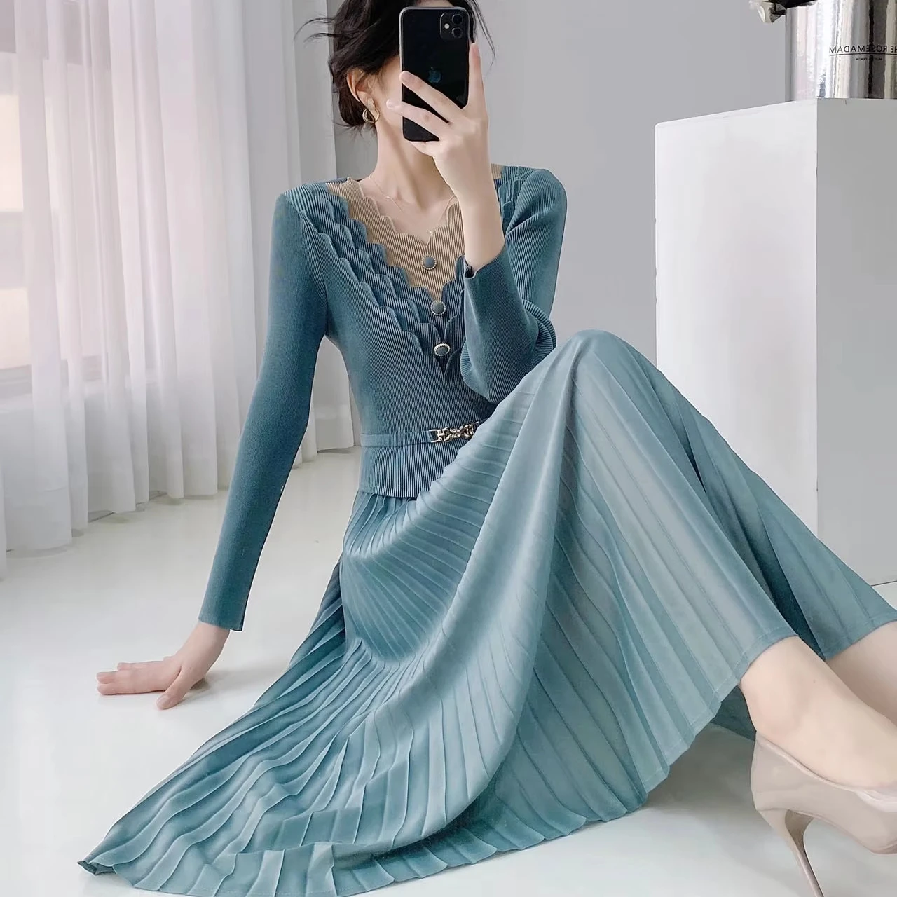 ZYHT 21541 Wholesale Crew Neck High Waist Casual Dresses Elegant Lace Velvet Mermaid Hem Ruched Long Sleeve Dresses for Women