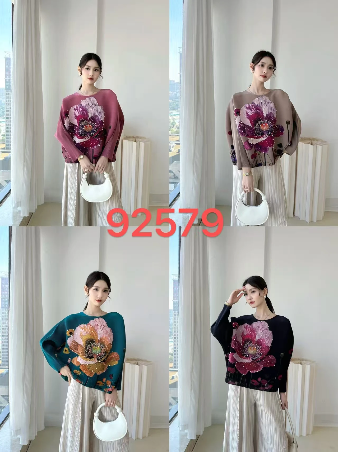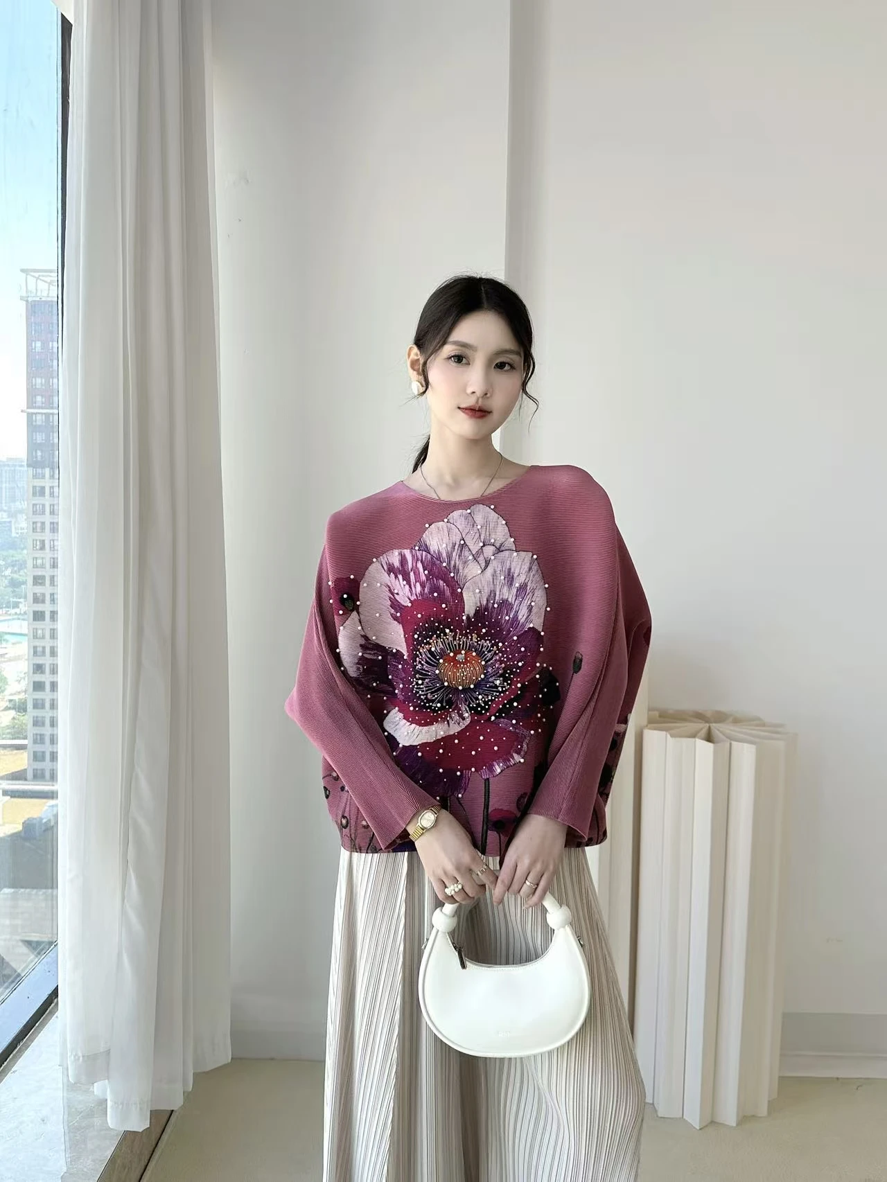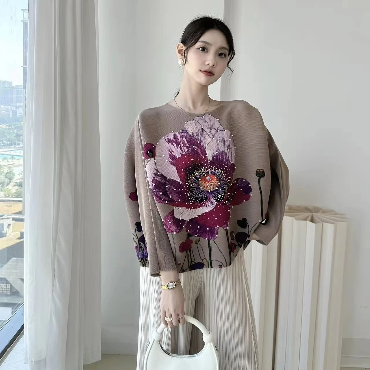2025 Autumn New Arrival Printed Crew Neck Loose Versatile Top Beaded Pleated Slim-Fitting Long Sleeve T-Shirt for Women