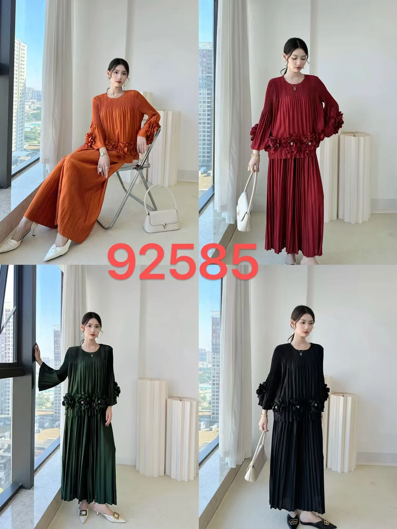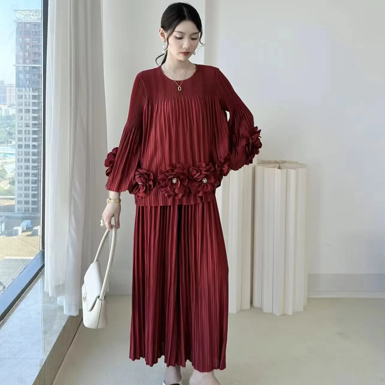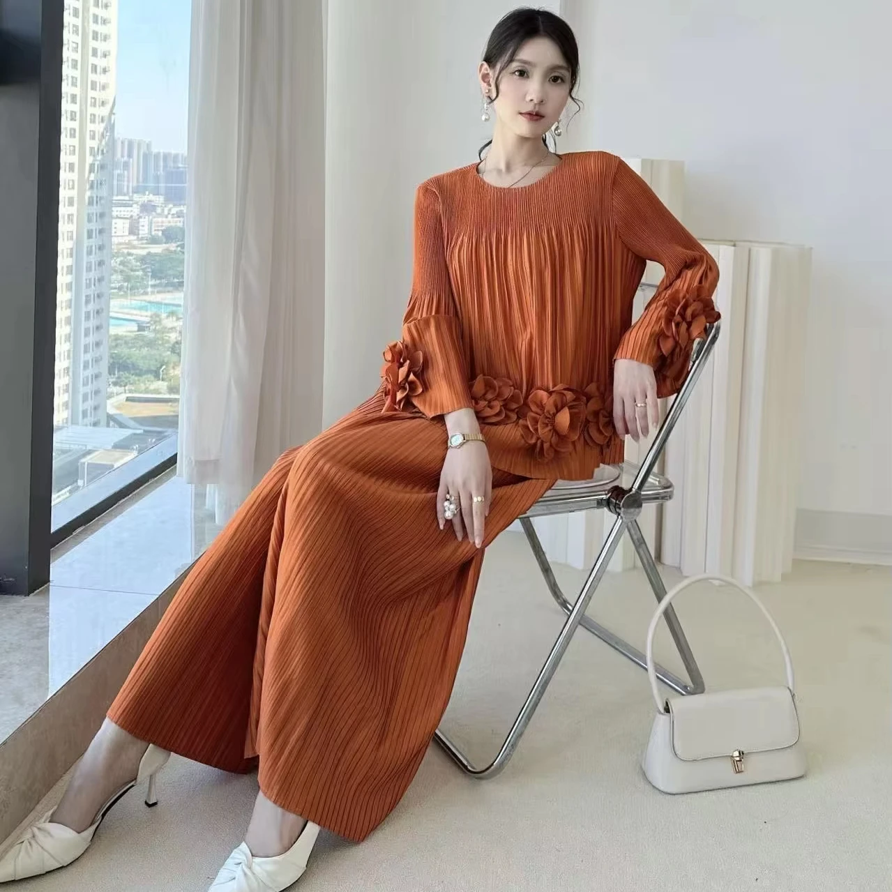 Factory Direct Supply 2025 Winter New Arrival French Style 3D Floral Long Sleeve Two-Piece Set Solid Color Pleated Pantsuit