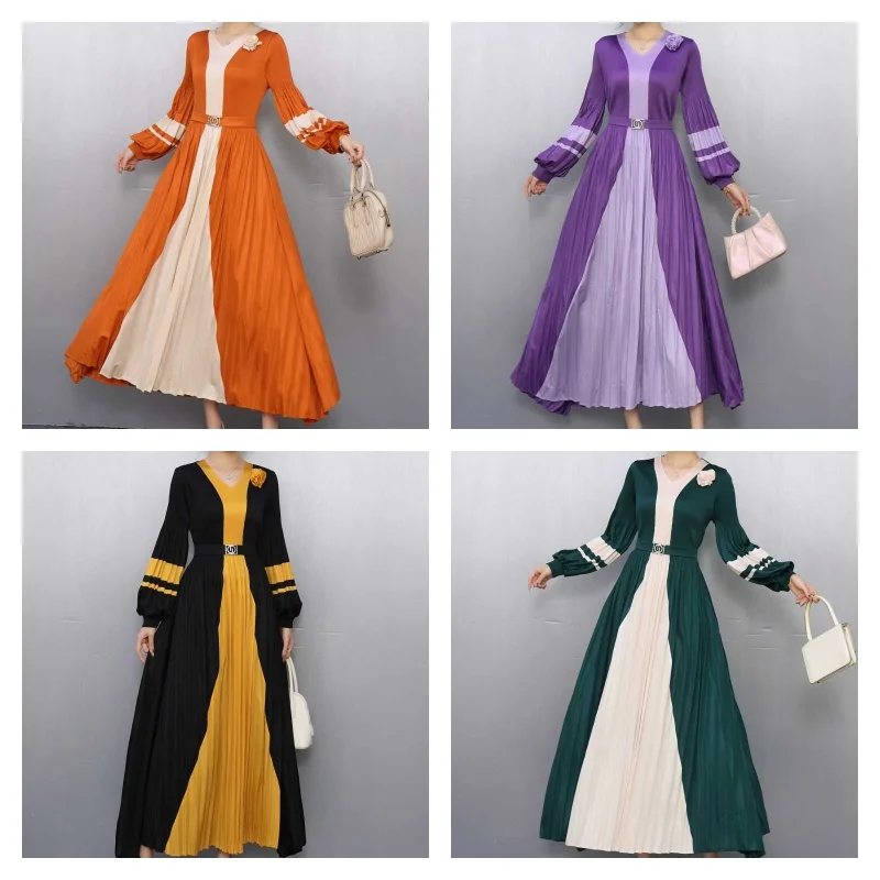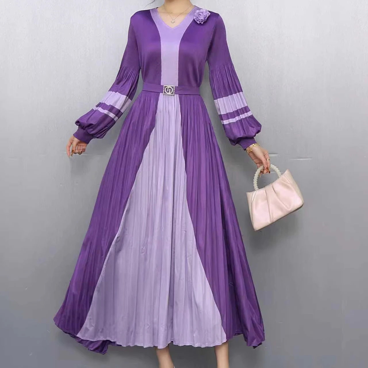 Factory Direct Sale 2025 Autumn New Women's Pleated Color-Block Maxi Dress | Long-Sleeve Belted Elegant Party Gown