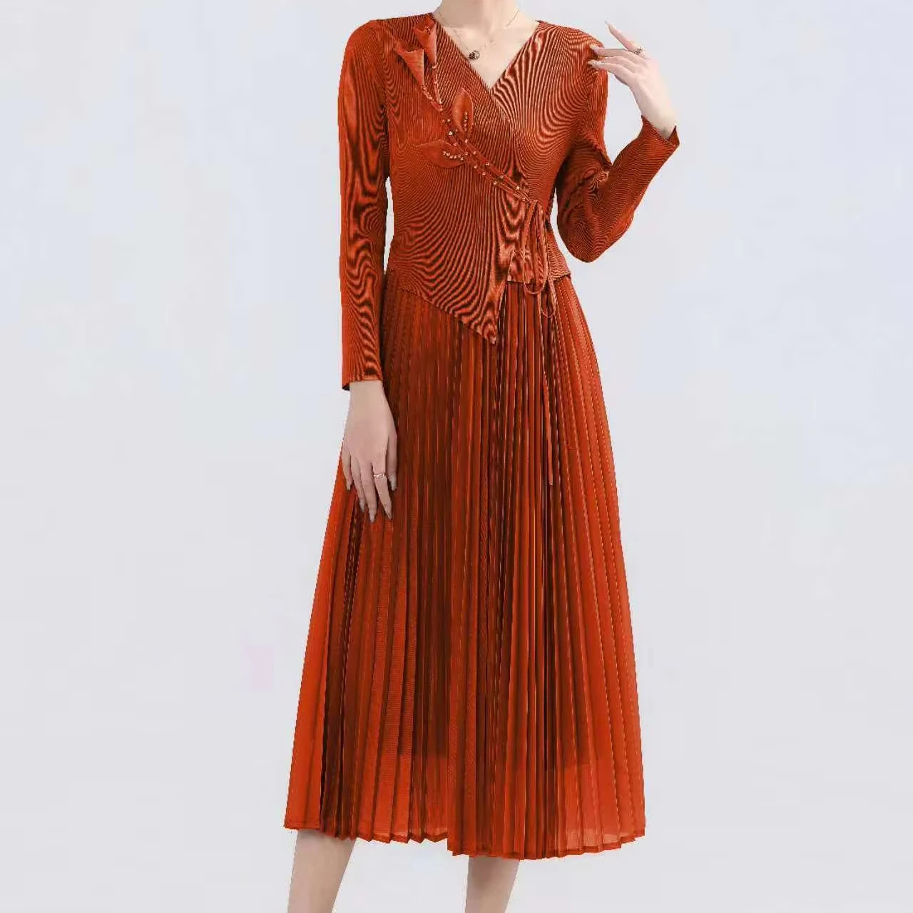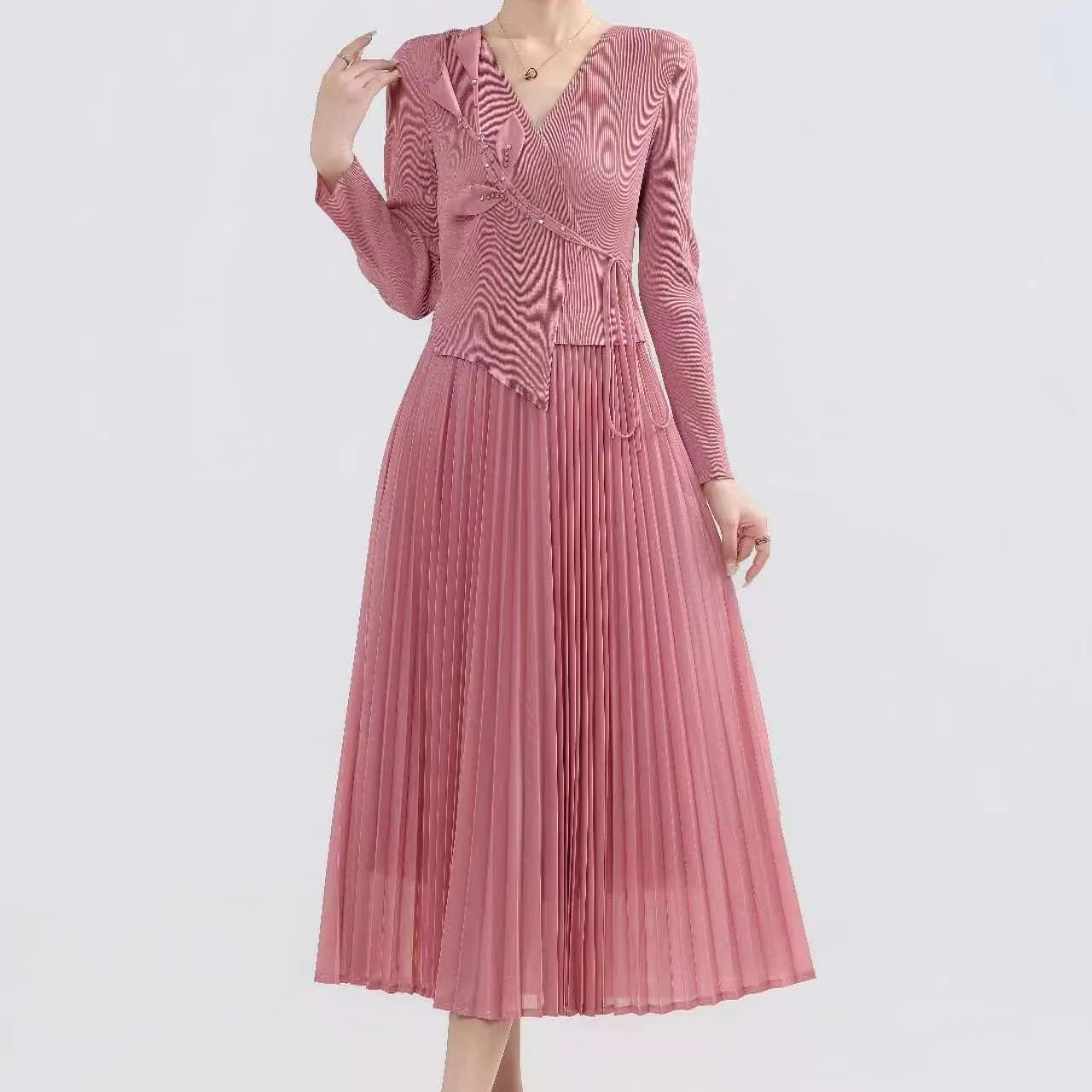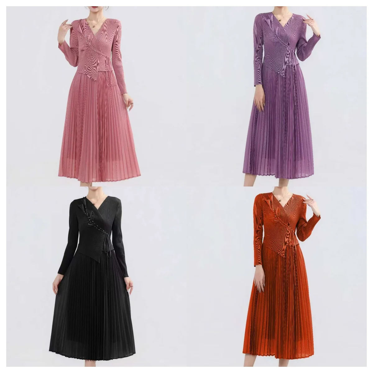 Factory Direct 2025 A/W V-Neck Solid Color Pleated Dress, Loose Fit Slimming and Elegant Women's Dress