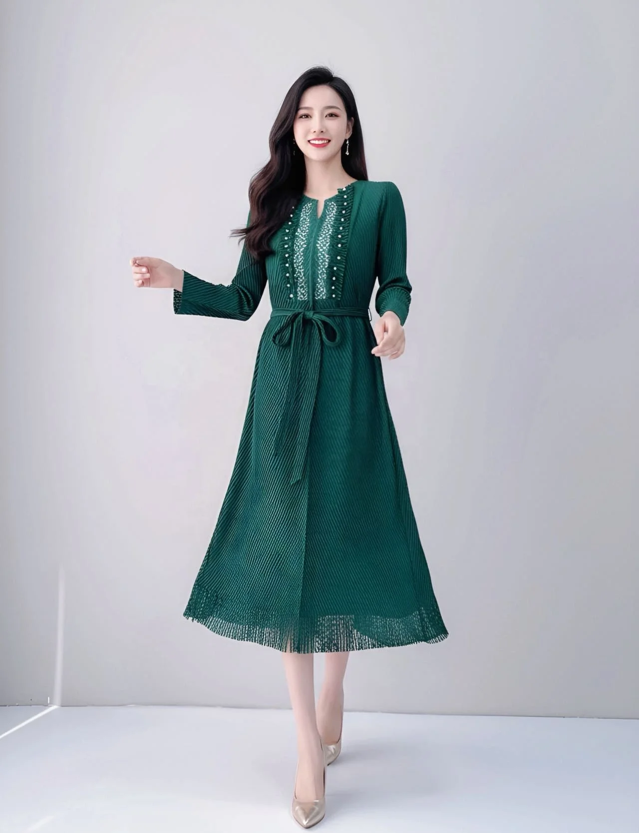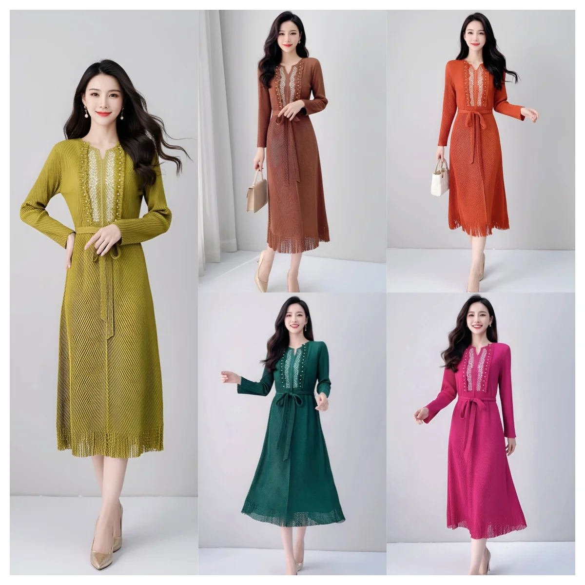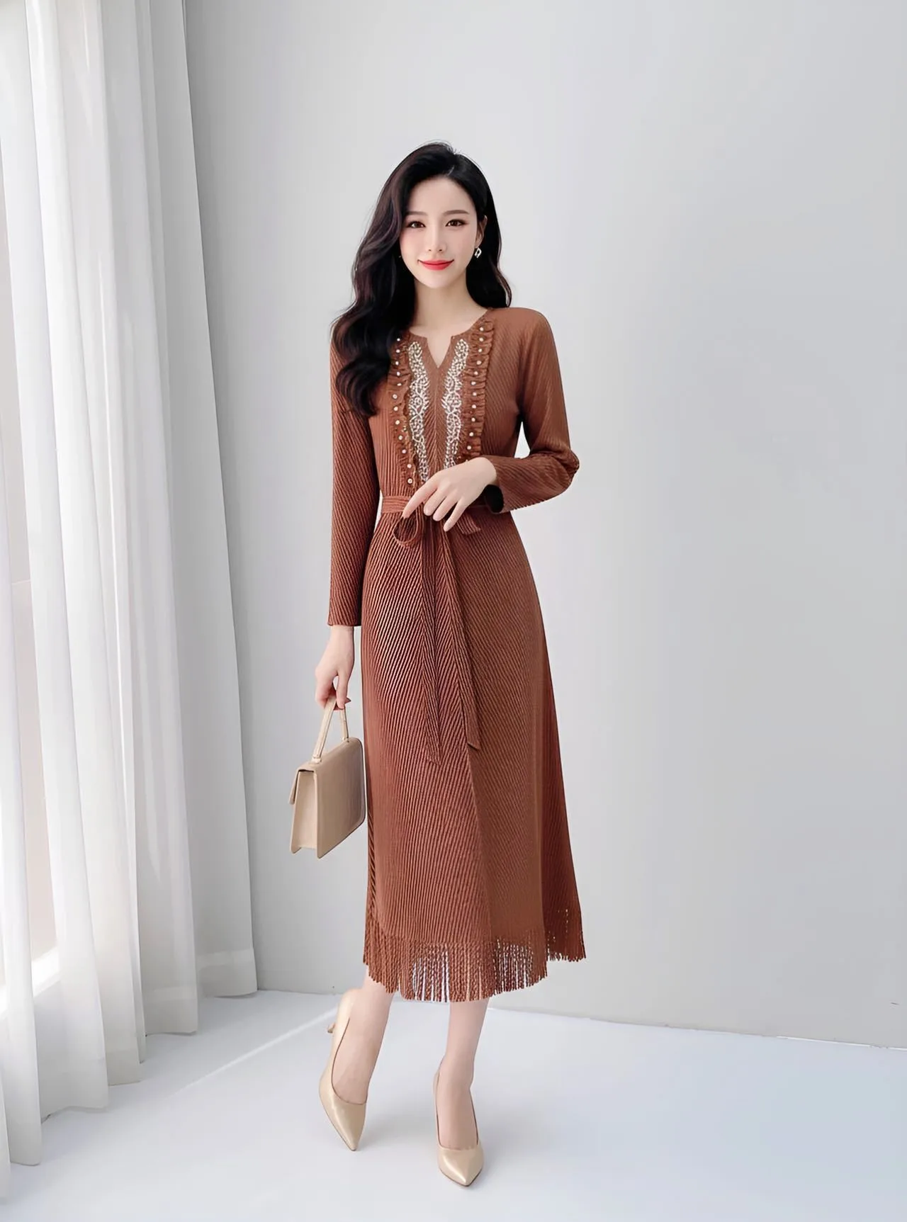 Factory Direct 2025 A/W Fringe & Beaded Dress with Pleated Tie-Waist