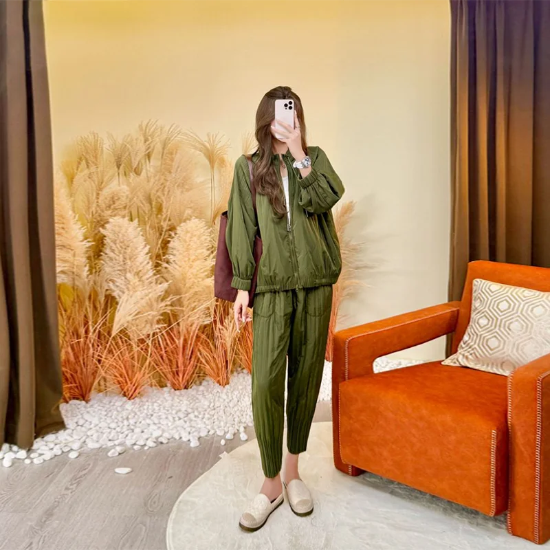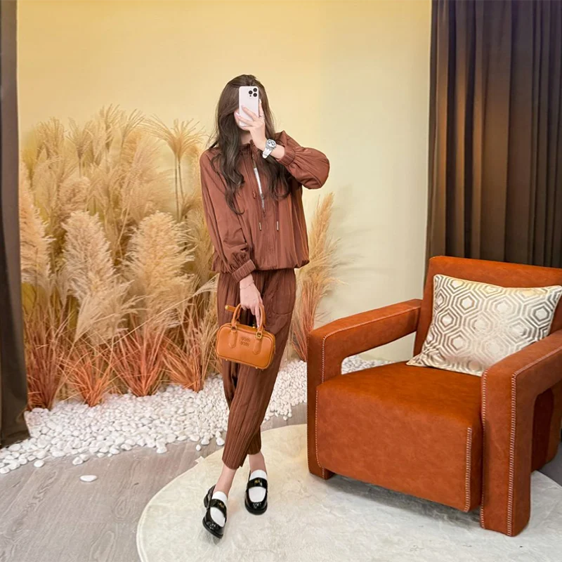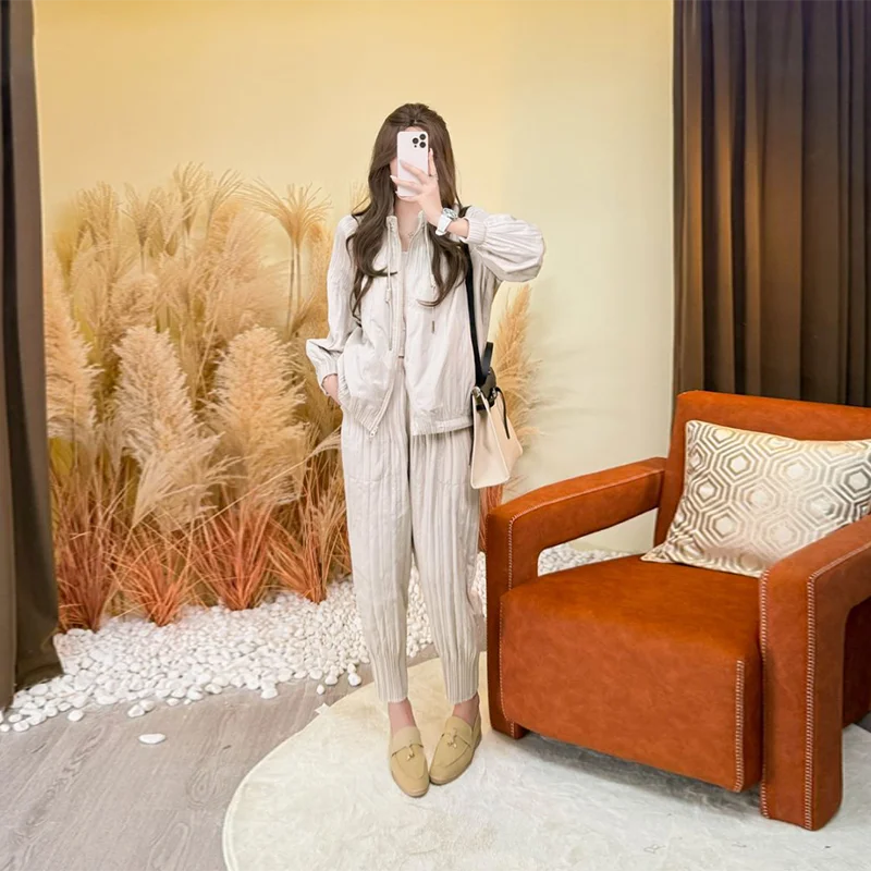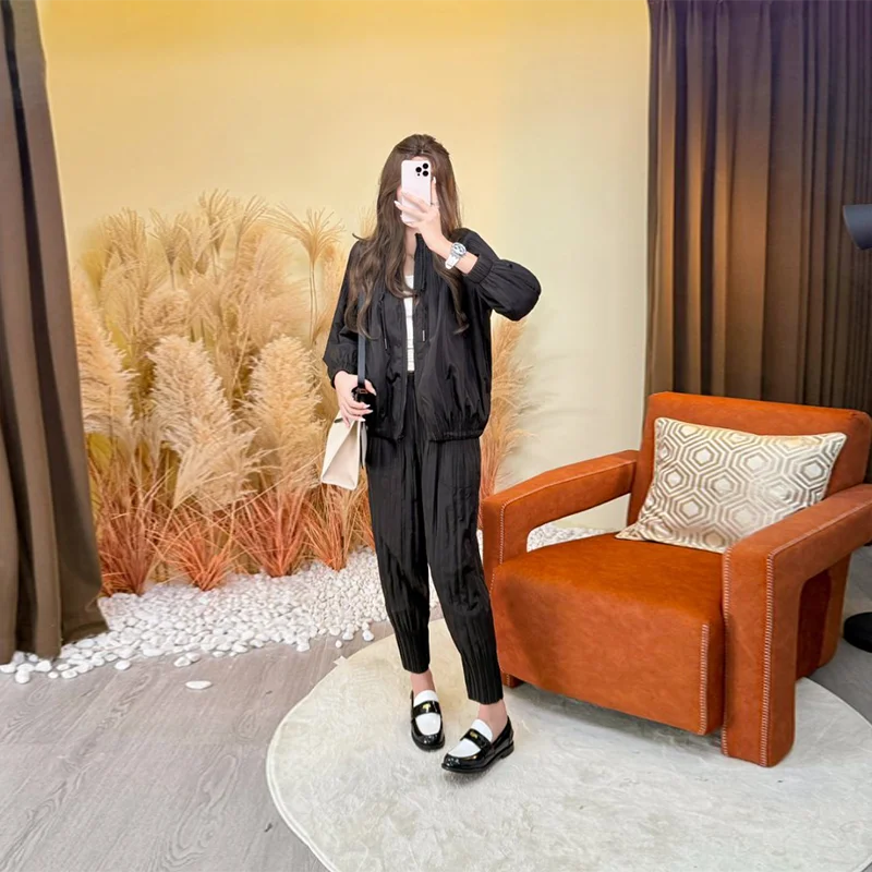 Factory Direct 2025 Autumn New Premium Pleated Versatile Casual Set, Women's Zippered Top and Pants