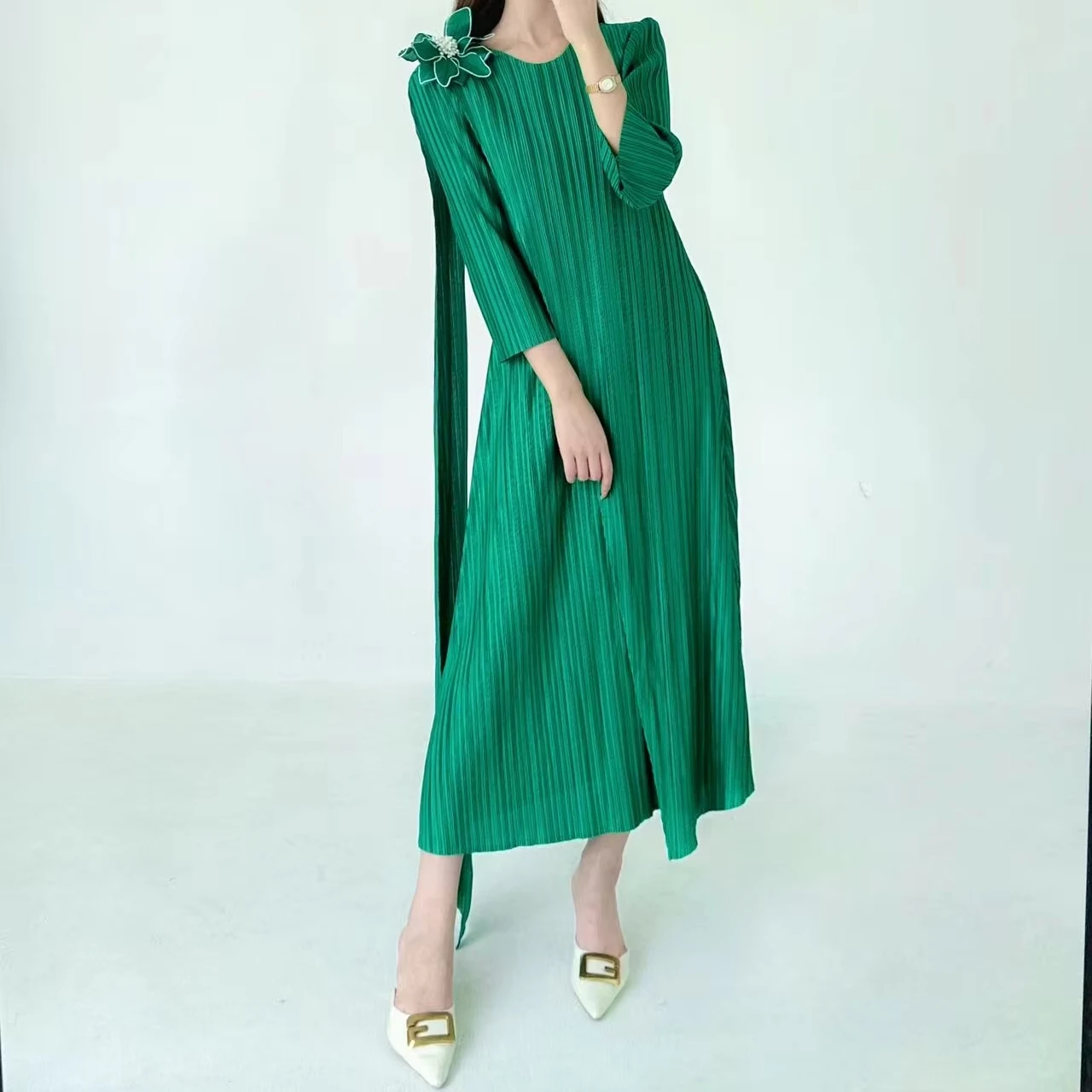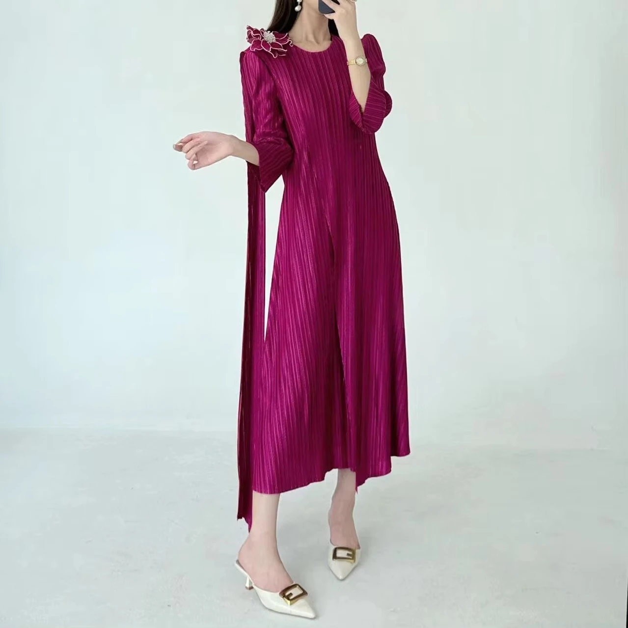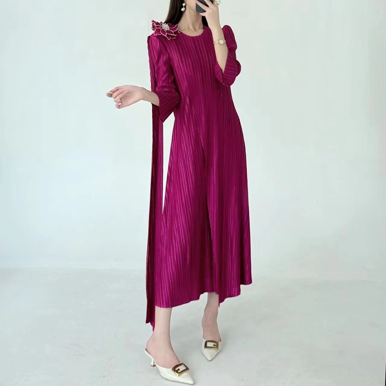 2025 Autumn New Women's Dress Large Size Pleated Neck Slim Three-Dimensional Flower Age Reduction Style Breathable Midi Length