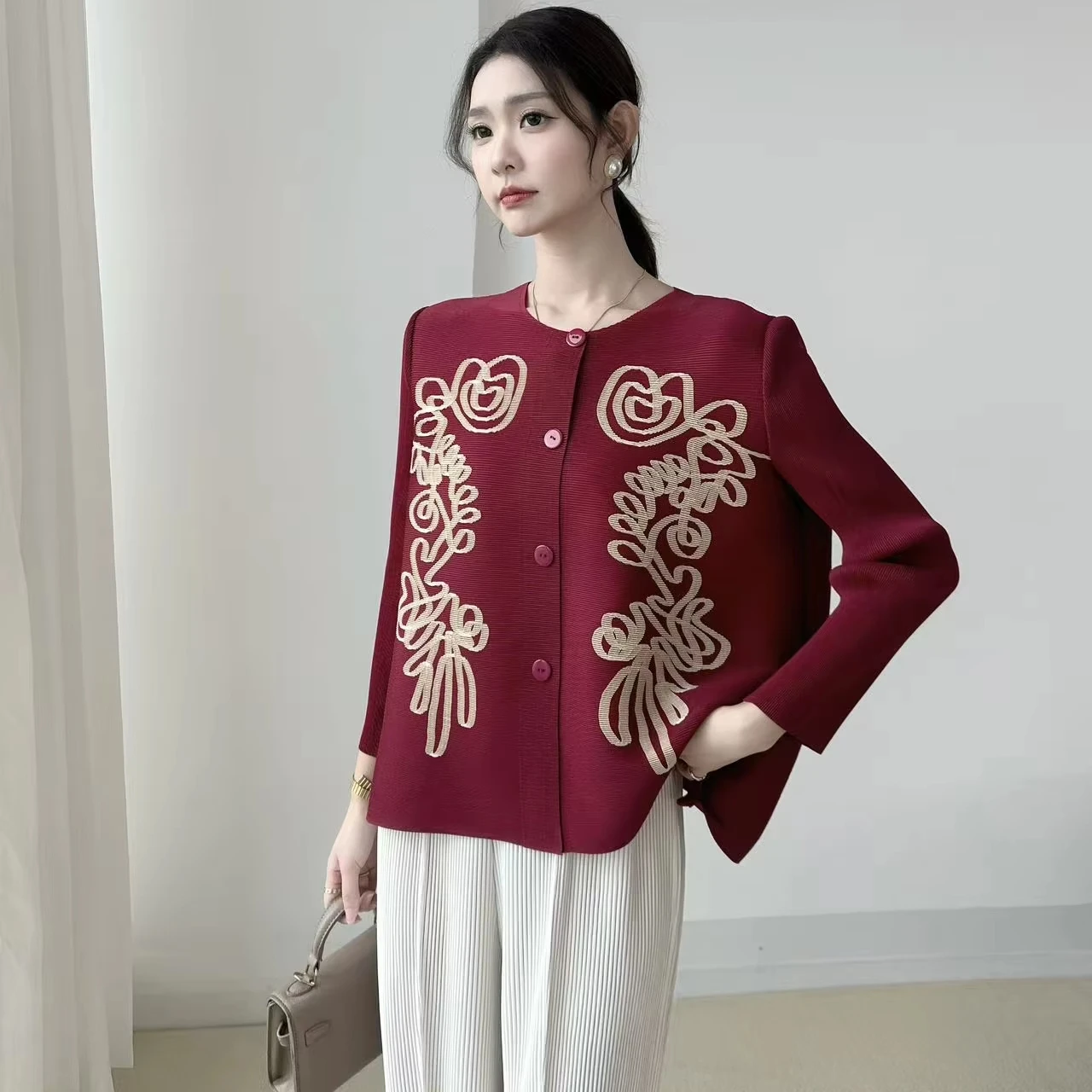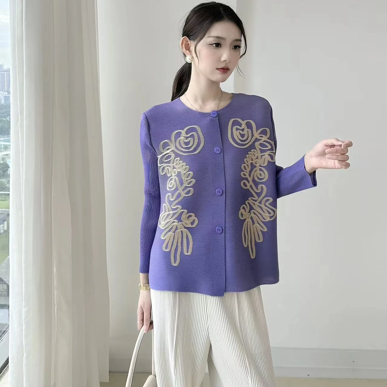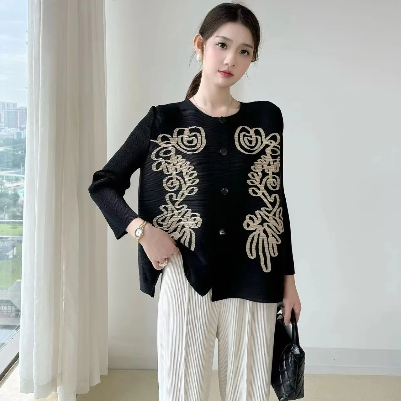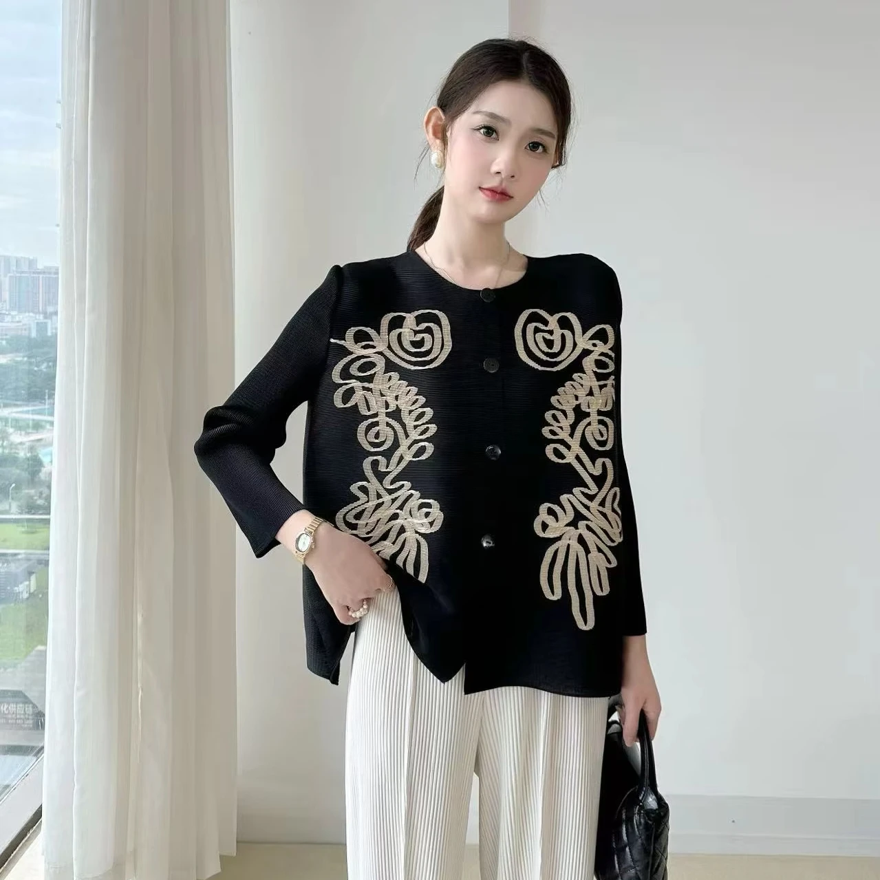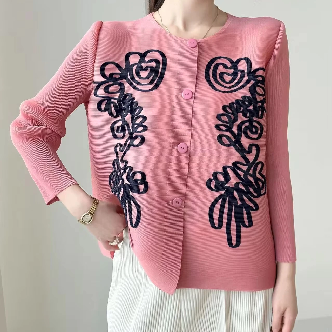 2025 Autumn Collection Women's Casual Top New Printed Pleated Joker Round Neck Button Cardigan
