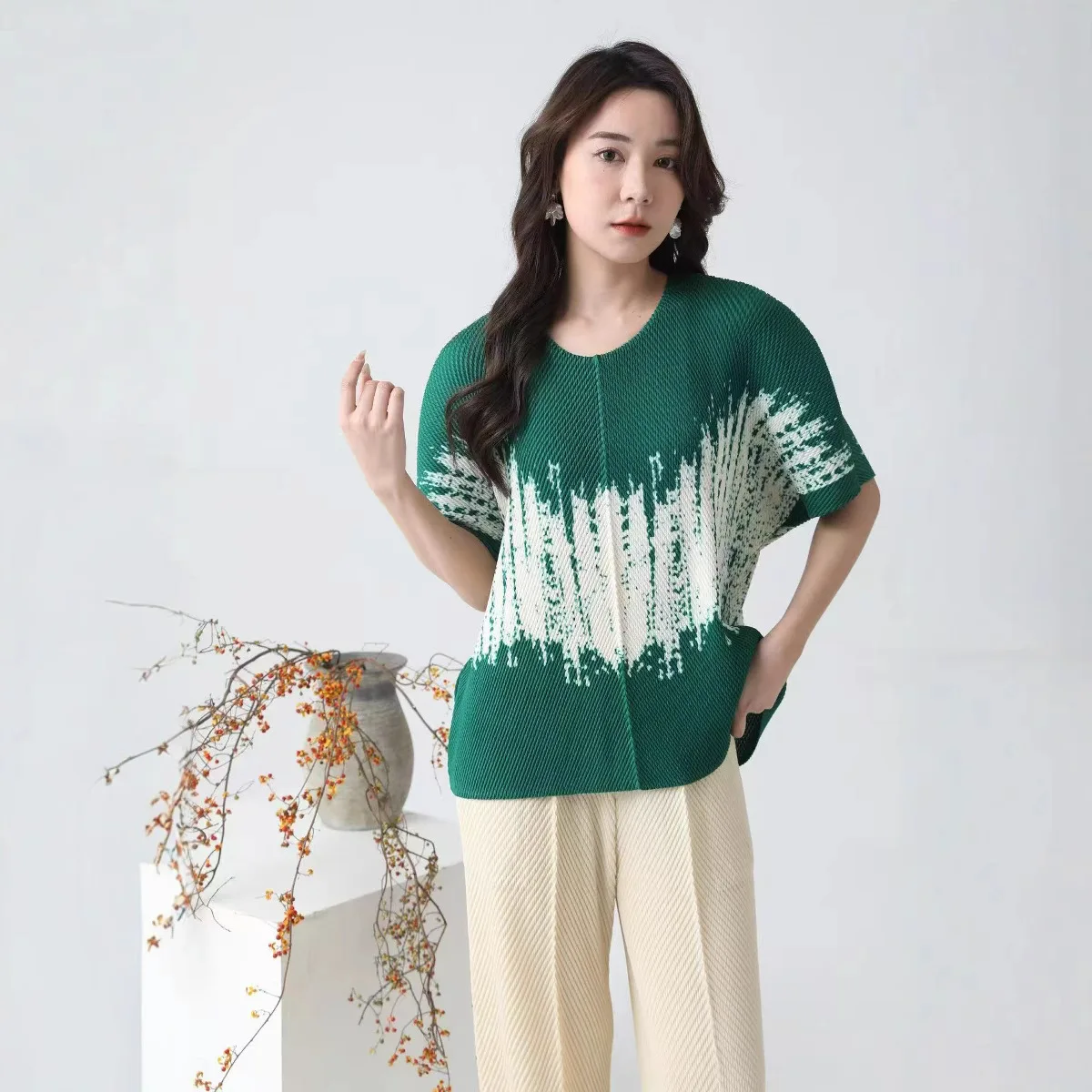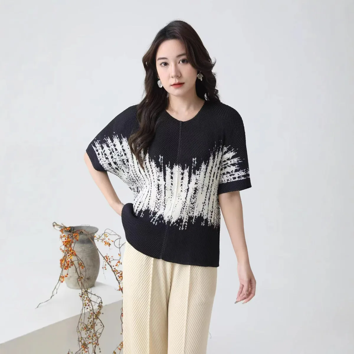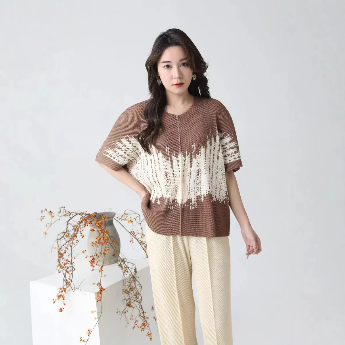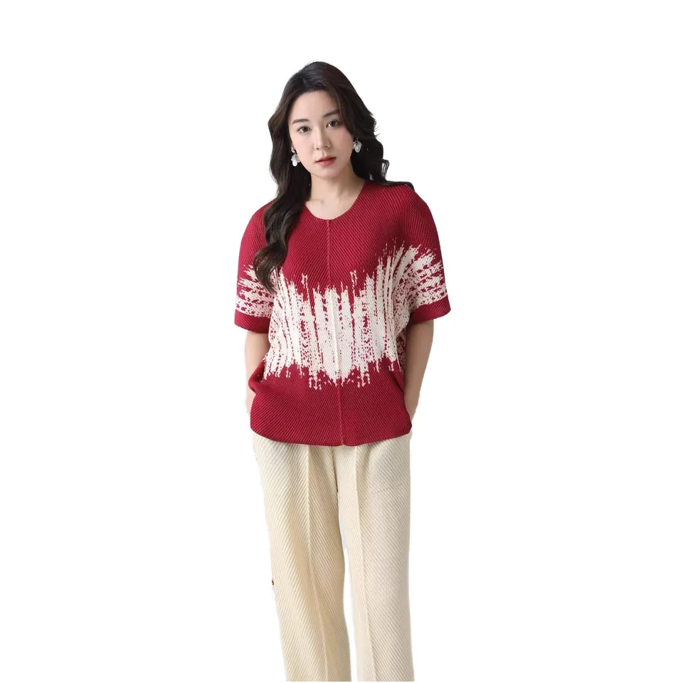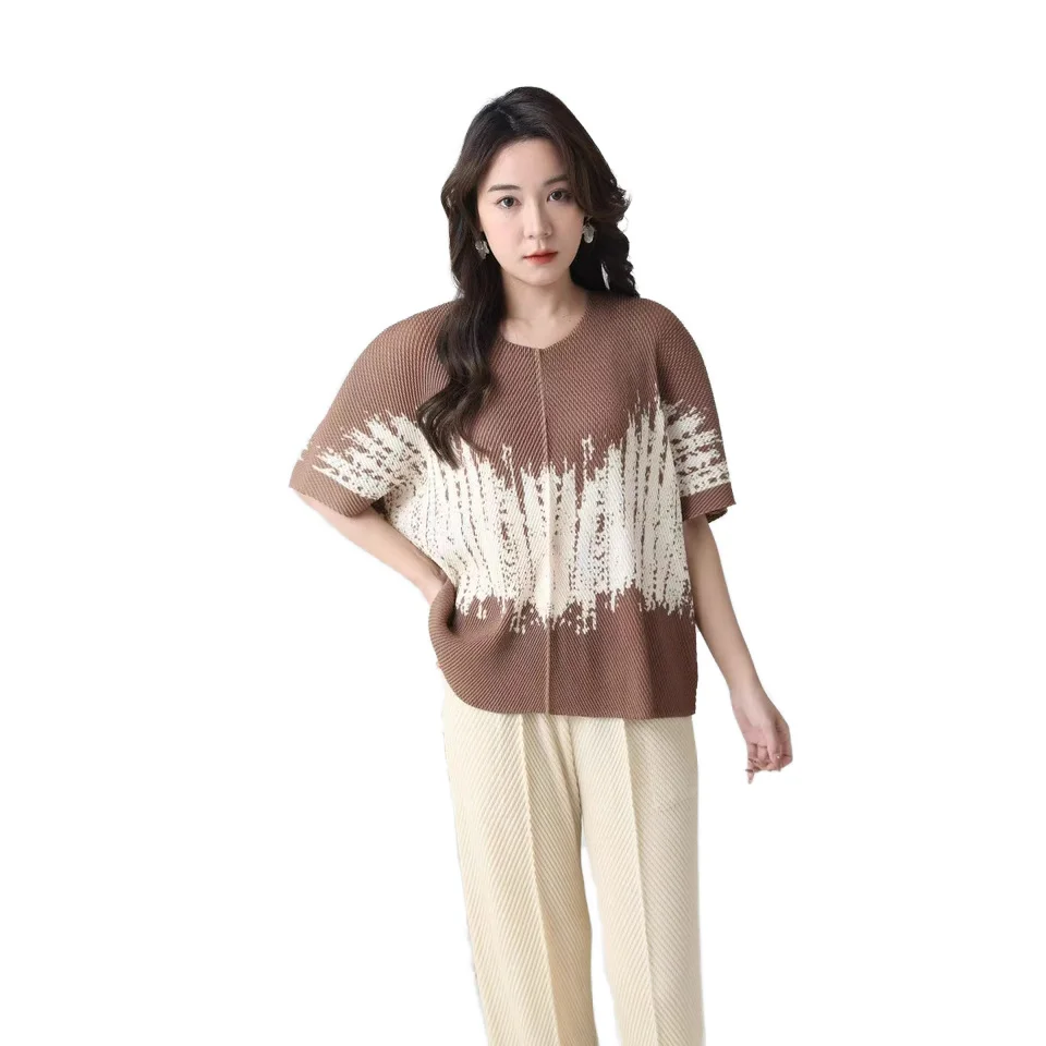 2025 Summer New Joker Fashion Elegant Simple Temperament Printed Pleated Jacket Factory Direct Supply for Women's T-Shirts Loose