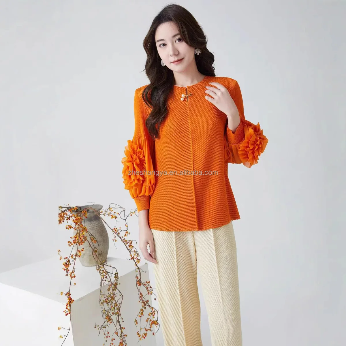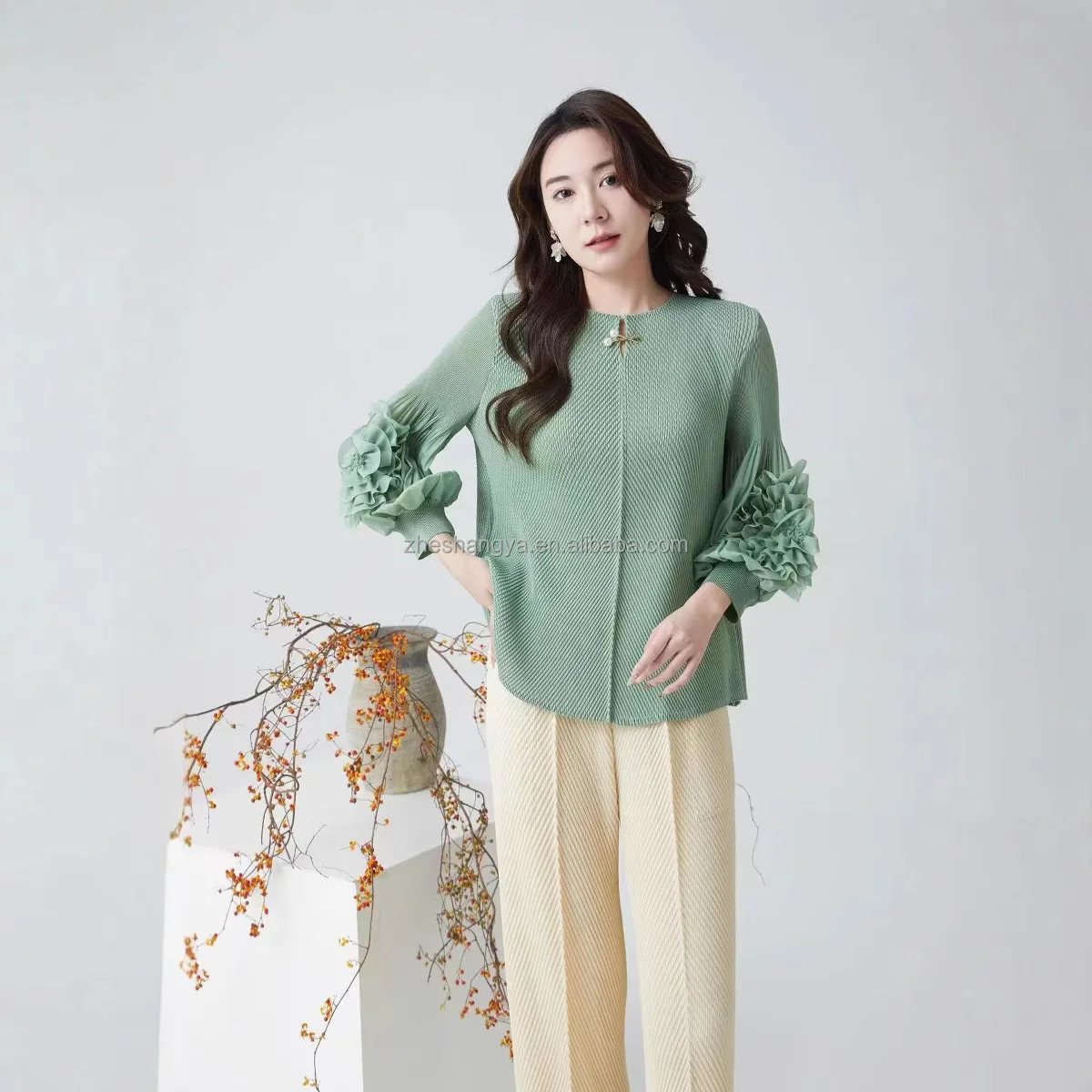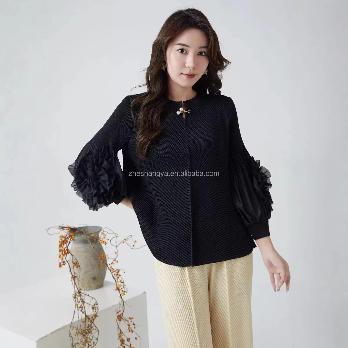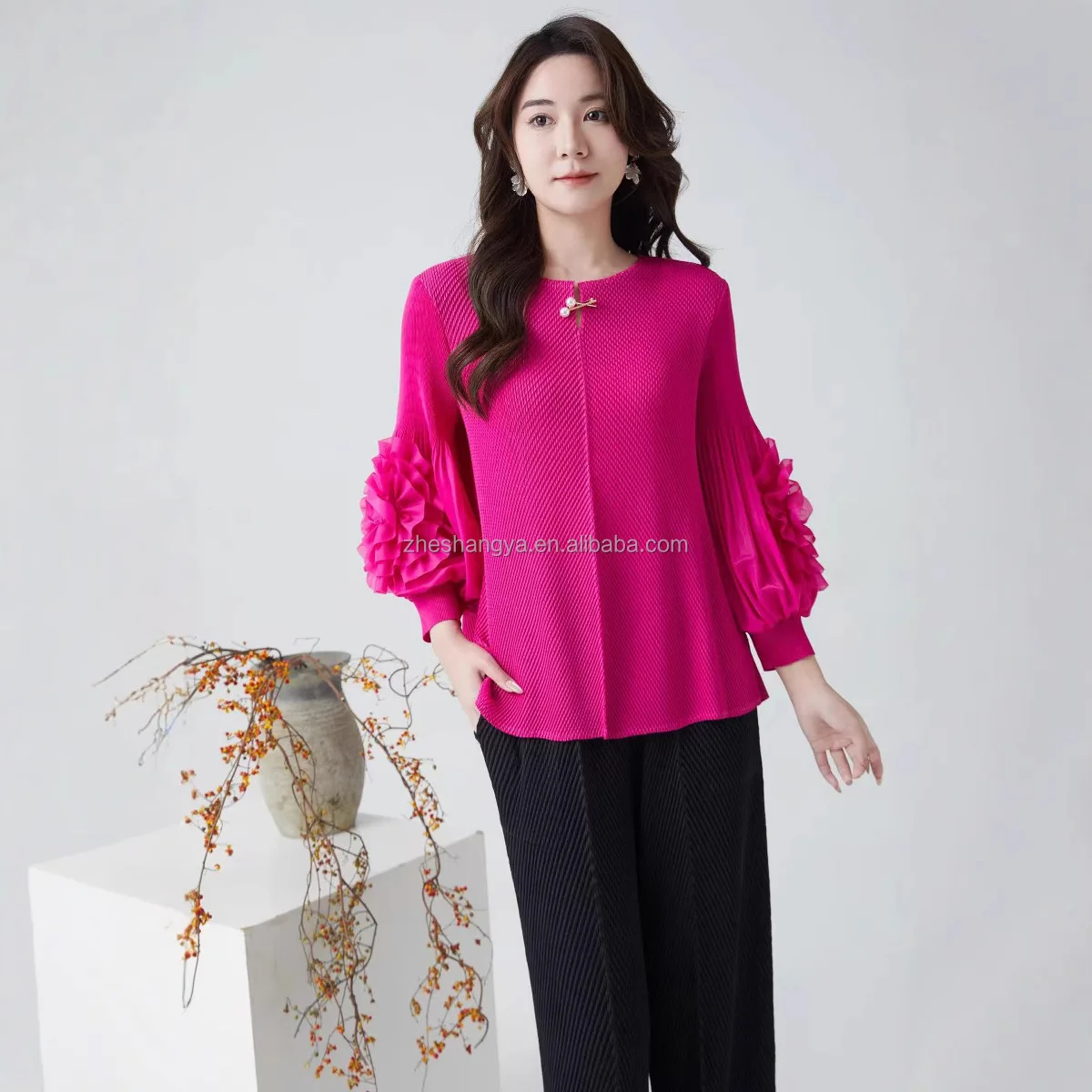 Miyake Pleat Women's Large Size Slim Pleat Top with Floral Sleeve New Design Long Lin Pleat T-Shirt