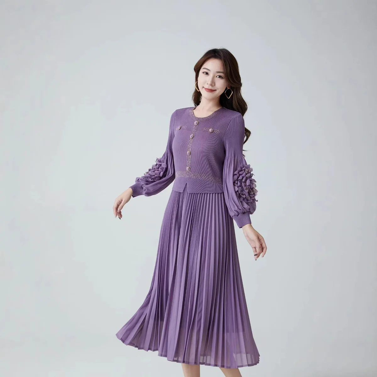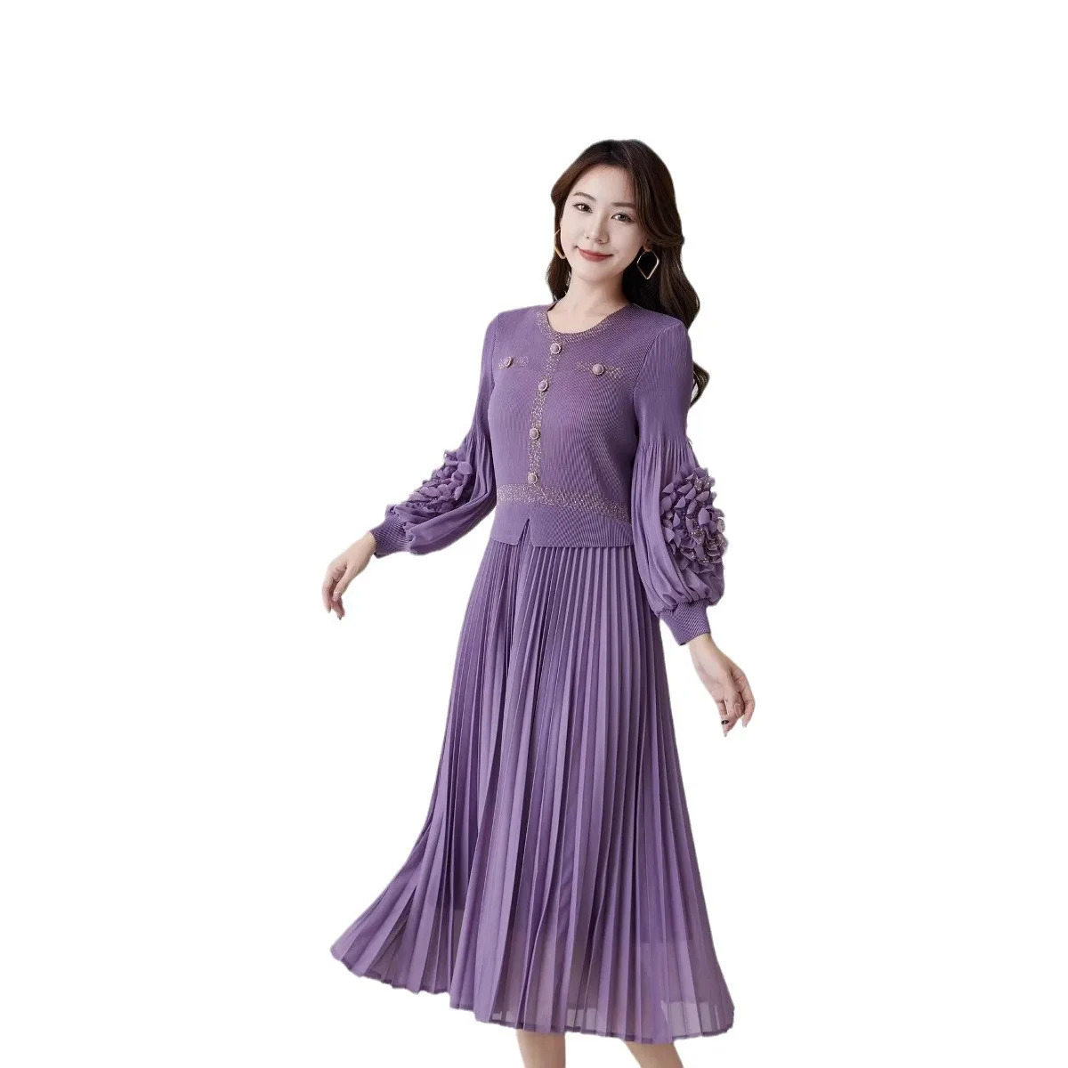 2025 Elegant Summer Midi Pleated Dress with Round Neck Casual Party Style Washable Woven Factory Direct Pleated Skirt