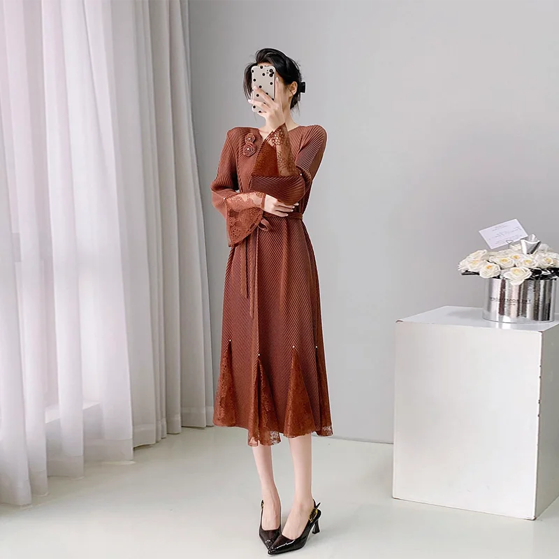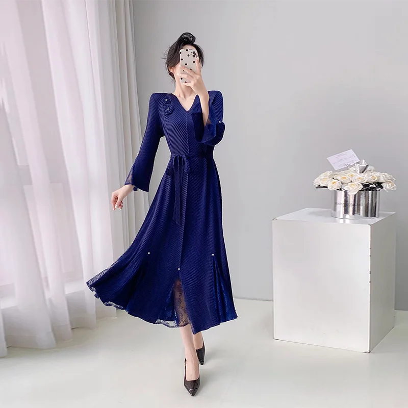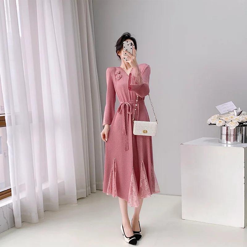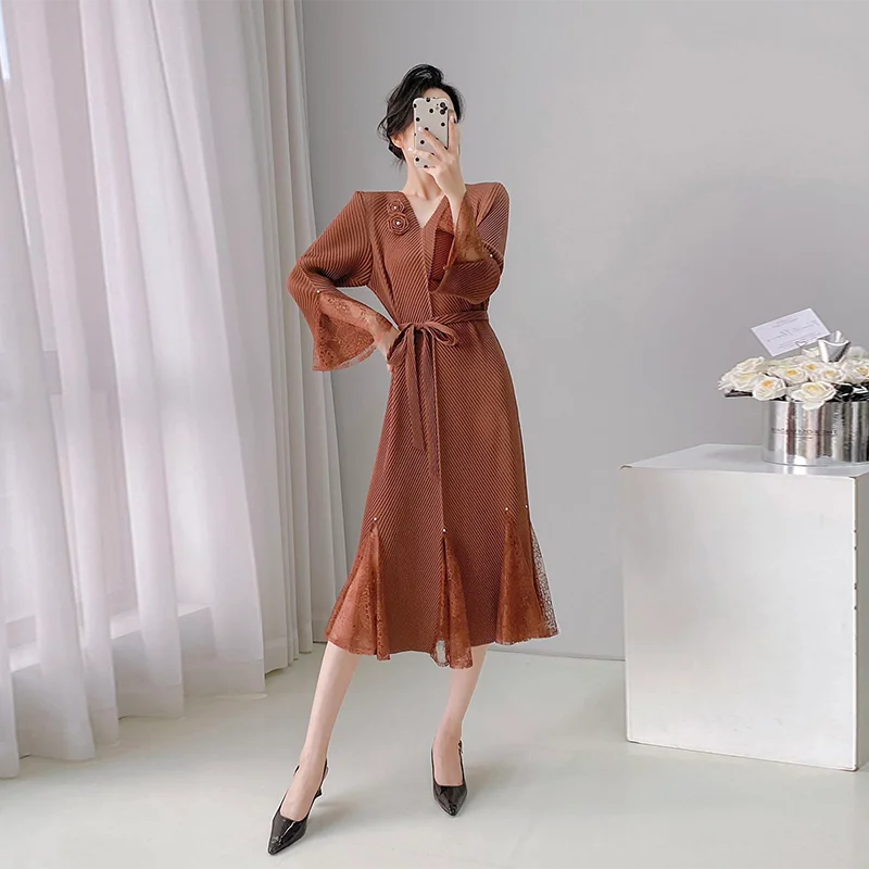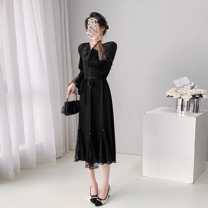 ZYHT 21541 Wholesale Crew Neck High Waist Casual Dresses Elegant Lace Velvet Mermaid Hem Ruched Long Sleeve Dresses for Women