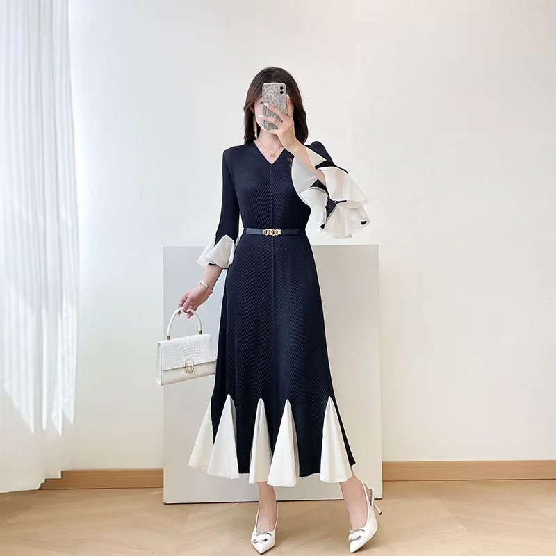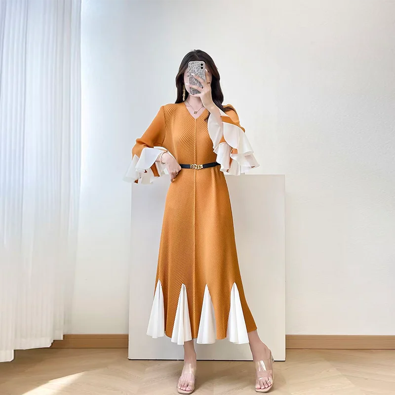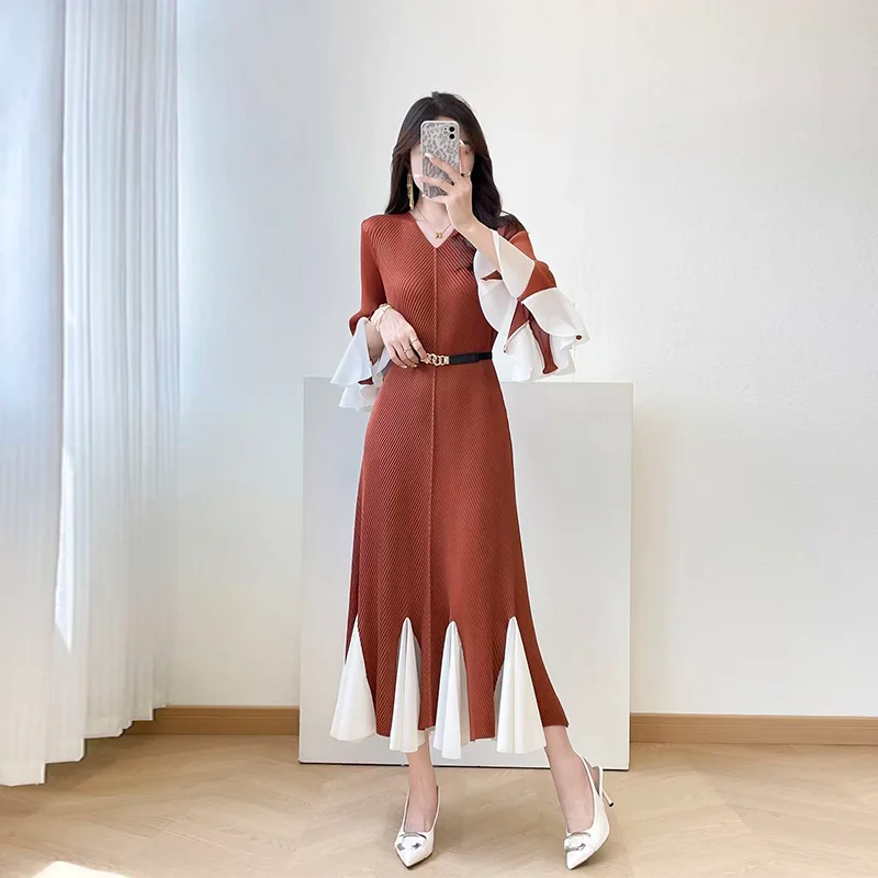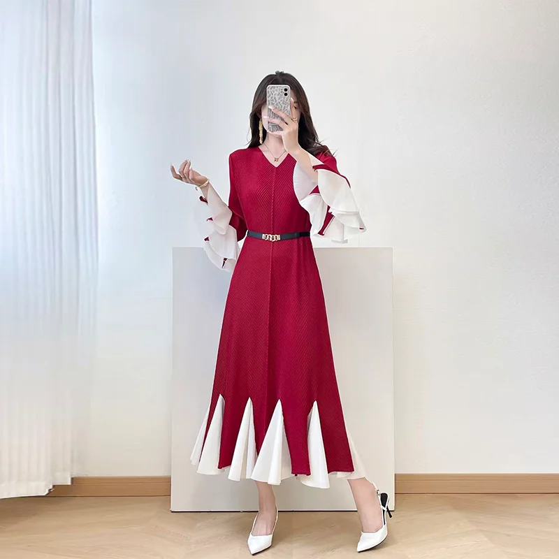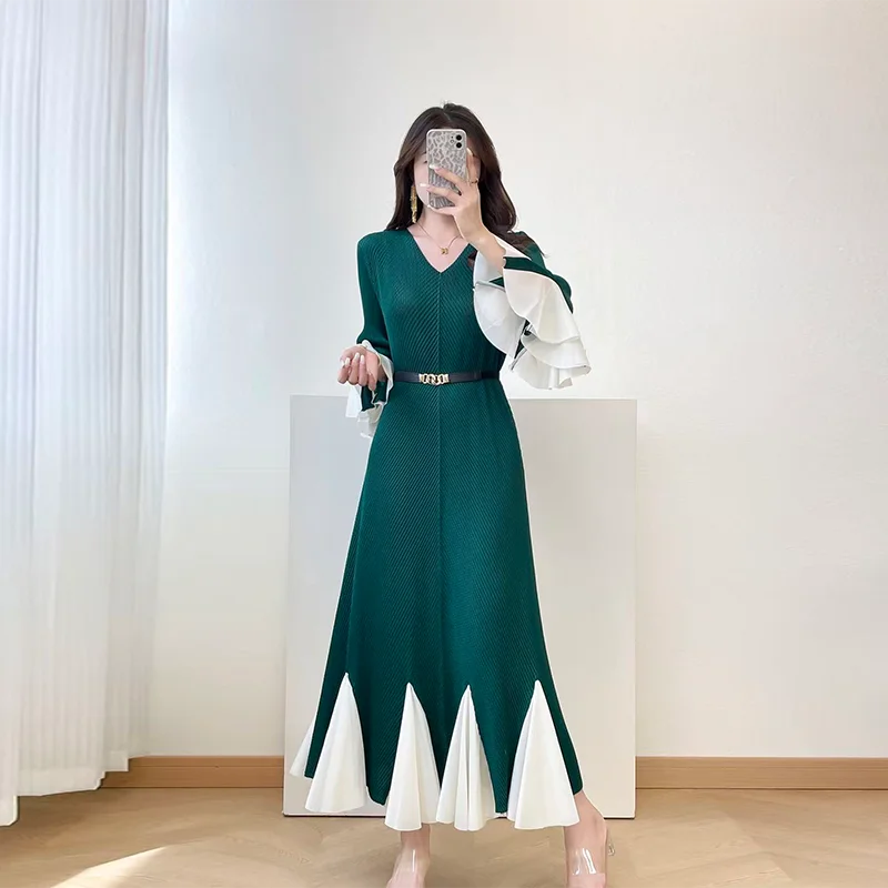 2025 Autumn New V-Neck French Retro Lazy Wind Metal Belt Petal Sleeve Pleated Waist Midi Slim Dress Casual Natural Waistline