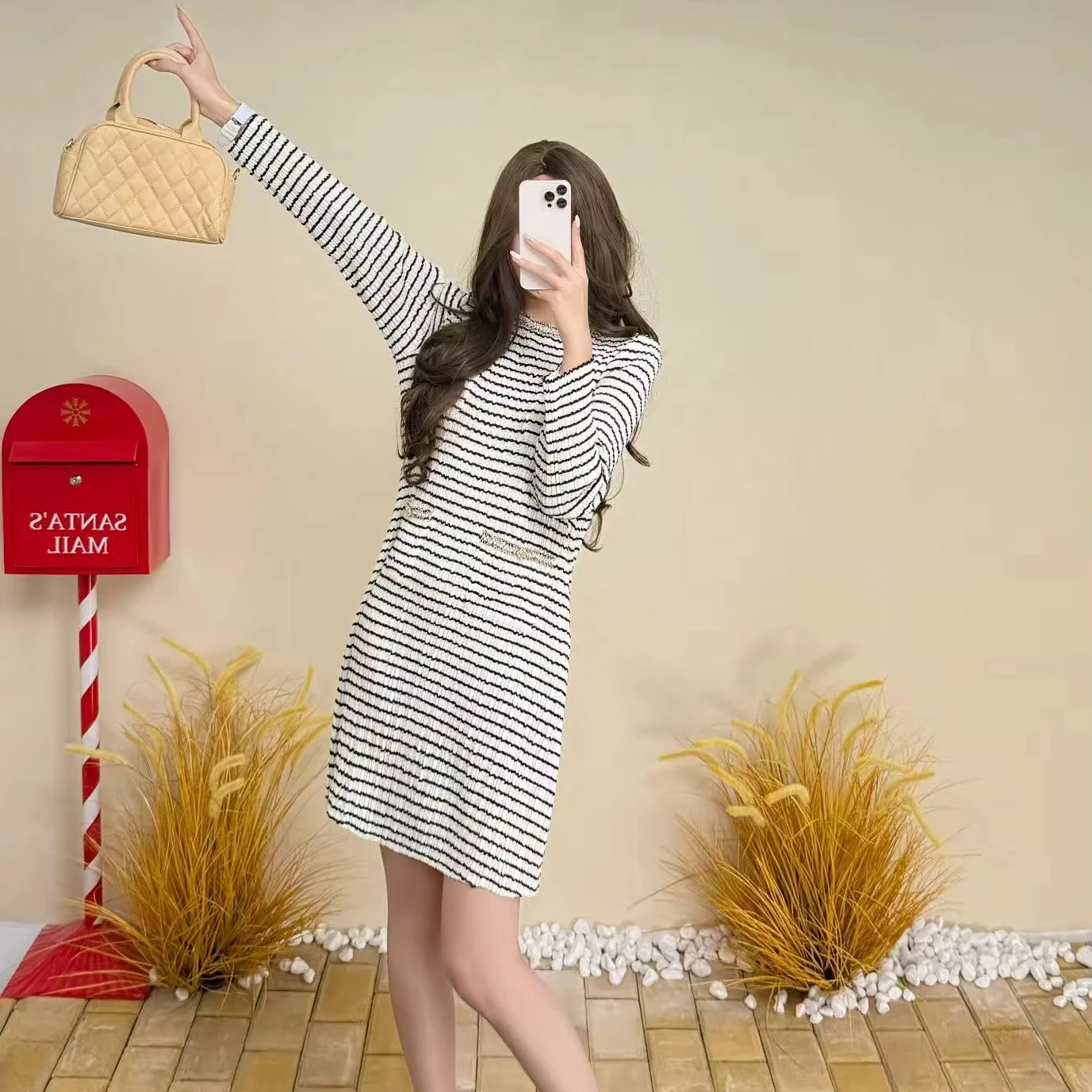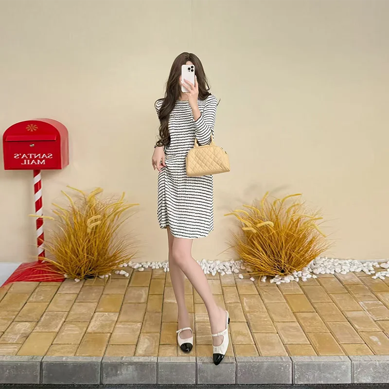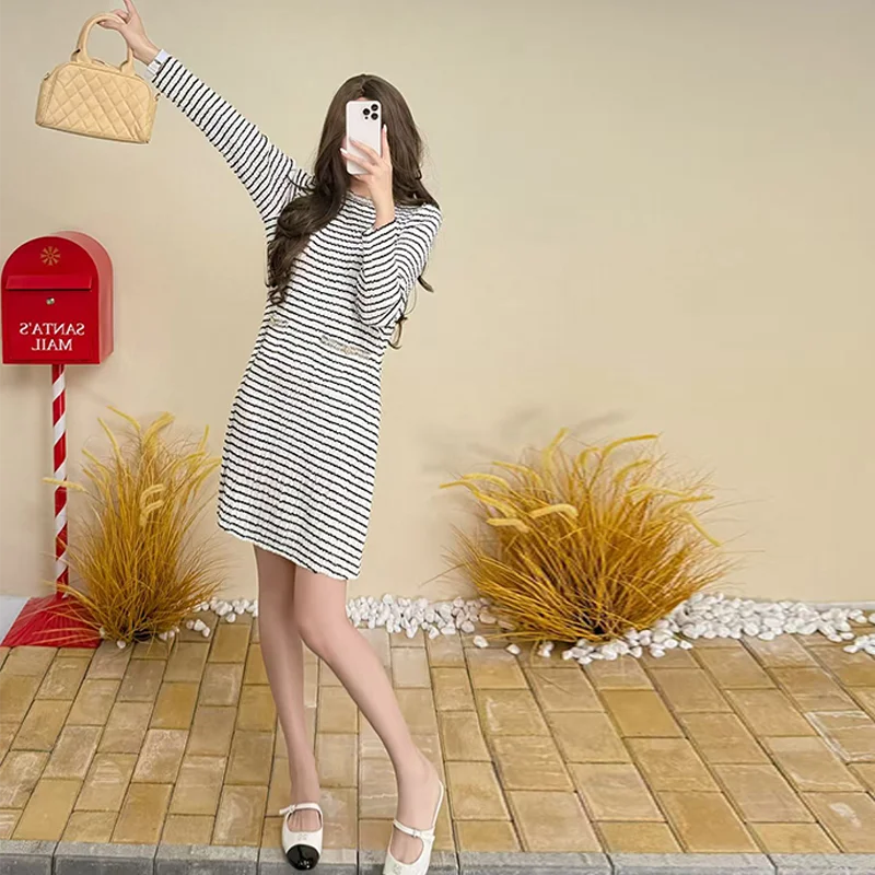 2025 Autumn Striped Casual Dress Daily Fashion Knee-Length with Pleated Round Neck and Long Sleeve Straight Tube Style