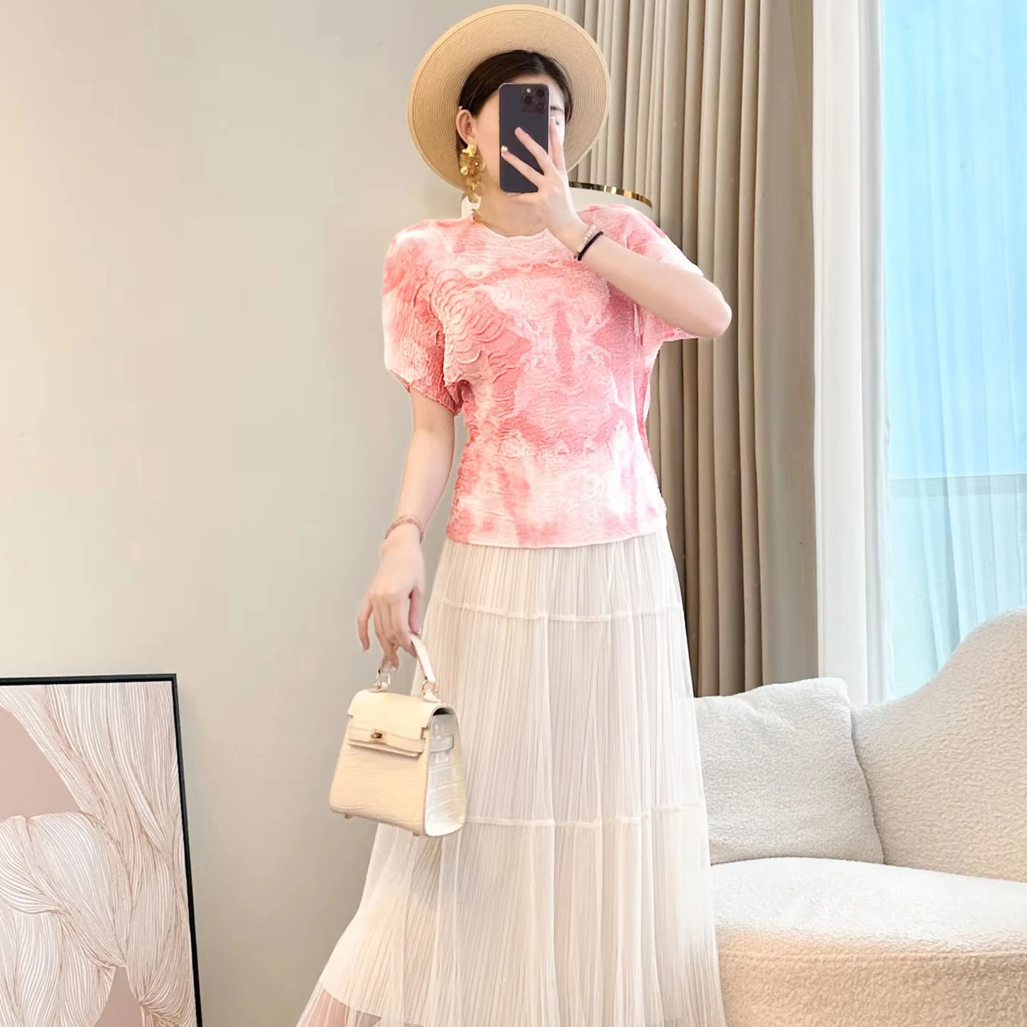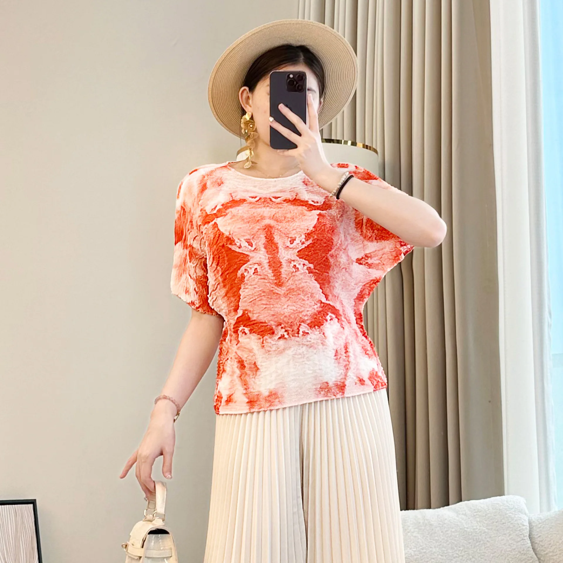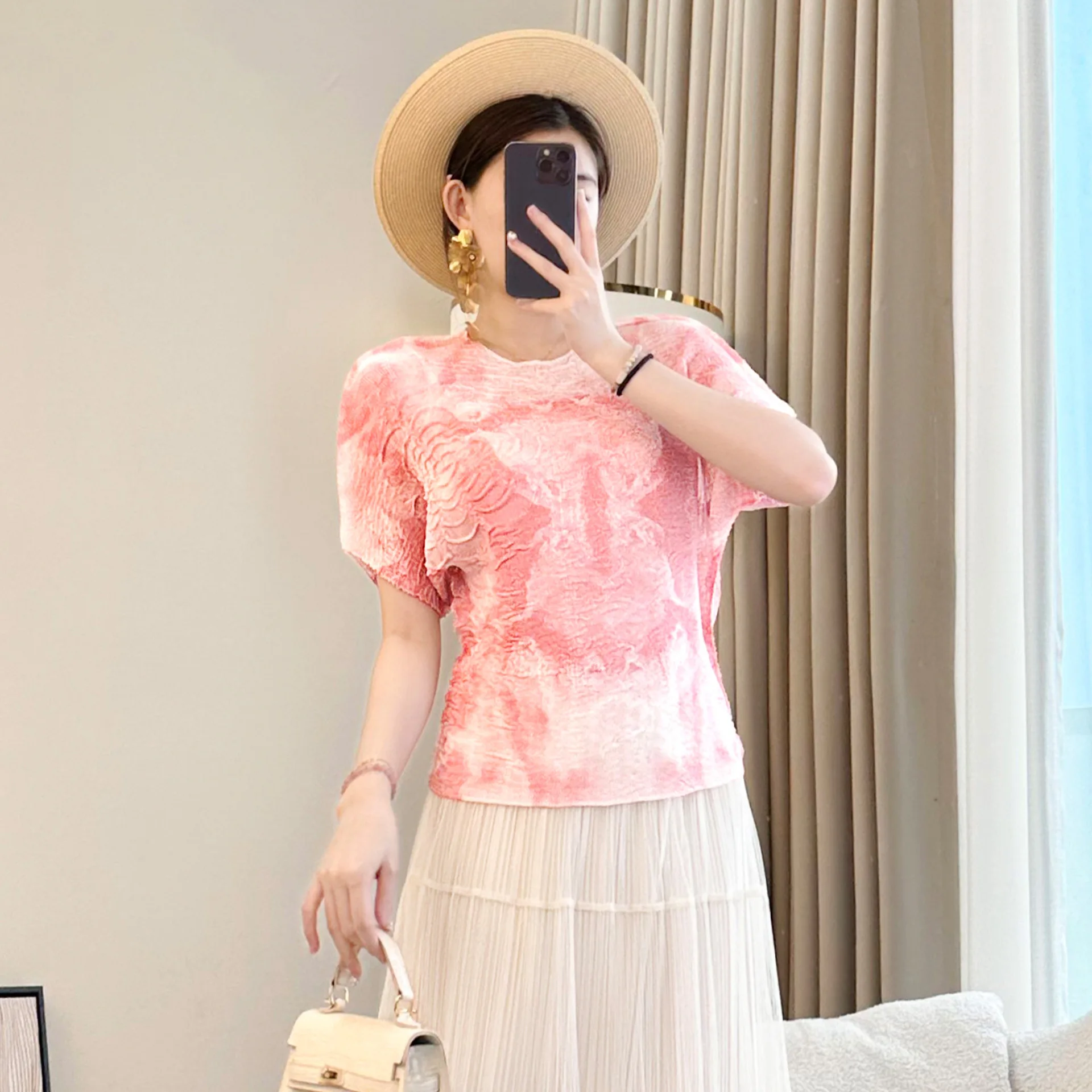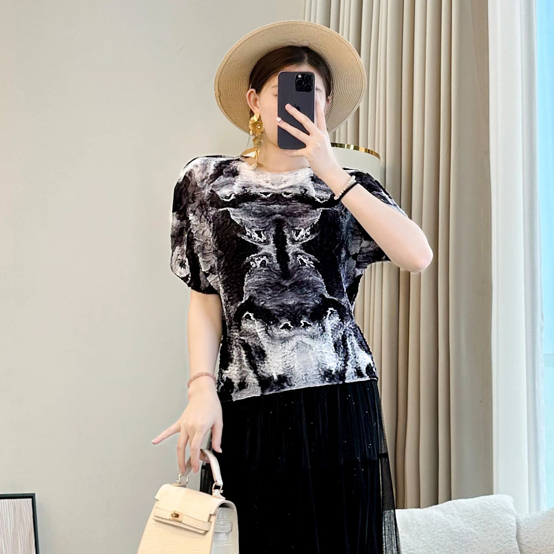 2025 Autumn Women's T-Shirt Printed Short Sleeve with Round Neck Pleated Slim Loose Tempered Commuter Thin T-Shirt
