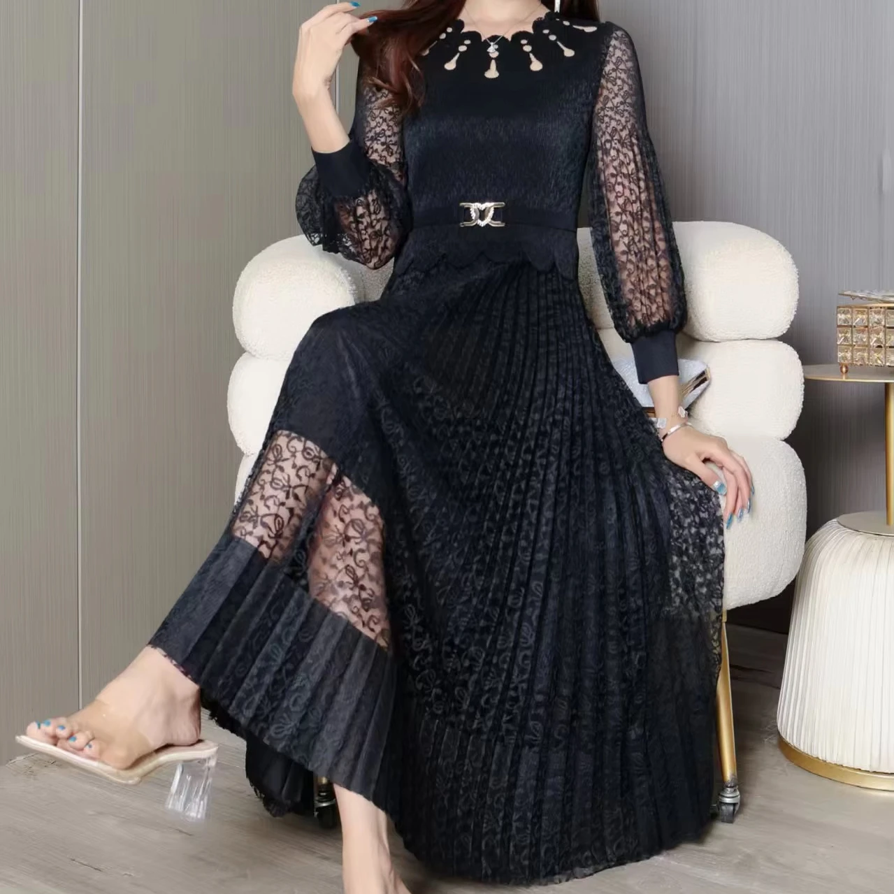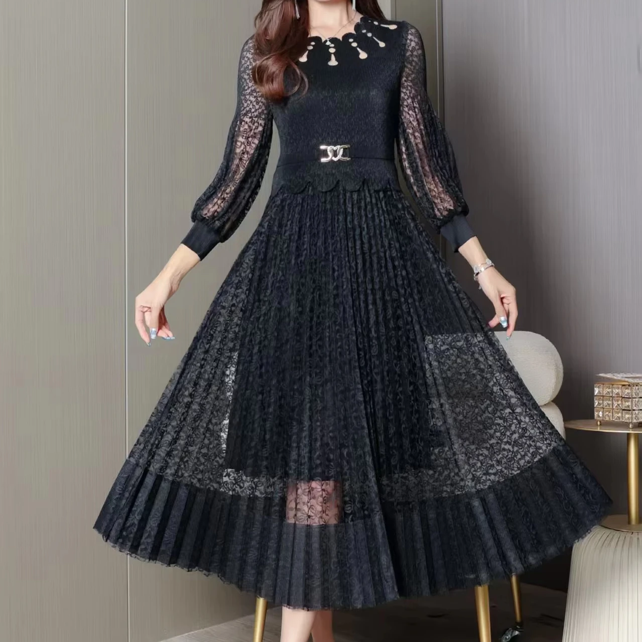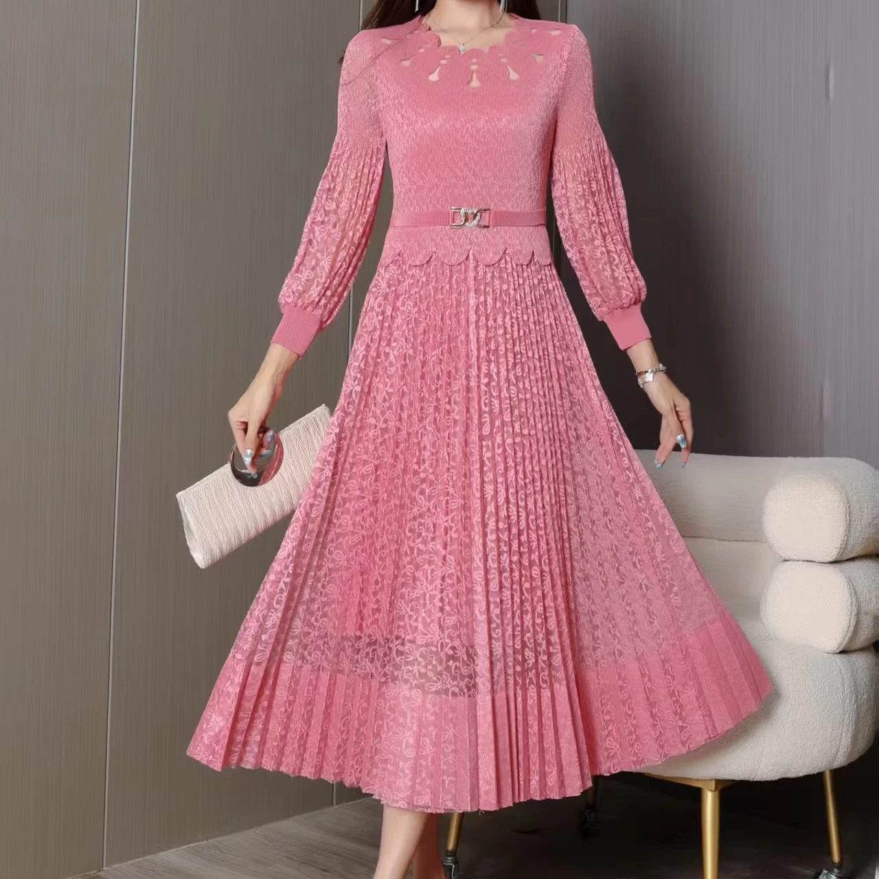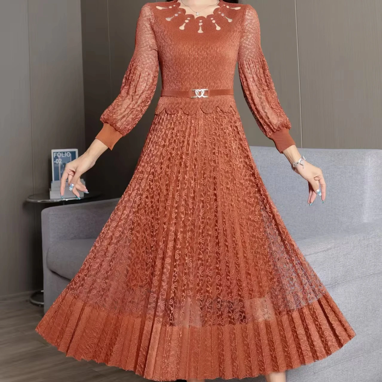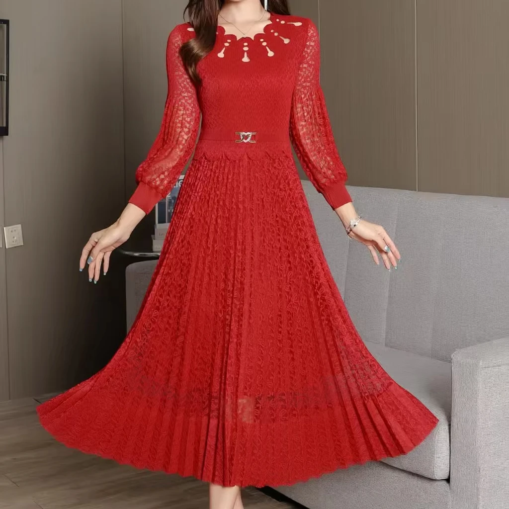 2025 Autumn Lady High Waist Long Sleeve Pleated Dress Floral Hollow Lace with Straight Tube Solid Color Casual Style