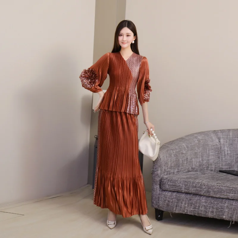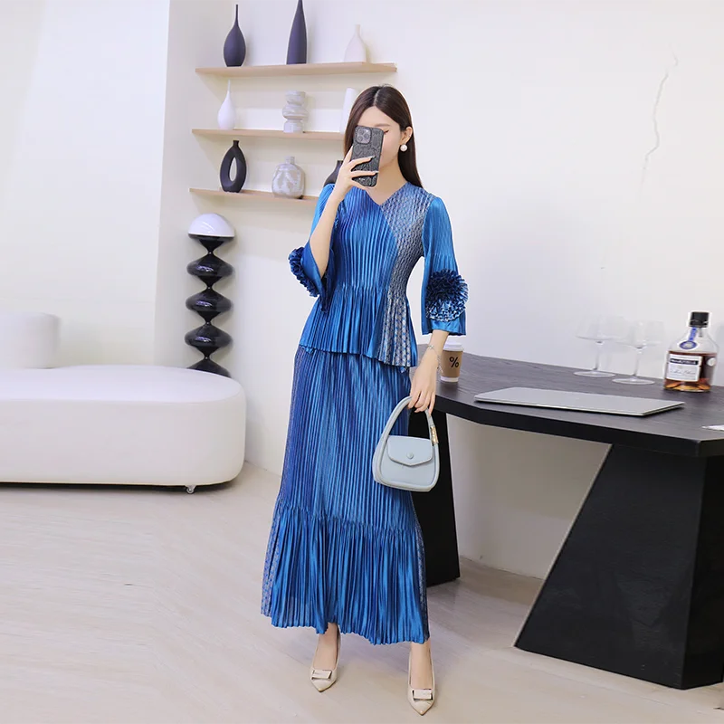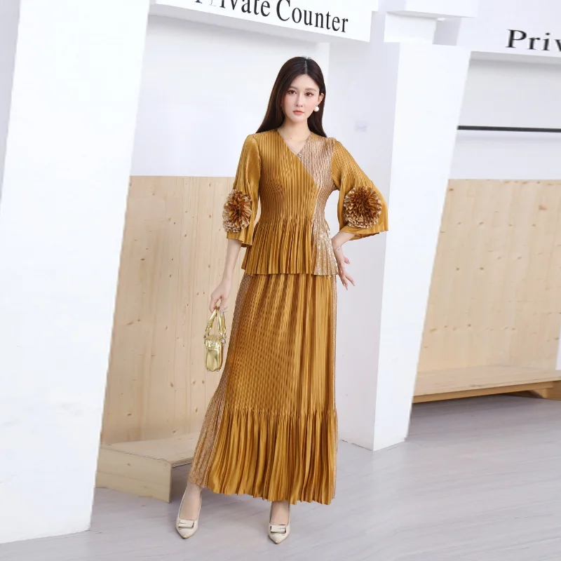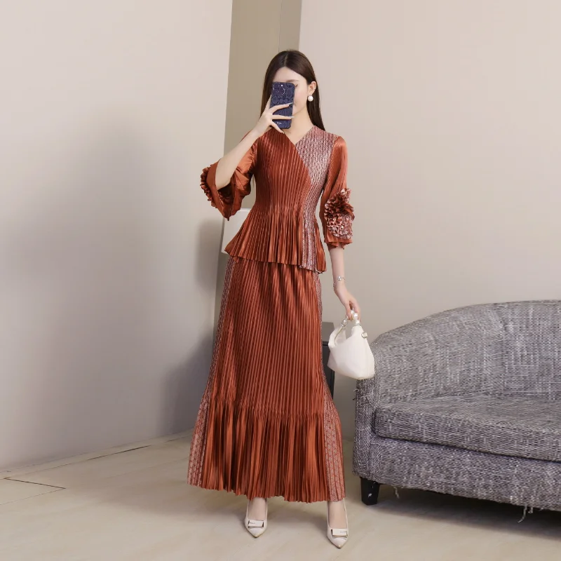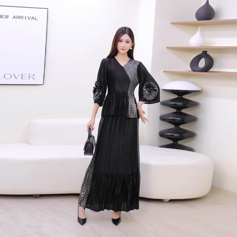 2025 Autumn Collection Women's Casual Spliced Color Dress Set V-Neck Seven-Point Sleeve Straight Tube Three-Dimensional Pleated