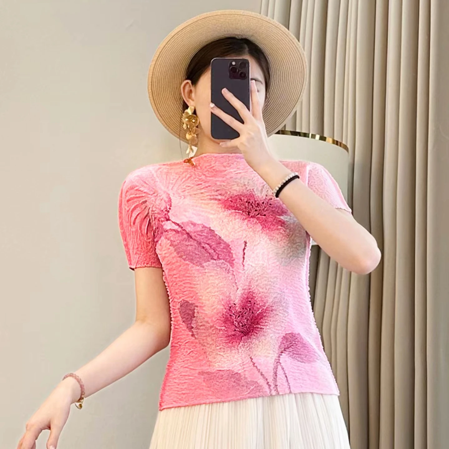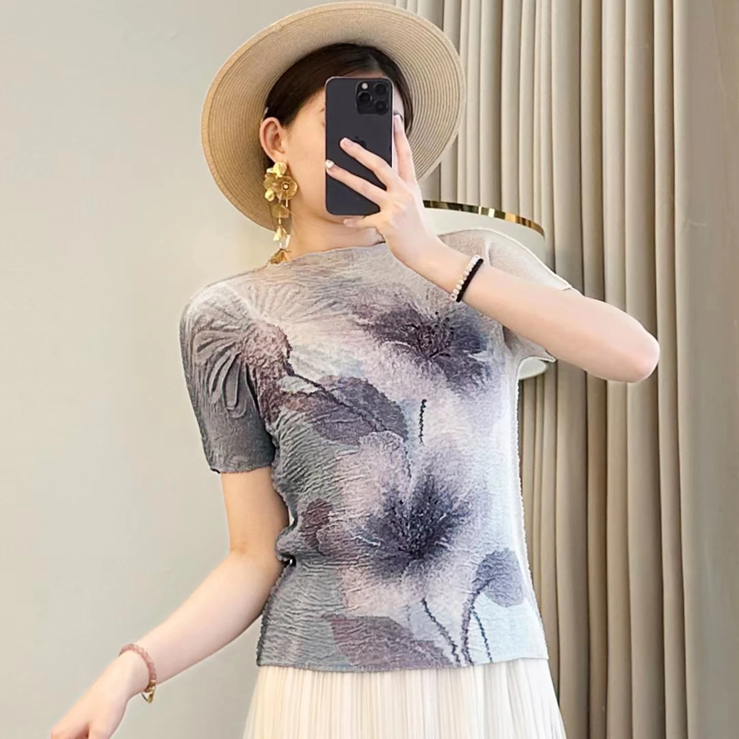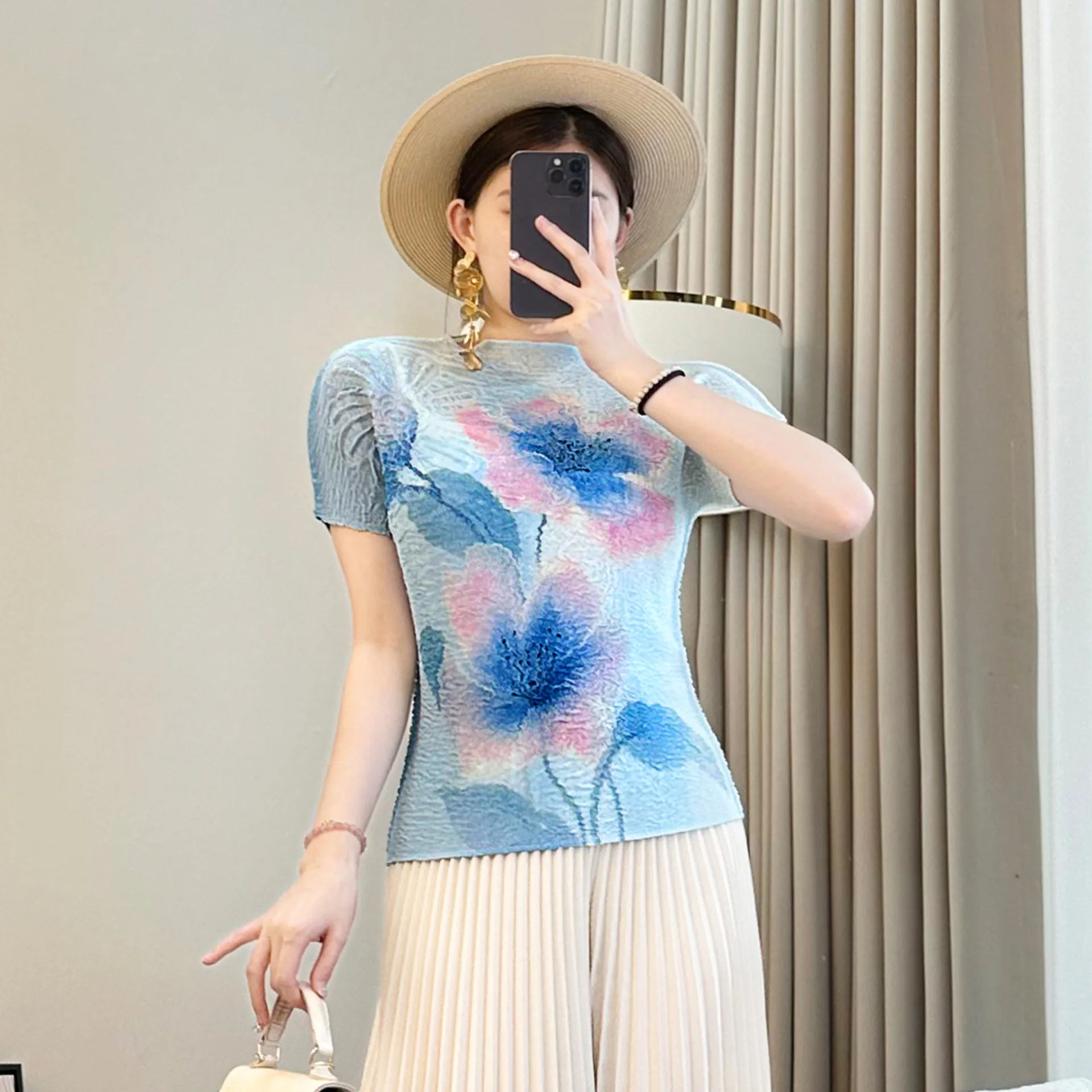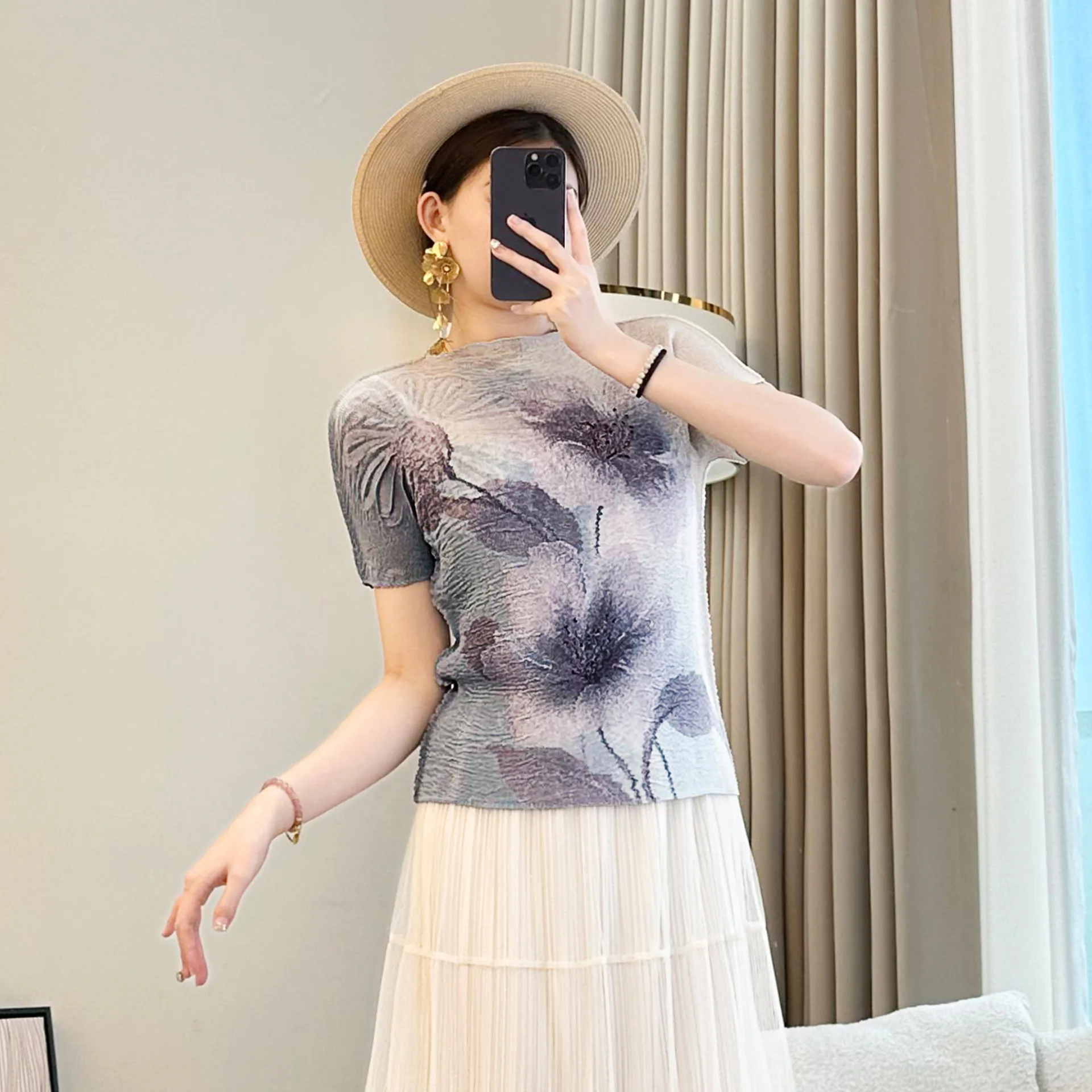 2025 Autumn Women's Breathable Printed Pleated Crew Neck T-Shirt Casual Short Sleeve Slim Solid Color Design Made Knitted Fabric