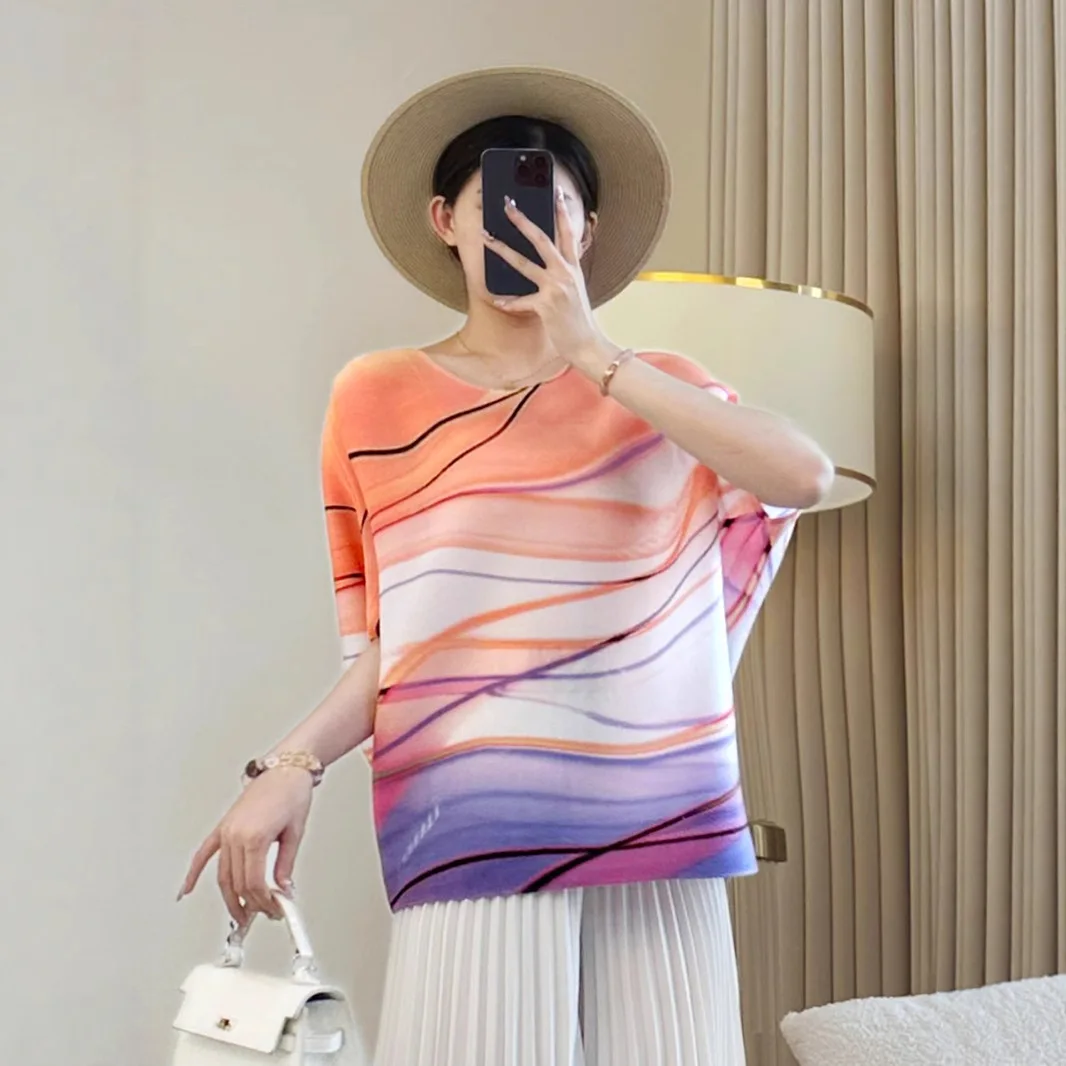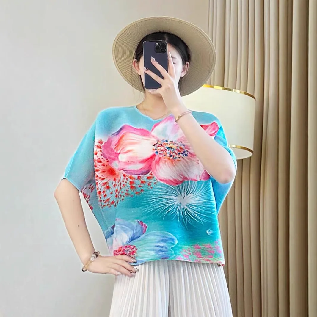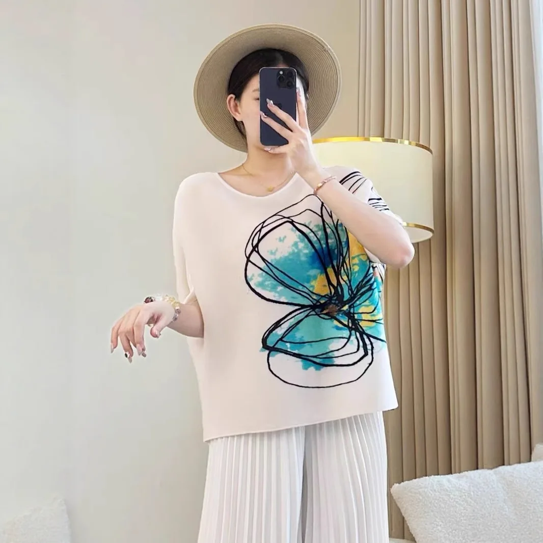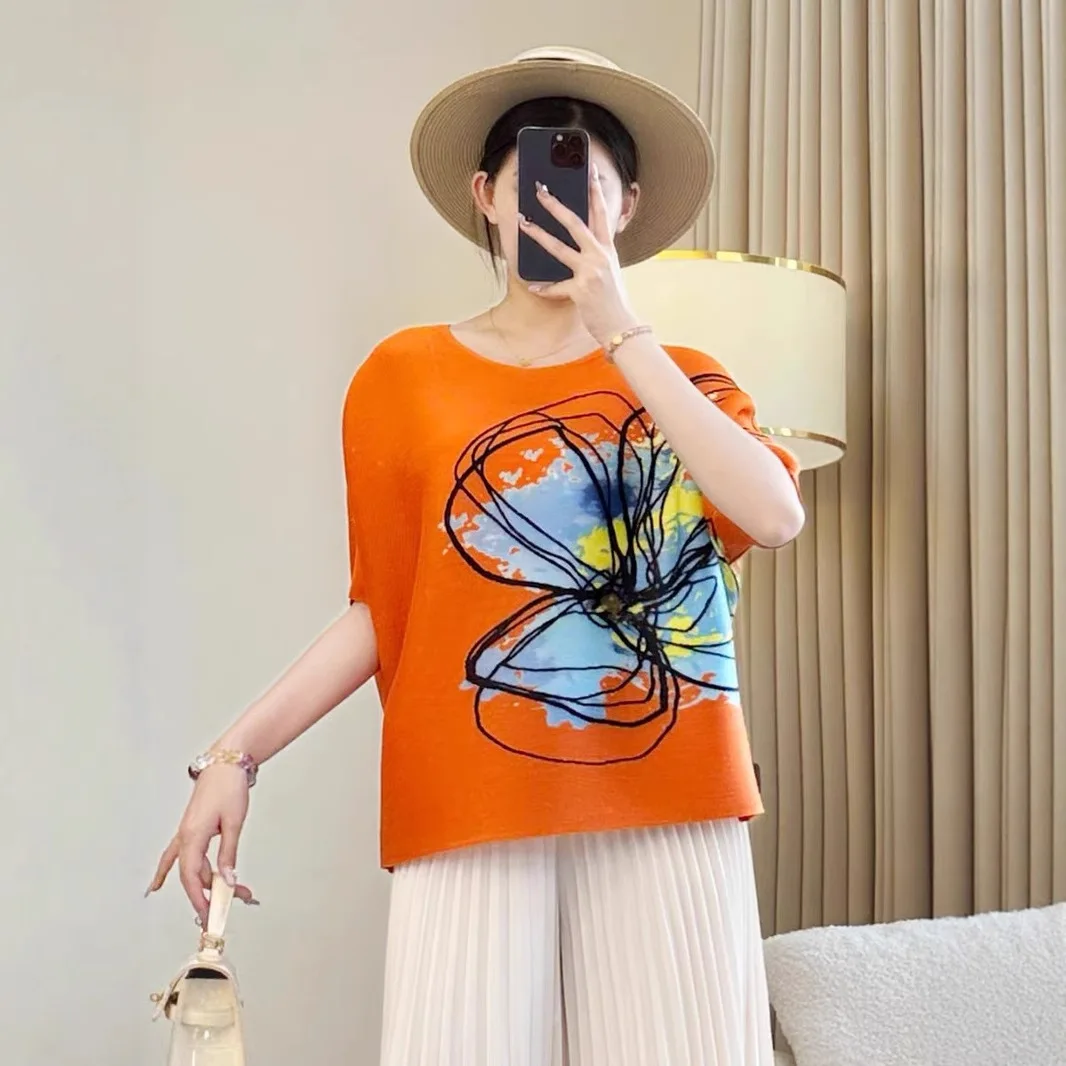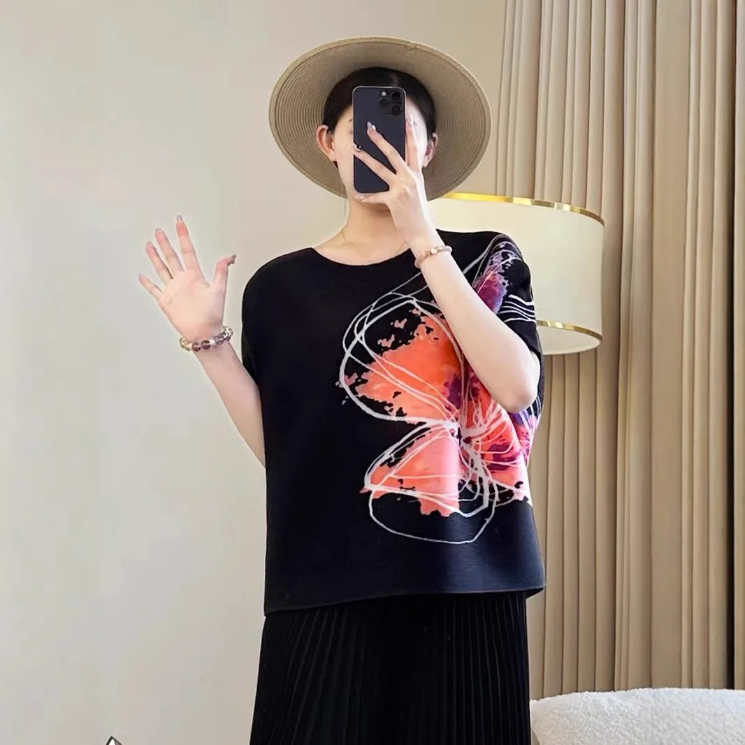 2025 Autumn Collection Women's Slim T-Shirt with Round Neck Printed Joker and Loose Pleated Design Foreign Style Meat T-Shirt