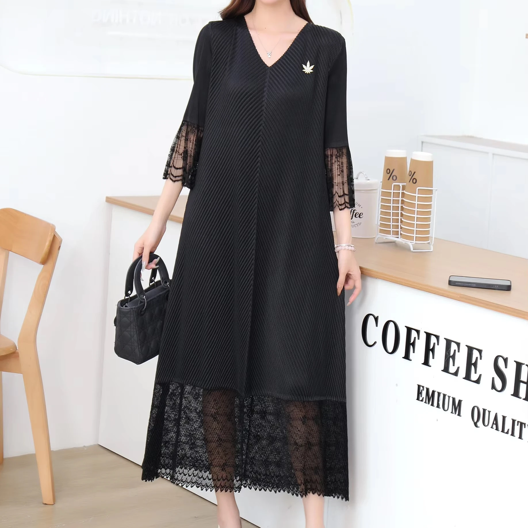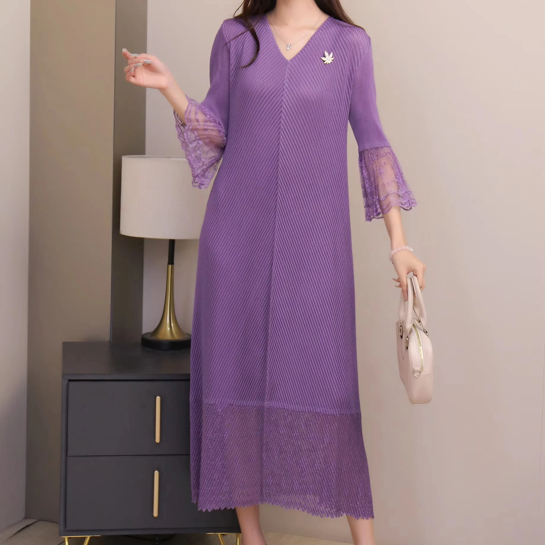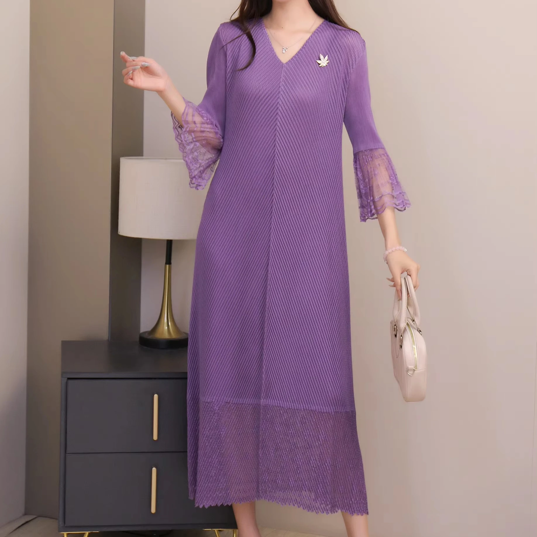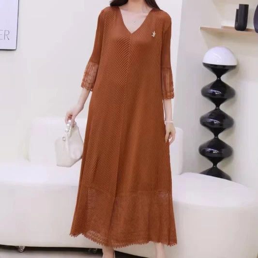 2025 Autumn Solid Color Pleated V-Neck Midi Shift Long Sleeve Casual Shift Natural Waist Breathable Anti-Wrinkle Summer Banquets
