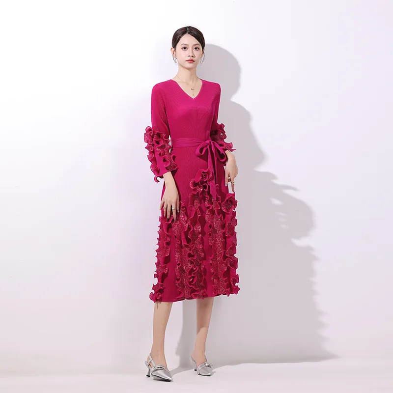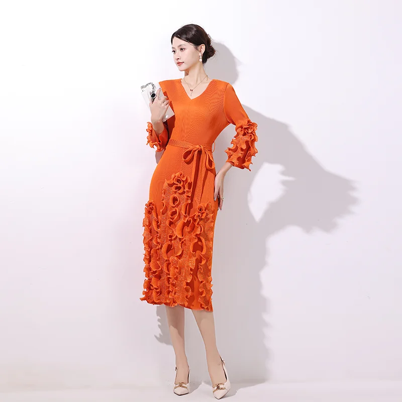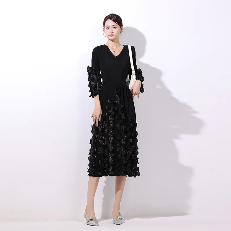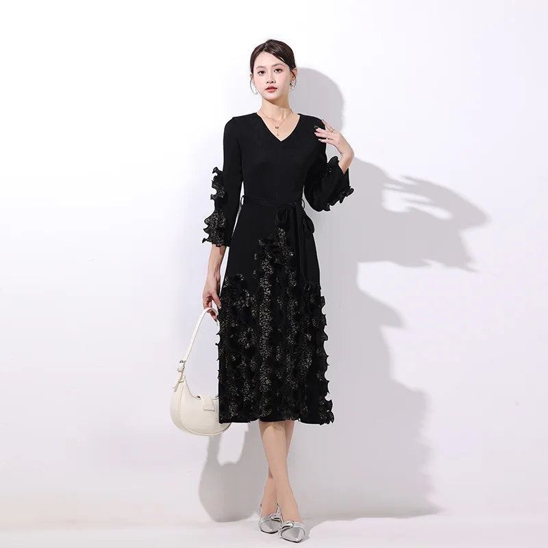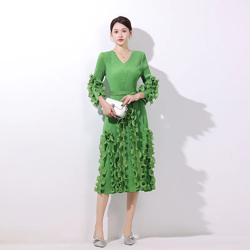 2025 Autumn Casual Dress with Solid Color V-Neck Lace-up Pleated Design Gilded Straight Sleeves