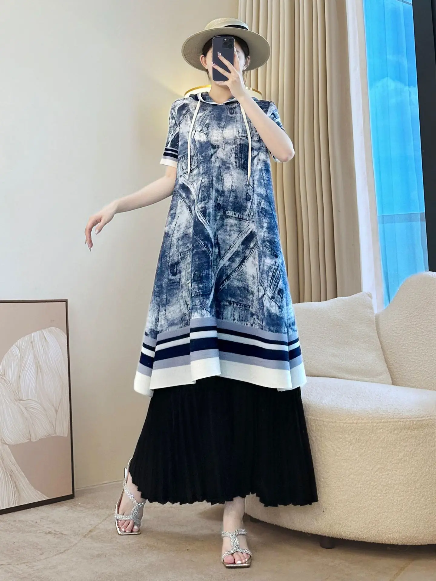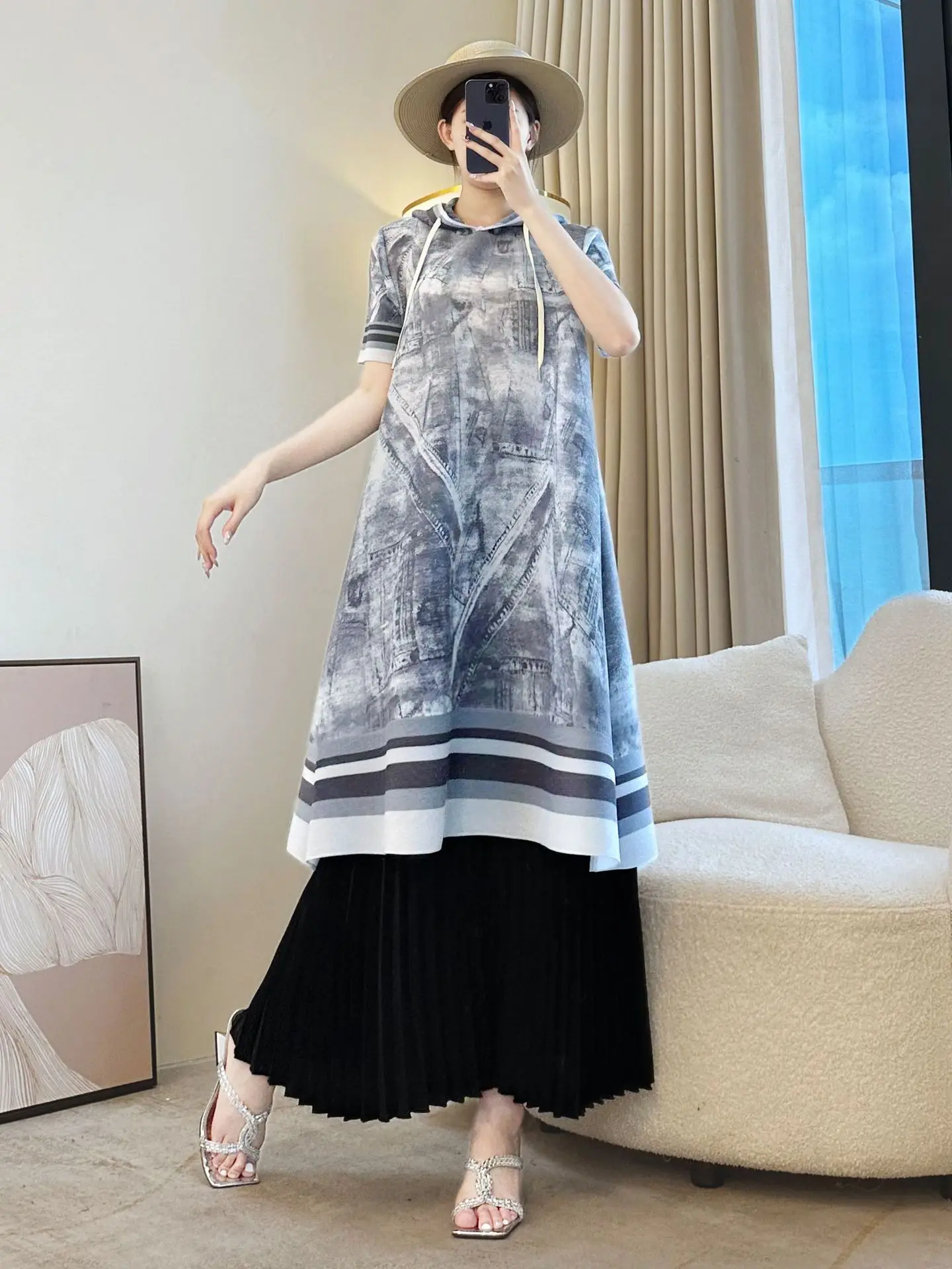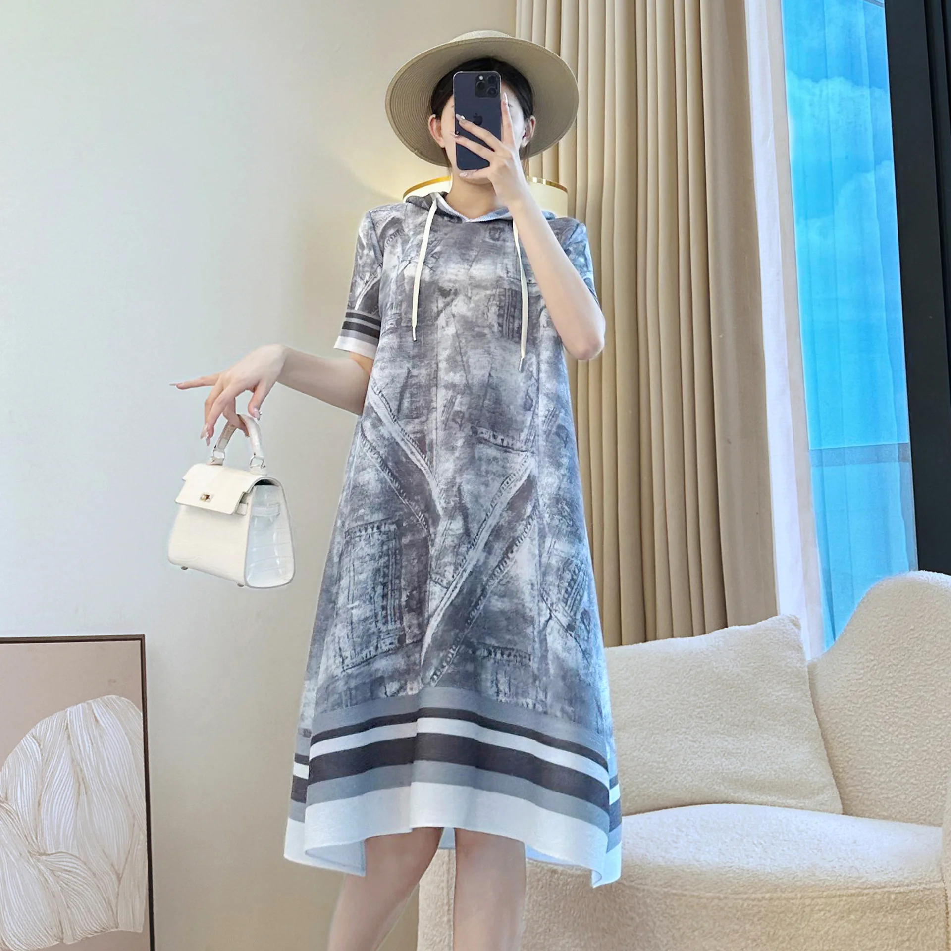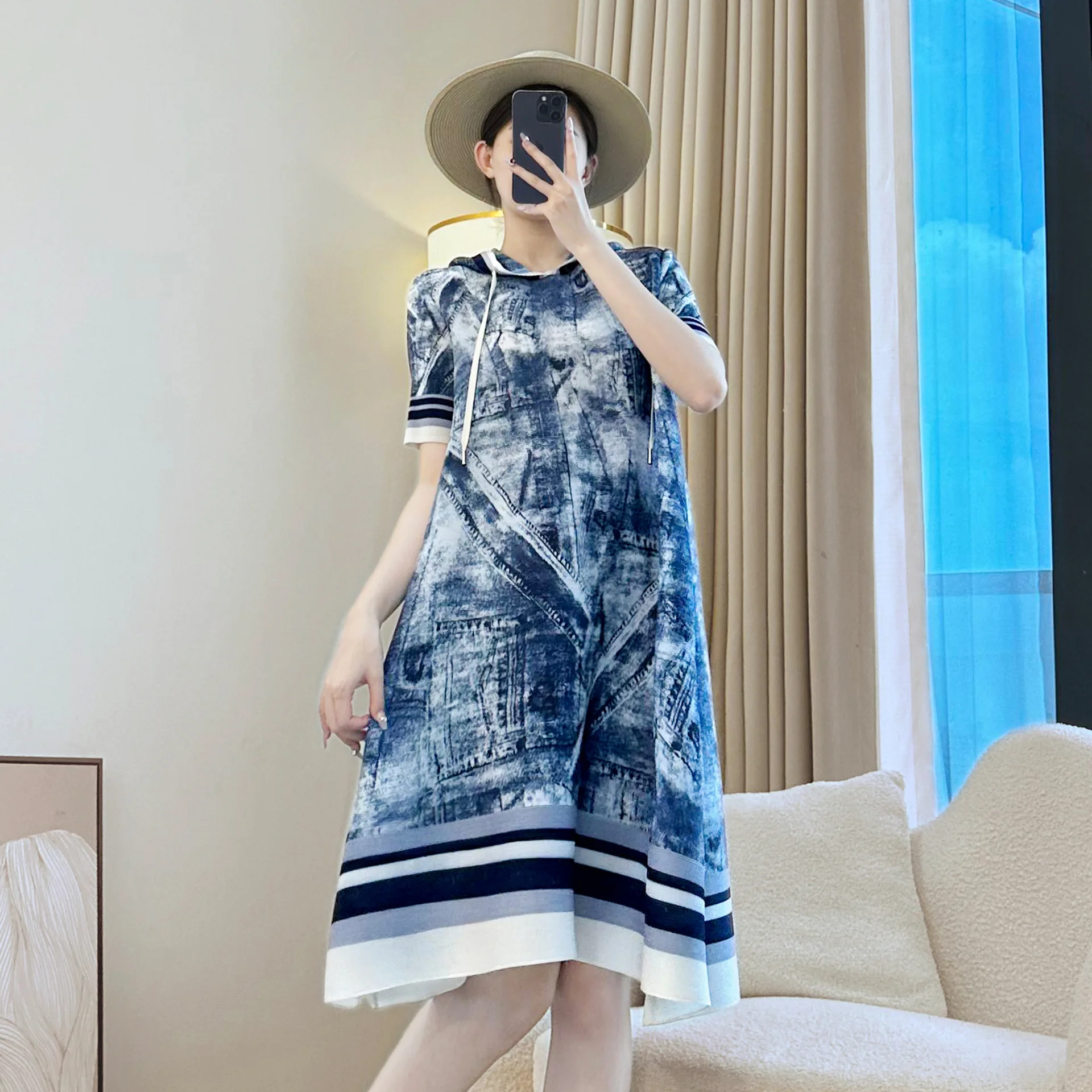 2025 Autumn Casual Dress with Short Sleeve Pullover Drawstring Hood Straight Cut Printed Design