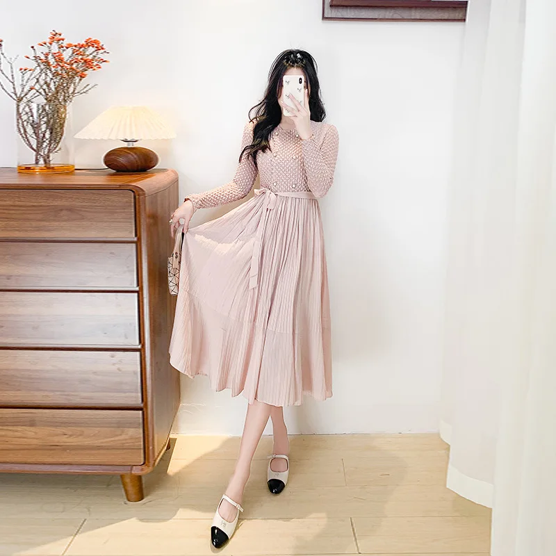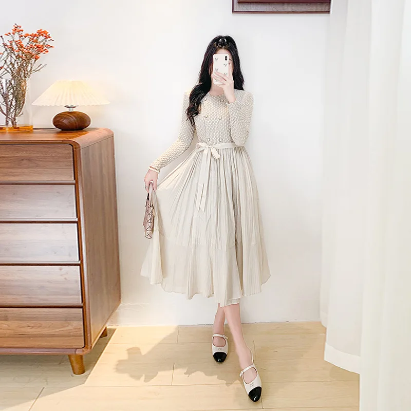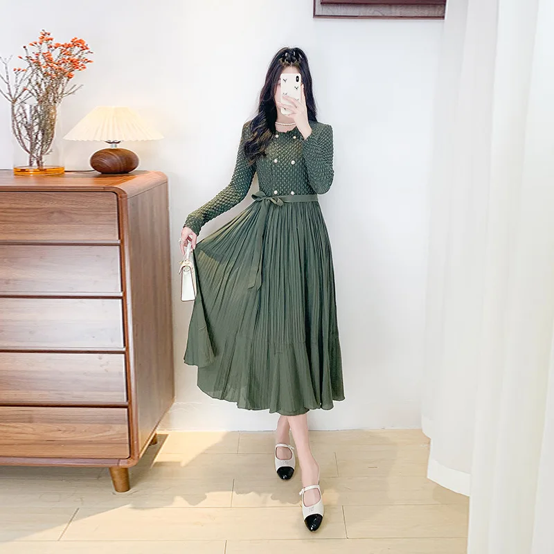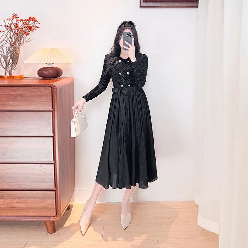 Vintage A-Character Waist Pleated Dress Slim Knee-Length Crewneck Long Sleeve Solid Color Double Row Button Casual Spring