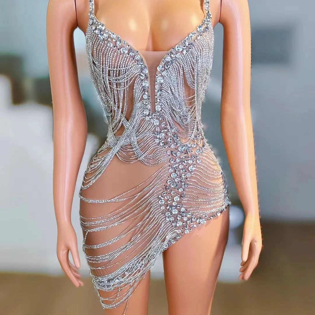 AD1700 Romper Tassels Diamond Dress Women Crystal Sexy Fashion Diamond Mesh Women Party Sleeveless