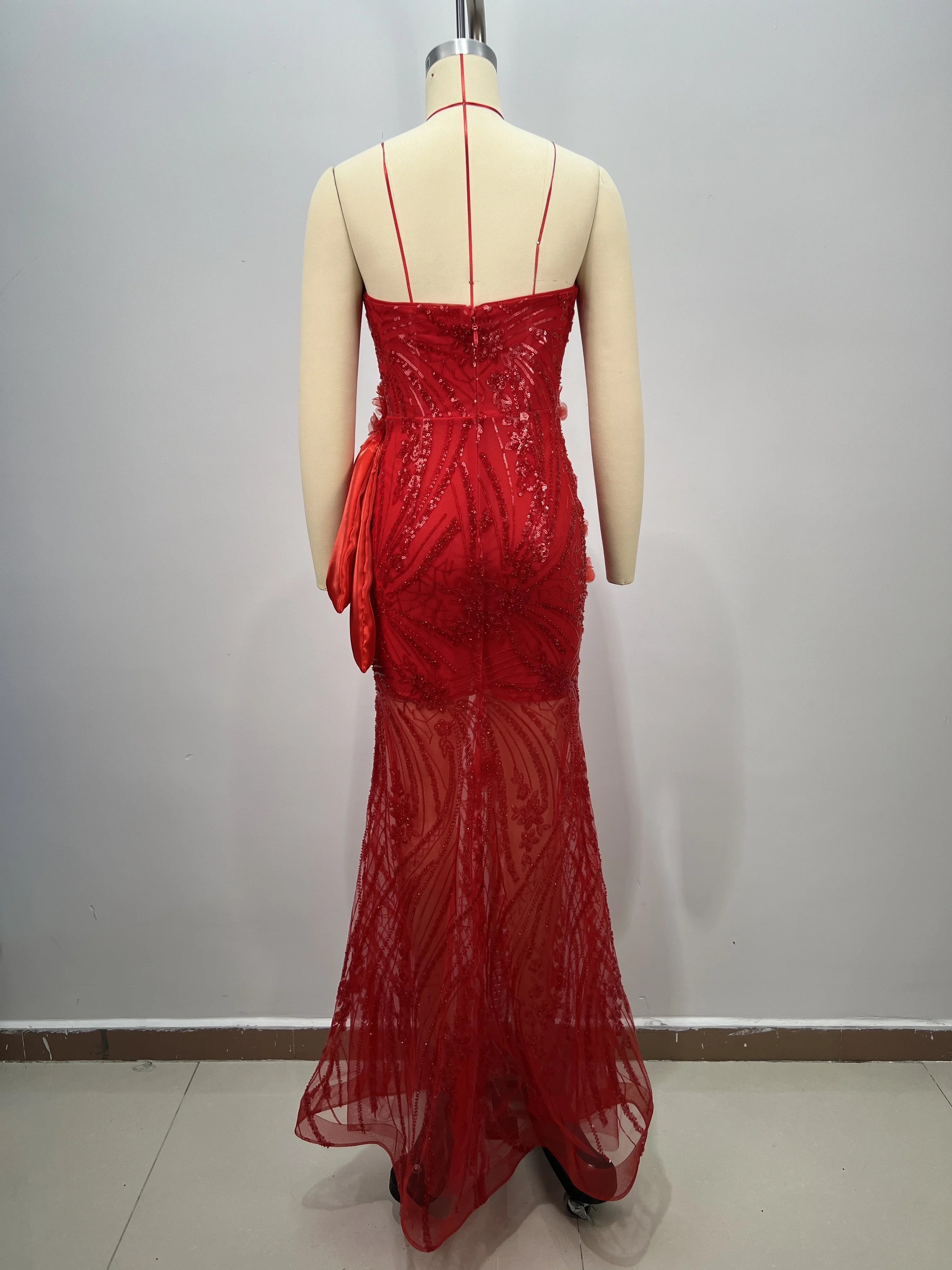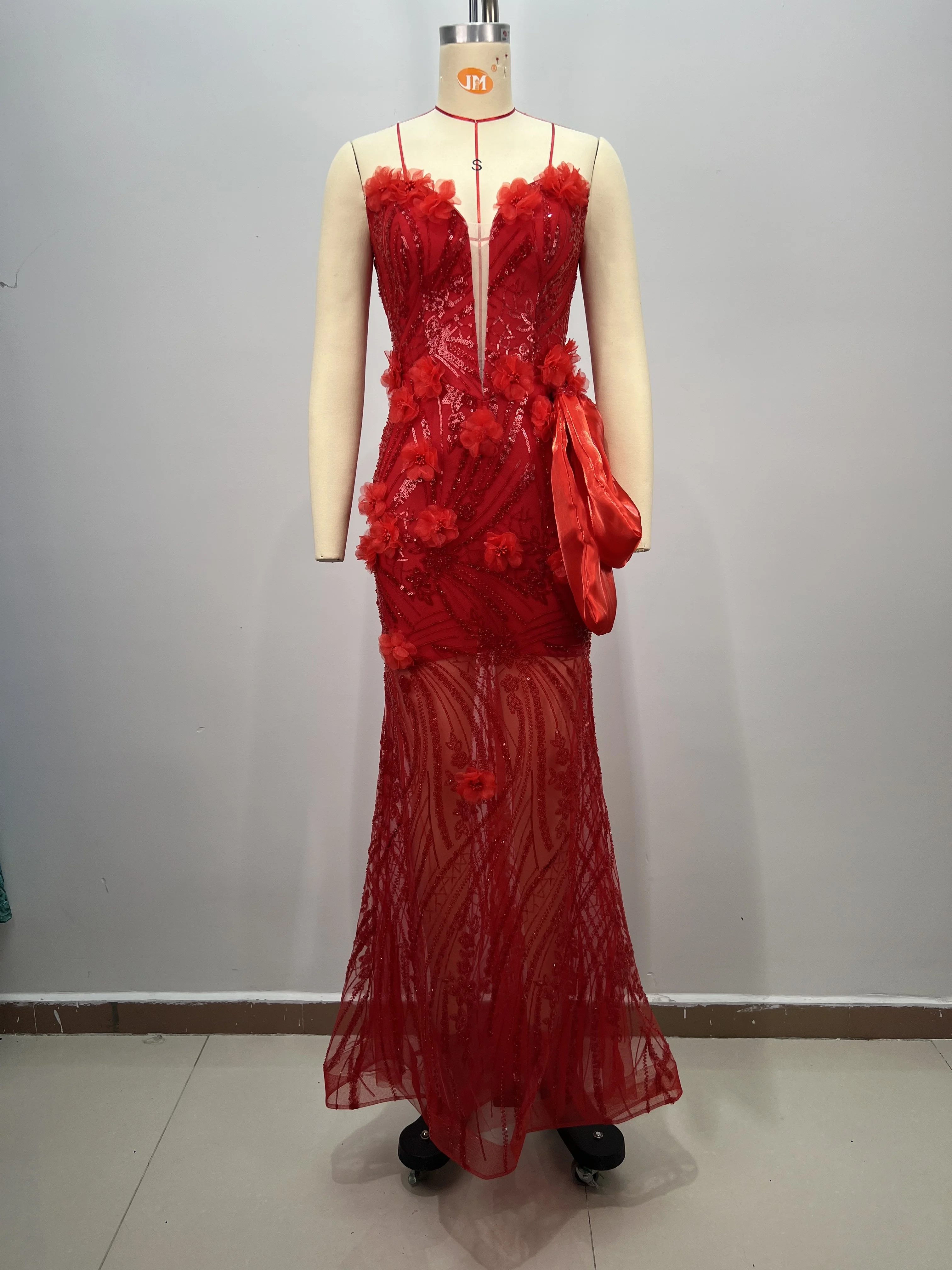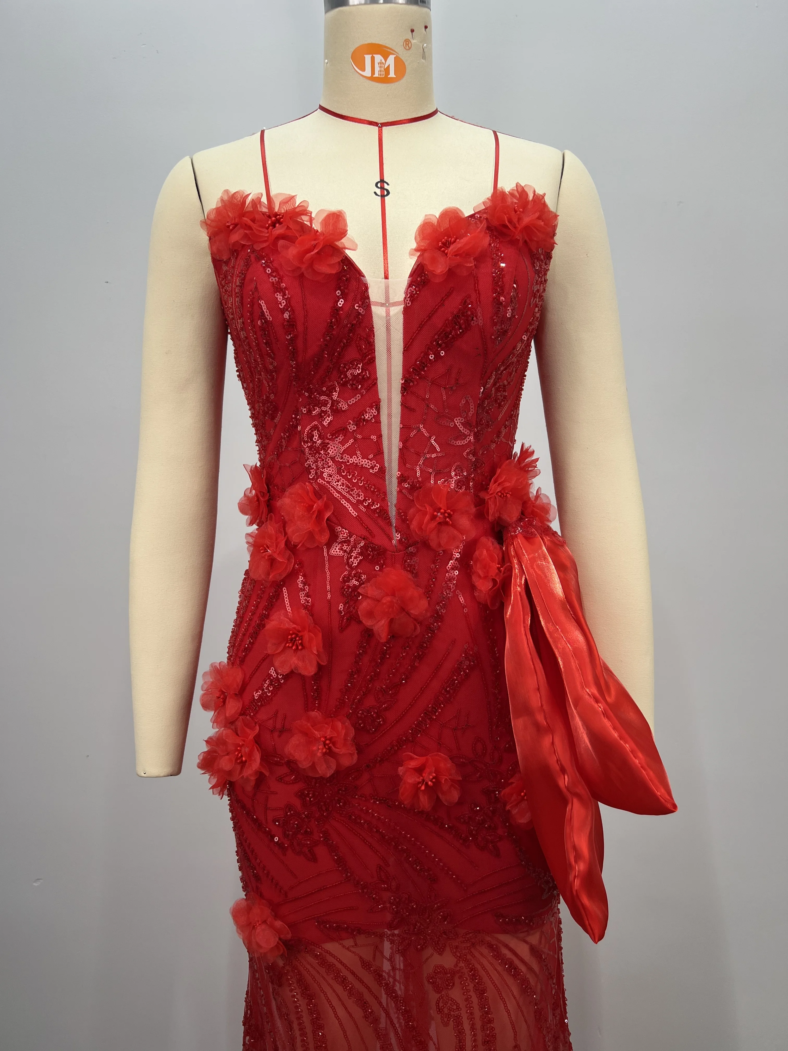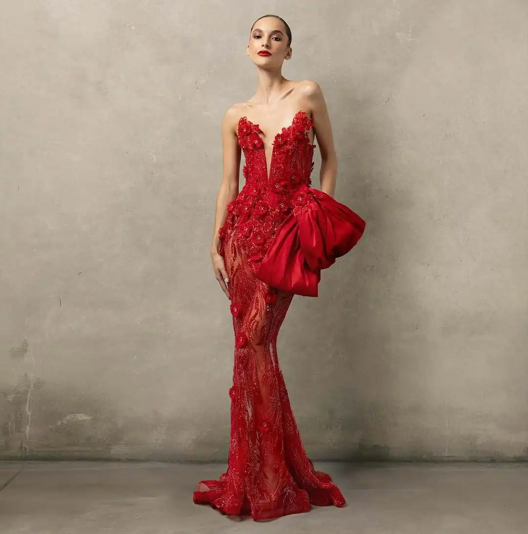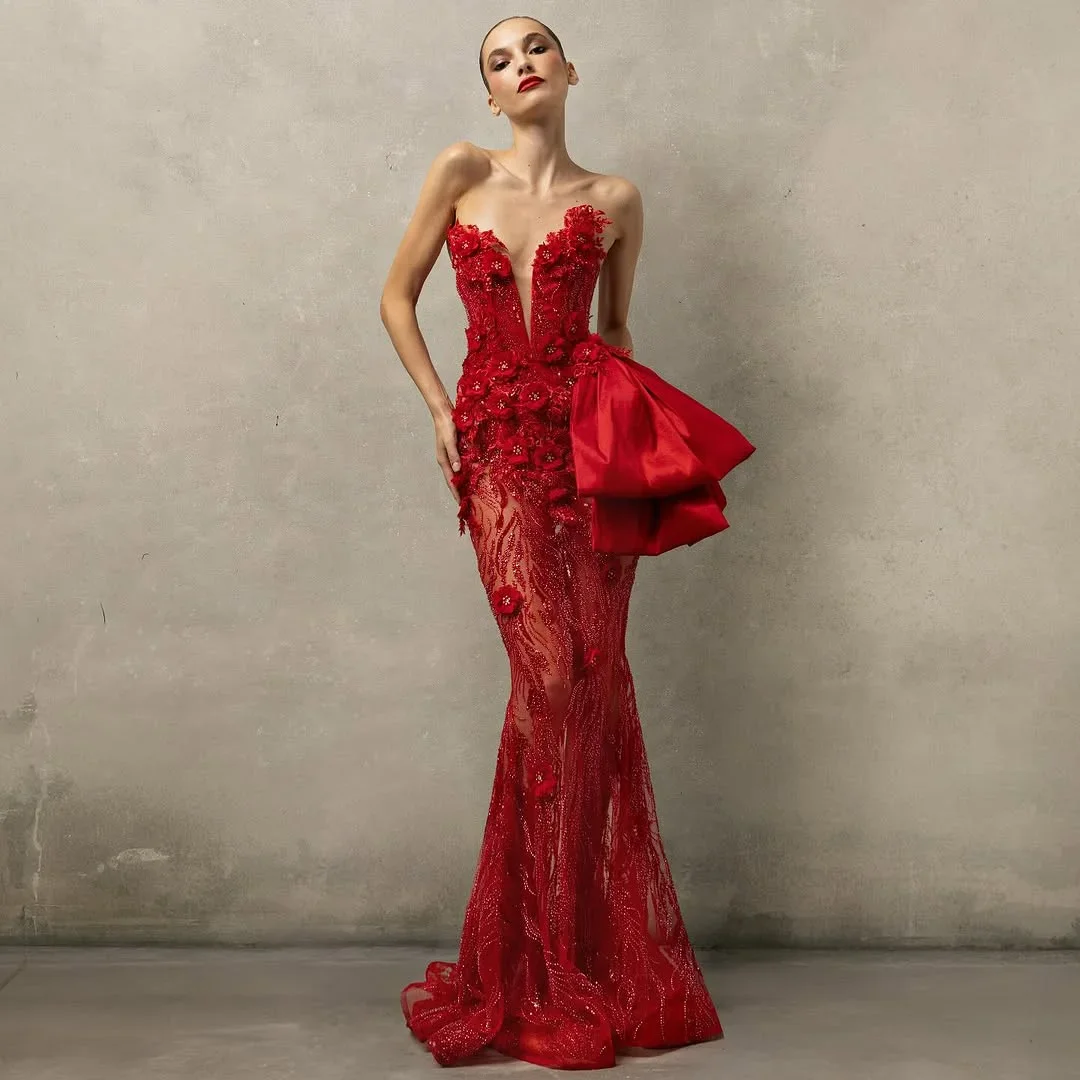ED2825 Women Strapless Red Evening Dress Deep V Neck Sexy Sequin 3D Floral Embellishments Romantic Satin Bow Bodycon Ball Gown