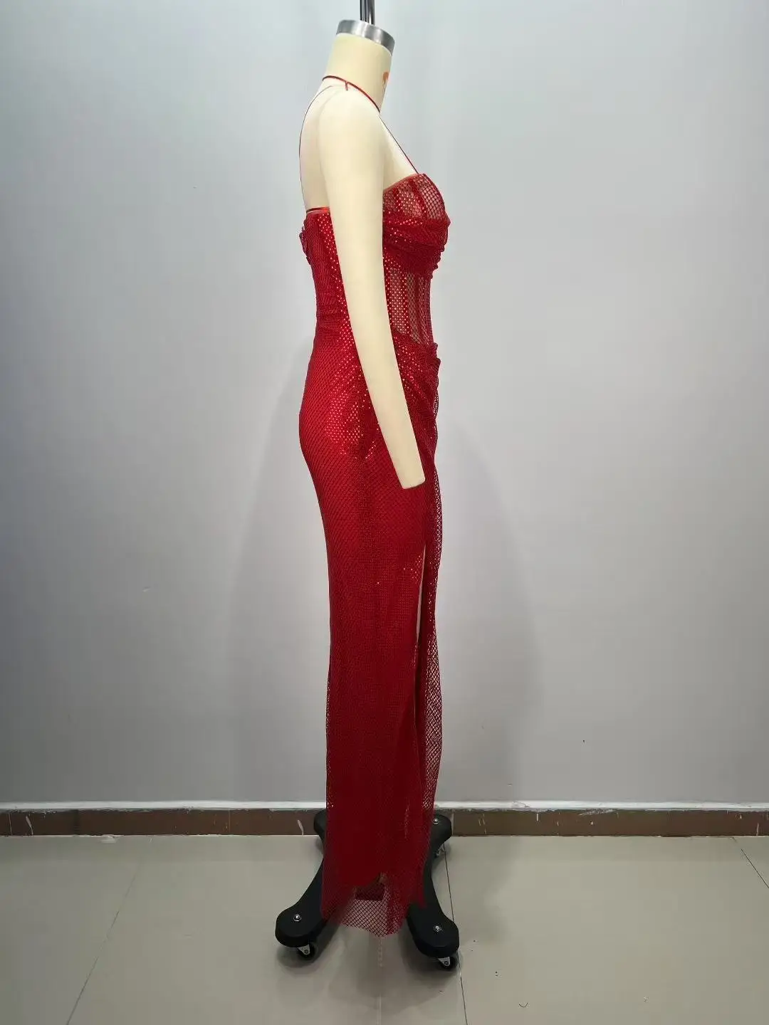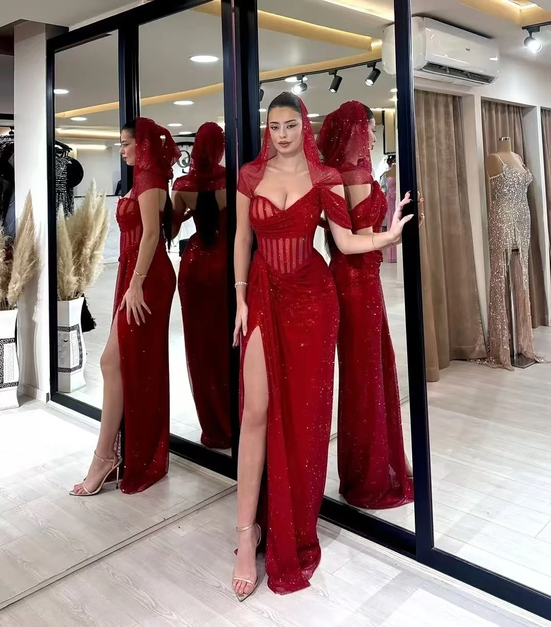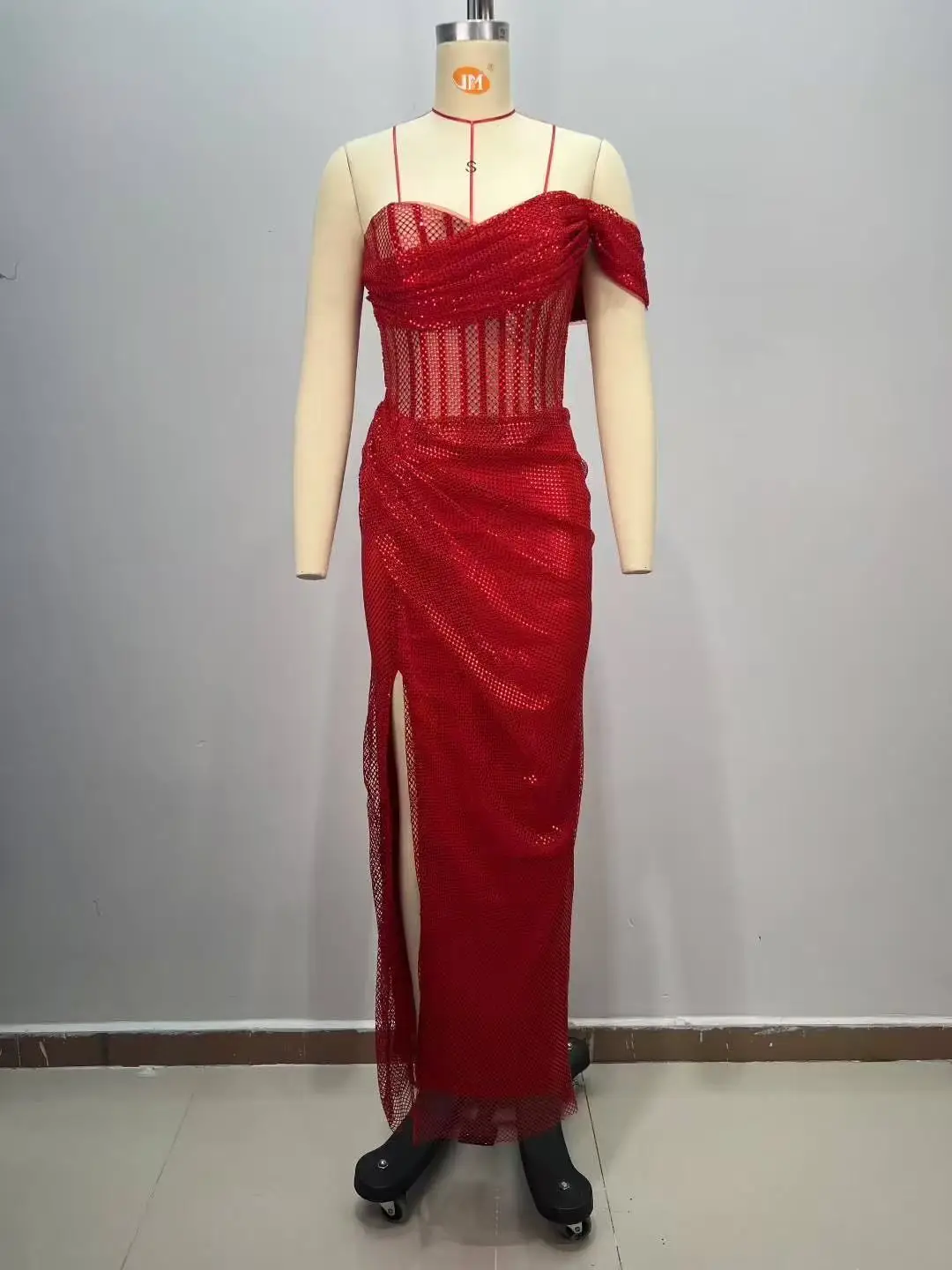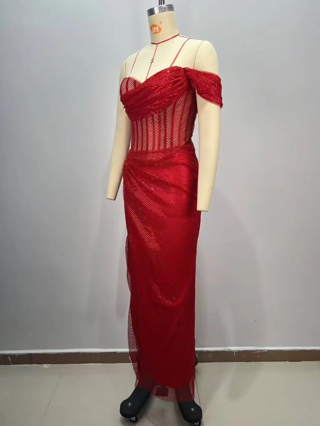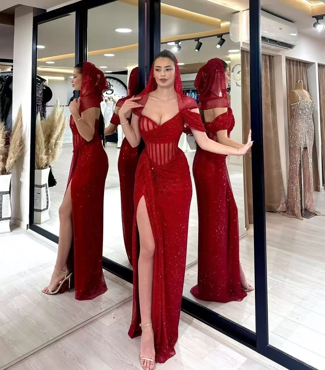 ED2829 Women's Elegant Evening Party Dress Sexy Summer Strapless Red Long Dress Beading Prom Dress for Lady with High Split